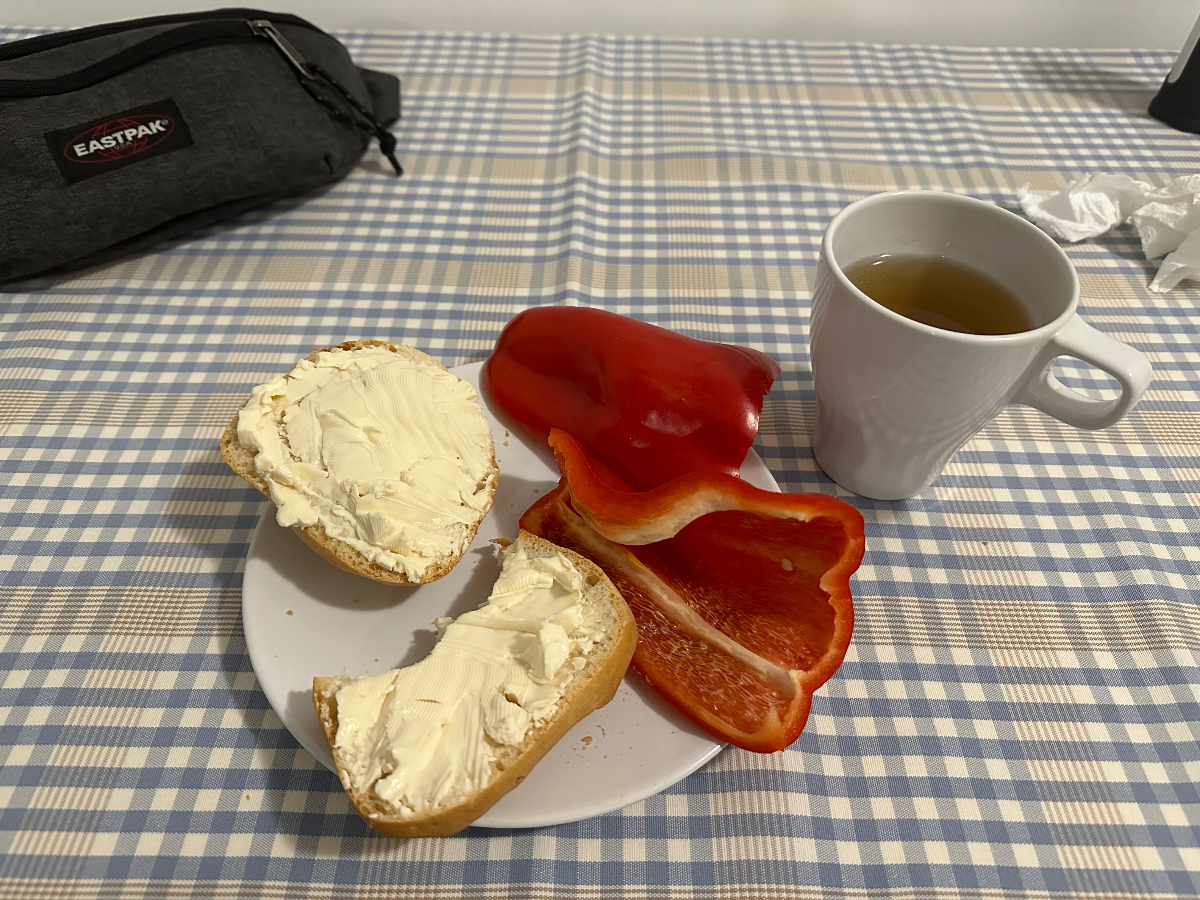 Gestern habe ich mich im Supermarkt noch mit essbarem versorgt, somit war mein Abendessen und das Frühstück gesichert. Am Abend gab es Emmer mit Gemüse, sehr lecker, dazu eine Dose Bier, genossen im Freien bei angenehmen Temperaturen, bis mich die Gelsen in das Haus trieben. Heute Brot mit Käse und Paprika, dazu Tee. Satt und zufrieden :-)