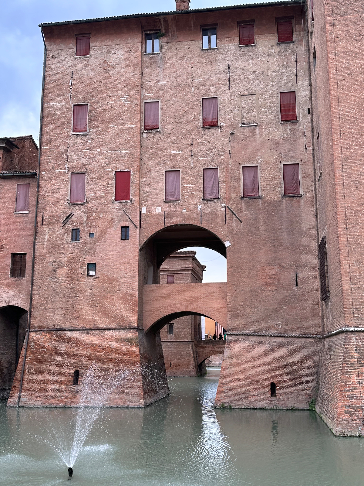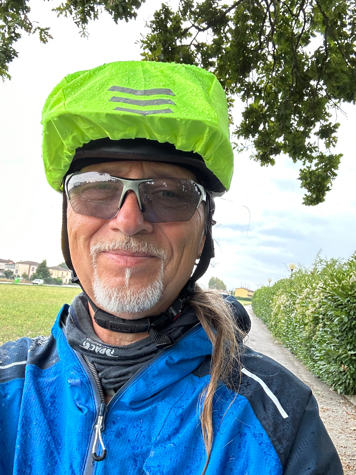 Was ich bisher vergessen habe zu erwähnen, vorgestern als ich bei casa Torre ankam, hatte ich genau 2022km am Display, ich schätze, so 2500km werden es in Summe werden, bis ich zuhause bin. Heute ist seit längerem der erste Tag, an dem es morgens über 20 Grad hat, passt gut. Gestern habe ich erstmals mein „verbotenes“ Rücklicht angeschaltet, ich habe es aus Amerika importiert, es ist bei uns nicht erhältlich, weil verboten. Es ist so stark, dass der nachkommende Fahrer geblendet wird, wenn er direkt hinter mir fährt, aber ich bin schon aus einiger Entfernung wahrnehmbar, das ist bei schlechter Sicht und dichtem Verkehr wie eben gestern, ein echter Bonus! Italienische Straßenfahrer haben zum Teil auch ein sehr starkes Rücklicht, ich nehme an, hier ist es erlaubt. Meine heutige Tour geht bzw. fährt nach Ferrara, wieder entlang einer stark frequentierten direkten Verbindungsstraße. Zum Unterschied zu gestern, führt über ganz lange Streckenabschnitte ein schöner Radweg parallel zur Straße, zumeist auch baulich getrennt, ein Radfahrer Paradies. Die zuständigen Politiker in dieser Gegend Bologna und Ferrara müssen wohl selbst Radfahrer sein ;-) Ferrara hat darüber hinaus den Ruf, Italiens Radfahrer Hauptstadt zu sein. Es ist zwar sehr laut entlang der Straße, aber ich radle ganz entspannt dahin, kein Stress. Die Berge sind längst aus meinem Rückspiegel verschwunden, vor mir liegt wieder die schon bekannte Po Ebene. Von den heutigen 67 Kilometer der Gesamtstrecke, waren es sicher 45 Kilometer Radwege. Als der Radweg endet, ändert sich auch das Wetter, es beginnt leicht zu regnen. Regenschutz auf den Helm, Regenjacke an und das xx-starke Rücklicht ein. Ich fahre wieder auf scheinbar unendlich langen, geraden Straßen dahin, das Ende kann man nur ahnen. In der Ferne taucht schemenhaft ein Kirchturm auf, dort werde ich einmal einen Unterstand suchen und im Internet nachsehen, wie sich das Wetter entwickeln wird. Ich komme näher, aber nicht nahe, denn die Straße macht einen 90 Grad Schwenk, und vor mir die nächste unendlich lange Gerade, und es beginnt stärker zu regnen. Unter einem großen Baum bleibe ich schließlich stehen, und krame aus einer Packtasche – natürlich ganz zuunterst – meine Regenhose hervor, und es geht weiter. Der paradoxe Nachteil dieser regendichten Bekleidung ist der, dass sie dicht ist. Von außen dringt kein Wasser ein, trotzdem spüre ich, wie mir innen das Wasser den Körper hinunter rinnt. Es ist kühler geworden, da wird das Köcheln im eigenen Saft fast schon wieder zum Vorteil, solange man sich bewegt. Deshalb beschließe ich auch, keinen Halt mehr einzulegen, sondern schnellstmöglich zu meinem Quartier zu radeln. Kurz nach zwölf erreiche ich schon Ferrara, ich muss aber durch die Stadt, mein Hotel liegt in einem Vorort. Kein Problem, dass ich so früh da bin, mein Zimmer ist fertig, ich kann einchecken. Mein Rad ist im Heizkeller sicher verstaut, und ich habe mir fest vorgenommen, es heute auch nicht mehr zu bewegen, ganz egal welche Sehenswürdigkeiten die City auch zu bieten hat. Nach dem Duschen gehe ich ins hauseigene Restaurant und esse ein als lokale Spezialität angepriesenes Nudelgericht, Bandnudeln, hier vorwiegend Eierteigwaren! mit einer Tomatensoße mit einer nur hier erhältlichen Salami. Dazu ein Glas Rotwein, vino della casa und zum Abschluss ein Tiramisu. Eigentlich wäre ich jetzt bereit für ein Mittagsschläfchen, aber da kommt mir die Statistik in den Sinn, die mir Ingo vor einigen Tagen geschickt hat. Von 1. September bis zum 13. September hat dieser Blog 585 verschiedene Besucher mit 1.223 Besuchen 10.673 Seitenaufrufen und 107.760 Zugriffen verzeichnet, und heute ist bereits der 22! Da bin ich all diesen Besuchern und zahlreichen Unterstützern wohl schuldig, ein paar Fotos aus der Region zu liefern. Ich mache mich auf und chartere ein Taxi. Der Fahrer erzählt mir allerhand interessantes zur Stadt, eine zur Gänze vorhandene Stadtmauer die begehbar und mit dem Rad befahrbar ist, (Ferrara ist eine der Städte mit der höchsten Fahrraddichte der Welt!), wir fahren am Palazzo di Diamanti mit seiner Fassade von 8000 pyramidenförmigen Steinen vorbei, und er zeigt mir das Geburtshaus von Ettore Bugatti, der Namensgeber der gleichnamigen französischen Automarke. Lustig ist auch, dass hier in Ferrara einer der häufigsten Familiennamen Ferrari ist :-) Mitten im Zentrum, beim Castello Estense, steige ich aus dem Taxi und bedanke mich für die interessante Fahrt. Ich vermute, heute muss hier Sponsion oder Promotion gefeiert werden, überall stehen mit einem Blumenkranz geschmückte junge Frauen inmitten von Freunden und Familie, die sie feiern und fotografieren. Über den Platz und in den Gassen wird lauthals gesungen, mit dem Refrain Dottore, Dottore…. Es ist insgesamt angenehm viel los, kein Vergleich zu den unlängst besuchten Kult Städten. Wieder schlendere ich durch die Gassen und über Plätze, lass mich treiben und fotografiere auch, und gönne mir ein Eis. Diese Fotos kosten mich 48 Euro fürs Taxi, aber ich bin sehr froh, dass ich mich aufgerafft habe, Ferrara wird mir sehr angenehm in Erinnerung bleiben. Obwohl auch hier in und um die Stadt ein enormes Verkehrsaufkommen herrsch, ist die Luft klar. Ganz anders gestern in Bologna, dort ist die Luft von Abgasen geschwängert, es ist kaum auszuhalten gewesen. Marteen und Dominique, die beiden Holländer von der Casa Terre haben mir erzählt, wenn sie Sehnsucht nach der Stadt haben, fahren sie nach Bologna. Beide sind Raucher, aber wenn sie nach einigen Tagen Bologna wieder nach Hause kommen, spucken sie schwarzen Schleim aus. Ekelhaft, aber nachvollziehbar, wenn man da gewesen ist. Mittlerweile ist es 20:15 ich werde versuchen noch heute Fotos hochzuladen, habe aber wenig Hoffnung dass es hinhaut, die Internetverbindung ist sehr, sehr, sehr mau…..