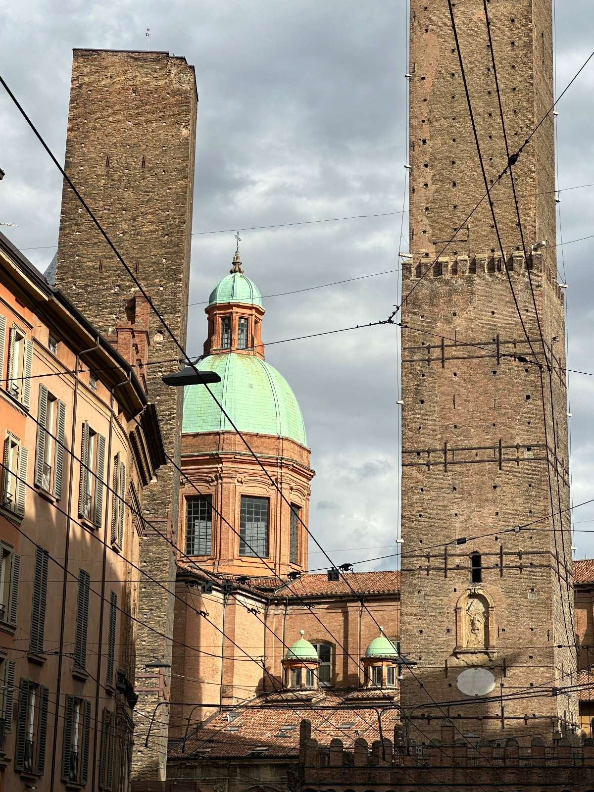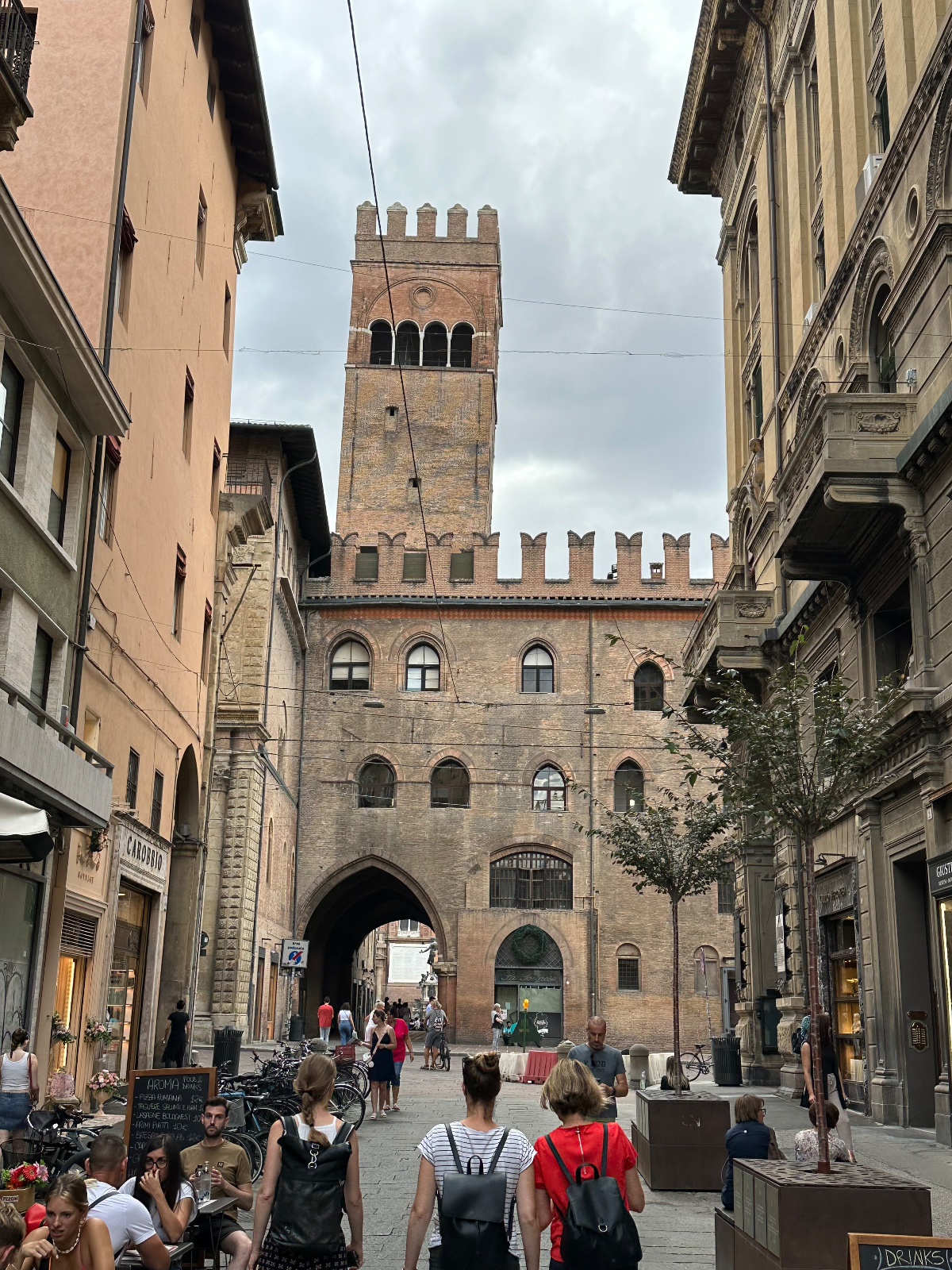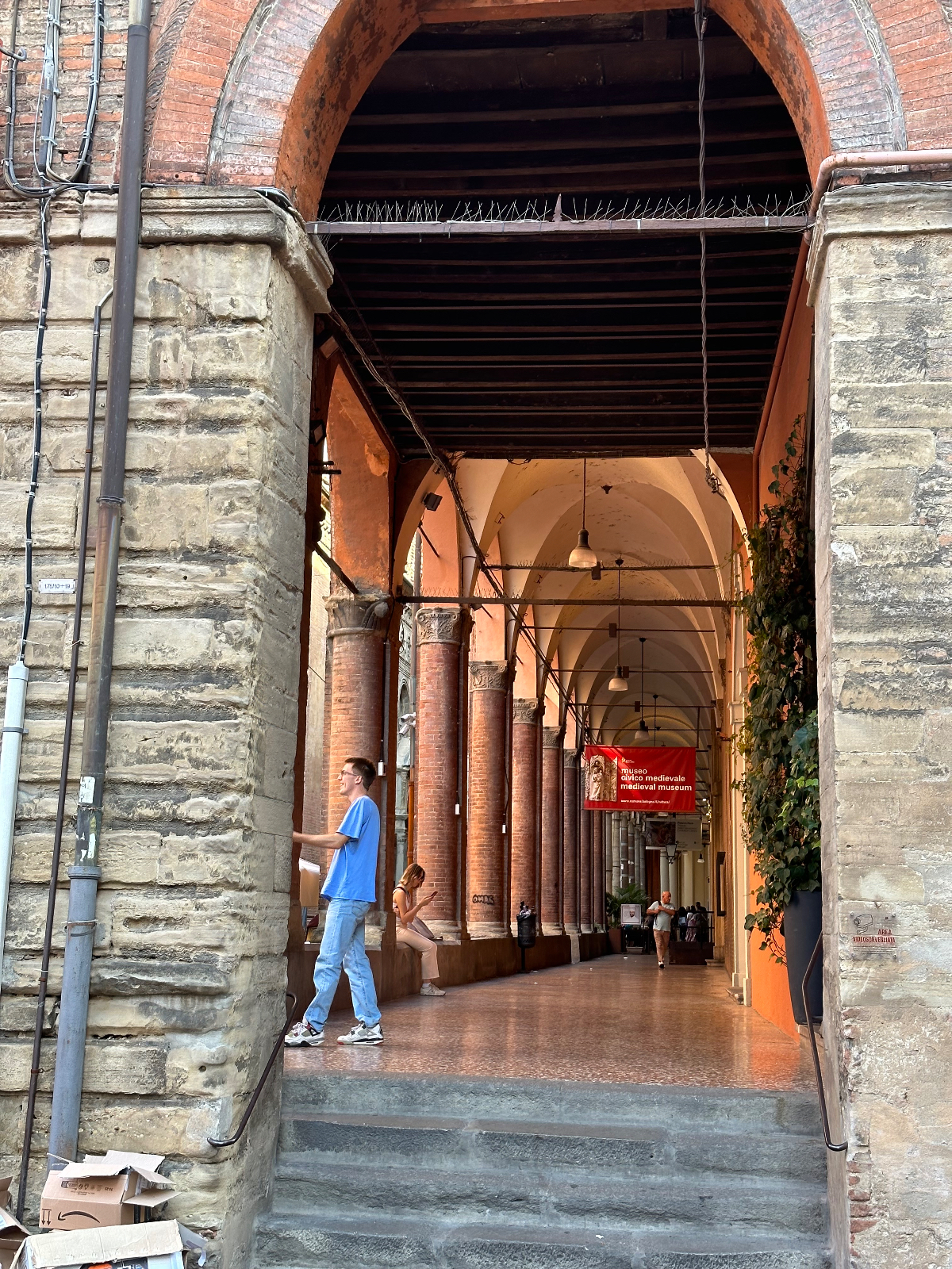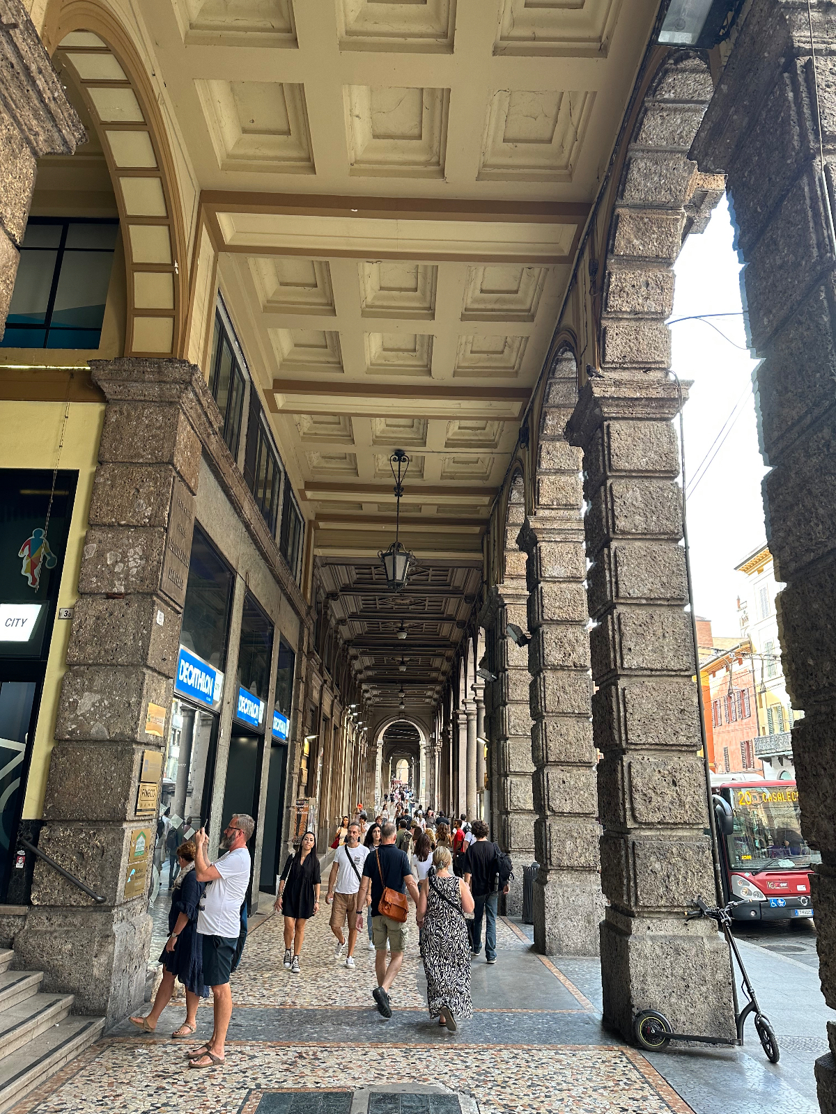 Nach dem Frühstück, welches mir die beiden wieder liebevoll zubereitet haben, verabschiede ich mich, wir wünschen uns eine gute Reise, sie fahren ja auch morgen. Ich glaube, so spät wie heute bin ich noch gar nie weggefahren, aber es liegen ja gerade einmal 55 Kilometer vor mir. Dass die härtesten Kilometer meiner Reise dabei sein werden, wusste ich da noch nicht. Runter vom Berg, den ich gestern noch erklommen habe, es hat frische 17 Grad. Wenn es in den nächsten Tagen weiter hinunter geht mit der Temperatur, dann ist das warme Gewand, das ich bisher nicht gebraucht habe, doch nicht unnützer Ballast. Lieber wäre es mir, wenn ich es nicht brauche! Für fast 30 Kilometer bin ich heute aktiver Verkehrsteilnehmer auf dieser stark befahrenen Bundesstraße in Richtung Bologna. Ich habe in den letzten Wochen doch schon viele Kilometer unter erschwerten Bedingungen absolviert, aber heute wird es noch einmal so richtig hart. Es herrscht vor allem ein starker Schwerverkehr auf dieser Strecke, ein Radfahrer ist hier ein einziges Hindernis. Waren es bisher an stark befahrenen Straßen meist eher kurze Abschnitte, an denen es brenzlig wurde, so trifft es heute auf die ganze Strecke zu. Die Straße ist nicht breit genug, um gefahrlos überholt zu werden, und nach rechts bleibt mir kein Zentimeter Reserve. Mein Adrenalinspiegel muss astronomisch hoch sein, ich spüre nichts und gebe alles. Keine Spur mehr davon, dass die Beine am Morgen noch sehr schwer waren. Das ist auch der einzig positive Effekt dieser Sonderprüfung, keine Schmerzen und keine Zeit zum Nachdenken, nur pedalieren, was die Beine hergeben, um es möglichst schnell hinter sich zu bringen. Aber 30 Kilometer sind lang ….. Dann kommt ein Abschnitt, entlang eines schroffen Steilhangs. Links die Wand, rechts mannshohe Leitschienen, dazwischen zwei Fahrspuren und absolutes Überholverbot. Ich sehe im Rückspiegel, die Straße in meine Richtung ist frei, noch. Aber schon schieben sich die LKW´s von hinten an mich heran, ich kann nicht einmal stehen bleiben um sie passiere zu lassen, es geht einfach nicht. Ich spüre den Druck, der sich hinter mir aufbaut, ein Ende ist nicht in Sicht, ich versuche gelassen zu bleiben, keine leichte Übung ;-) Nachdem diese Straße ein Teil des Eurovelo 7 ist, scheint es auch links oder rechts der Straße keine Alternative zu geben. Nach diesen 30 Kilometern bin ich jedenfalls ko und brauche eine Pause. Und ein trockenes Shirt. Endlich eine ruhige Nebenstraße, gerne auch steil bergauf, nur nicht wieder zurück auf diese Piste. Brauche ich auch tatsächlich nicht mehr. Aber damit ist es für heute noch nicht ausgestanden. Nach einigen ruhigen Kilometern entlang eines Flusses, beendet eine Tafel mit absolutem Fahrverbot die Fahrfreude. Was tun? Nachdem ich ja schon schlechte Erfahrungen gemacht habe, zögere ich. Ich schaue auf die Karte, ich müsste als Alternative auf die Bundesstraße zurück, sicher nicht, also durch. Zuerst geht es eh ganz gut, es folgt eine Baustelle, die nicht besetzt ist, und ich freue mich, weil ich annehme, die Baustelle war die Ursache für das Fahrverbot. War sie aber nicht. Der Weg wir schlechter, immer schlechter. War es anfangs eine brettharte, ruppige Wegoberfläche, so folgt nun eine Art grober Kies, nicht einfach zu befahren. Dann folgt der Übergang auf Rollschotter, richtig grober, zum Glück nicht scharfkantige, sondern runde Steine, die natürlich nach allen Seiten nachgeben, wenn man darüberfährt. Das Schotterbett ist zudem tief, sodass ich auch immer wieder einsinke, nur nicht stehenbleibe, sonst komme ich da nie mehr wieder raus aus diesem Schlamassel. Irgendwann ist auch das zu Ende, ich atme auf, als ich wieder Asphalt unter den Reifen habe. Nur das Navi leitet mich schon auf die nächste Fahrverbotstafel zu. Nein sicher nicht, nicht noch einmal das Glück herausfordern. Dafür ist mein Rad mit diesem Gepäck ganz einfach nicht geeignet! Laut Navi kann Bologna nicht mehr weit sein, ich finde einen anderen Weg auf eine größere Straße, und bald schickt mich das Navi auf einen Radweg. So angenehm. Der Radweg durch eine Flusslandschaft, ähnlich unserem Radweg durch die Murauen, führt dann über eine schmale Brücke. Am Ender der Brücke sagt das Navi aber plötzlich, folge dem Single Trail. Nein, nicht schon wieder denke ich mit aufkeimendem Ärger, warum habe ich das bei der Planung übersehen! Ich frage Spaziergänger, possibile con bici, sie nicken, und ich fahre. Es geht über Wurzeln, über Stock und Stein, aber wenigstens eben dahin, da hatte ich es heute schon schlimmer! Irgendwann wird dann tatsächlich wieder ein Radweg daraus. Dieser Radweg zieht sich dann durch Vorstädte, quer durch Bologna, bis hin zu meinem Quartier am anderen Ende der Stadt. Extrem cool! Ich habe heute ein Apartment in einer Art Reihenhaus Anlage. Ebenerdig, eine kleine Veranda, Wohnküche, Bad und Schlafzimmer. Alles sehr sauber und wohnlich eingerichtet. Die Vermieterin lerne ich nicht kennen, wir kommunizieren über whats app, der Schlüssel ist im Schlüsseltresor deponiert. Ich nutze das Vorhandensein einer Waschmaschine. Währenddessen erkundige ich mich über Bologna, ob es lohnt, sich die Stadt anzusehen. Und es scheint sich zu lohnen, die Altstadt gilt als eine der schönsten von Italien, wow! Bologna hat mehrere Kilometer Arkadengänge in der City, die in das Unesco Weltkulturerbe aufgenommen wurden. Waschmaschine fertig, Wäsche aufgehängt, ich fahre in die City. Dauert mit dem Rad immerhin 36 Minuten. Auch jetzt wieder, Radwege. Bologna hat ein perfektes Radwegenetz, habe ich so noch nirgends gesehen. Zweispurig, und zumeist vom Fußgängerverkehr getrennt, man kommt richtig gut voran, egal in welche Richtung man möchte, echt vorbildlich! Die Stadt ist sehr groß, so auch die Innenstadt. Zu sehen gibt es wieder Kirchen, Türme, Palazzi (oder doch Palazzos?) enge Gassen, und Menschenmassen – und Autos, überall! Ich habe wie meist keinen Plan, und treibe ein