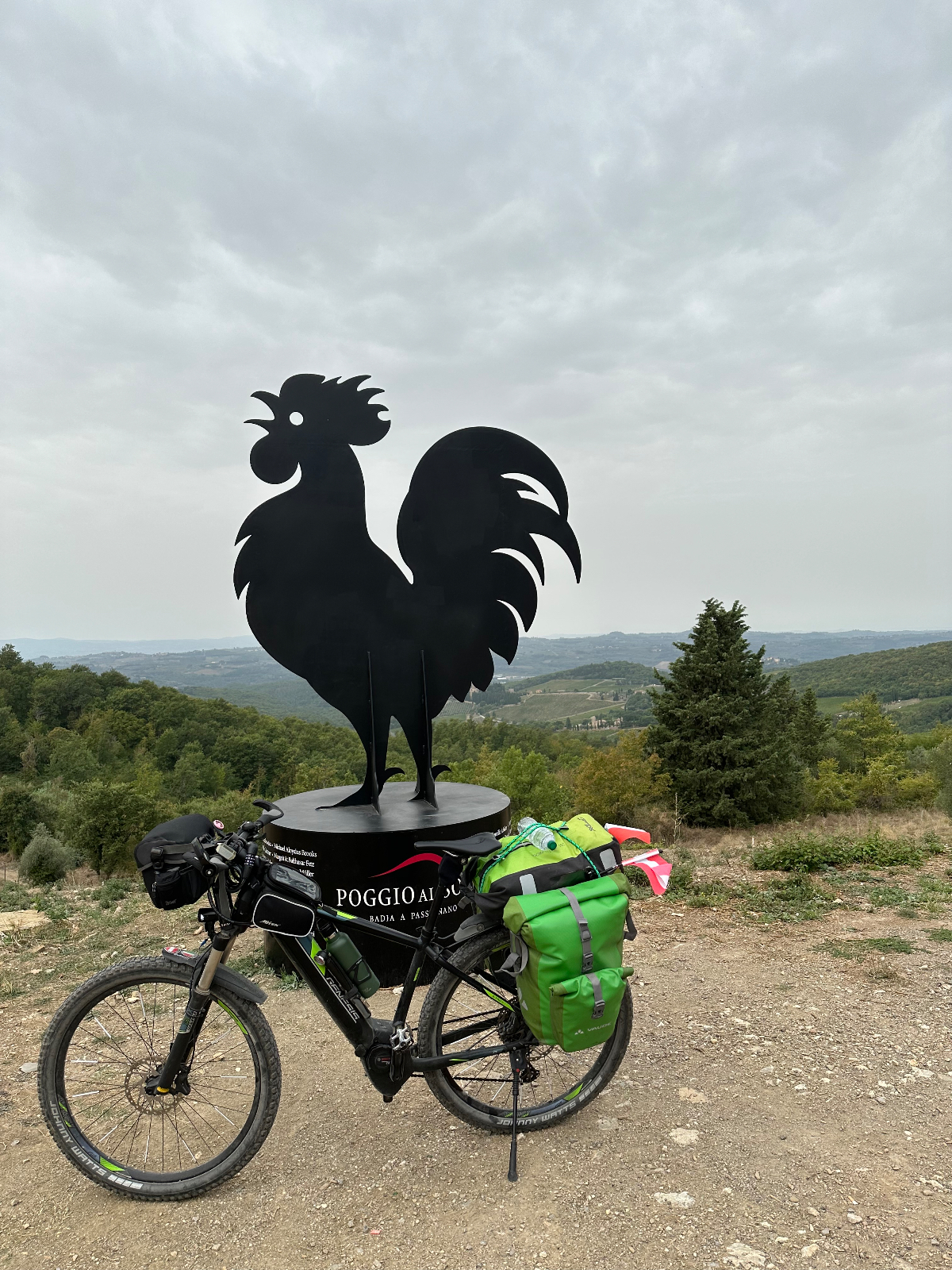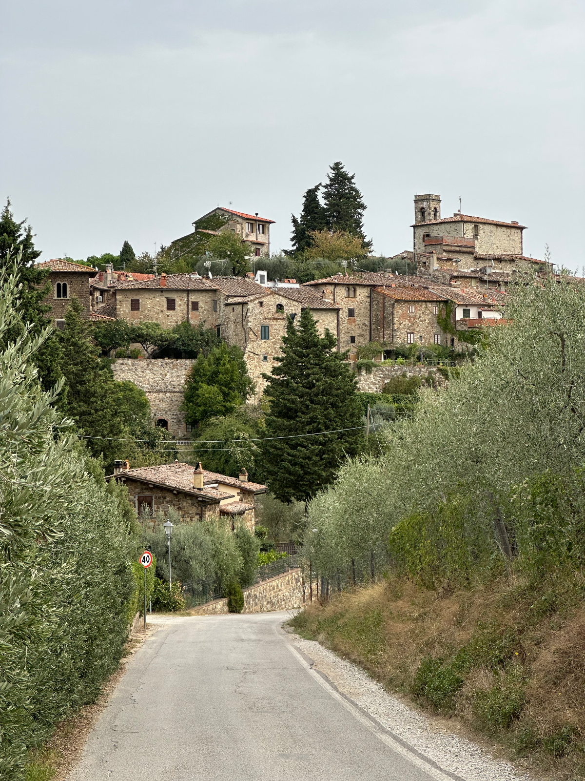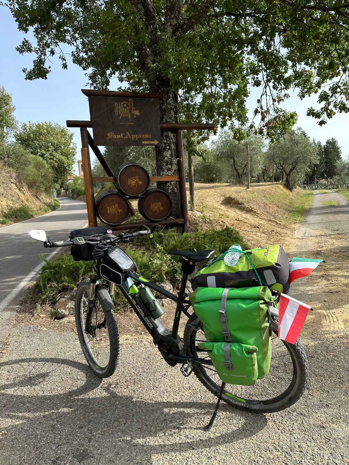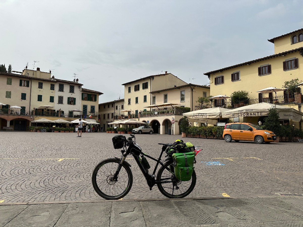 … und zwei Tage Siena sind schon wieder vorbei. Hier hat alles gepasst, das Hotel war großartig, Siena sowieso. Einmal muss ich noch den Berg hoch, um acht Uhr trete ich an, die Straße, die ich gestern bereits zu Fuß hinauf gegangen bin. In das Zentrum muss ich nicht hinein, ich fahre entlang der alten Stadtmauer, wo der Kampf um die Parkplätze bereits wieder begonnen hat. In diesen Städten kehrt wahrscheinlich erst im Winter Ruhe ein. Es ist ziemlich frisch, 17 Grad gerade einmal, speziell bergab unangenehm zu spüren, ich habe die Socken griffbereit vorbereitet und werde sie bald anziehen. Aber zuerst erreiche ich Montereggioni, eine gut erhaltene Festungsstadt auf einem Hügel gelegen. Ich fahre hinauf, um es mir aus der Nähe anzusehen. Wenn ich bedenke, dass ich bei meiner Erstplanung zuhause unbedingt hierher wollte, bin ich heute ein wenig enttäuscht. Keine Ahnung, was ich erwartet habe, aber es hat mich nicht geflasht. Darum habe ich mir auch schon lange vorgenommen, nichts mehr einzuplanen das ich unbedingt sehen möchte, sondern ich genieße alles, was mir der Weg so bietet. Davon gibt es schließlich reichlich hier, und mit dem Rad bekommt man so viel mehr mit :-) Dann tauche ich in ein Tal hinab, da wird es dann richtig kalt. Am Oberkörper verschwitz, die Füße eiskalt, die Socken müssen her! Es will heute so gar nicht schön werden, der Himmel ist bedeckt, keine Sonne zu sehen. Die 35 Grad in der Po Ebene waren mir lieber, aber es wird wohl auch hier Herbst. Poggibonsi ist recht groß, ich radle durch ohne anzuhalten, es gibt hier nicht zu sehen, zumindest auf meiner Route ist es so. Wird aber bald anders, als ich die Berge des Chianti erreiche. In den Weinhängen sind fleißige Händen bereits bei der Lese der vollreifen Trauben. Es gibt wieder einige knackige Anstiege zu bewältigen, aber das „erste Radfahrer´sche Gesetz“ besagt, wenn es hinauf geht, geht es irgendwann auch wieder hinunter, das ist Physik, daran ist nicht zu rütteln ;-) Die Straßen sind sehr schmal, entgegenkommende Autos hupen vor jeder Kurve, gute Idee. An einem alten Kloster halte ich an, Pinkelpause, da nähert sich ein langer Konvoi von Cabrios, mindestens 30, vorwiegend Alfa und Fiat, die meisten davon mit alten Kennzeichen aus Rom. Die Passagiere winken freundlich, als ich fotografiere. Alte Autos in dieser historischen Gegend, macht sich gut. Mein heutiges Ziel, Greve in Chianti ist nicht mehr weit entfernt. Am Höhenprofil sehe ich, ich bin bald ganz oben, dann dem Gesetz folgend geht´s bergab :-) Und zwar recht heftig, ich muss ständig bremsen und höre dabei ein schleifendes Geräusch der vorderen Bremse. Wenn die Beläge abgefahren sind, wird es mich nicht wundern, sie waren jetzt fast 2000 Kilometer im Einsatz, gutes Material! Bevor ich ganz unten in Greve ankomme, muss ich noch in einem alten Bergdorf an einer roten Ampel anhalten. Der folgende Abschnitt der Straße ist einfach nicht breit genug, ich kann da auch von keinem Auto überholt werden. Dieses Dorf ist mir aus unserem vorjährigen Besuch in Erinnerung, hier sind wir mit den Rädern herauf gestrampelt. Noch eine Abfahrt über ein paar Serpentinen, dann ist Greve erreicht. 14 Uhr, Zeit zum Essen. Ich setze mich in ein Restaurant, das ich auch aus dem Vorjahr kenne. Alessandro, der Inhaber, begrüßt mich wie einen alten Bekannten, aber das hat er bei unserem ersten Besuch auch so gemacht, ist seine persönliche Masche ;-) Ich bekomme unaufgefordert ein Glas Vino da casa und Pizzabrot. Nach meinem Essen gibt es zwei Stück Kuchen, auch aufs Haus, Danke Alessandro! Die Sonne scheint noch immer nicht durch die Wolkendecke, es hat 28 Grad und es ist drückend schwül. Zeit einzuchecken, um zu duschen. Ich habe heute ein Privatquartier, ein Apartment mit zwei Schlafzimmern und zwei Bädern. Was anderes war nicht zu kriegen. Wieder eine Gelegenheit, um zu sehen, wie diese alten Häuser innen aussehen. Der Nachteil, ich bin im zweiten OG, ich muss alles hinauf schleppen, und morgen wieder hinunter. Auch mein Rad musste ich ein Stockwerk hinaufbefördern, dort steht es am Gang. Es gibt hier auch eine Radverleih mit Werkstatt, dort habe ich meine vorderen Bremsklötze wechseln lassen. Alles wieder gut!