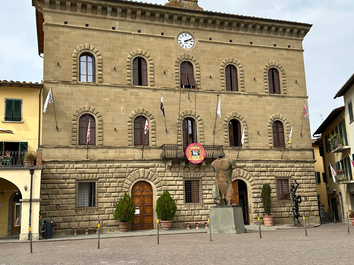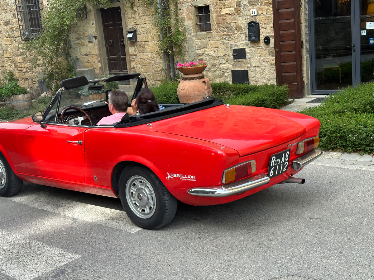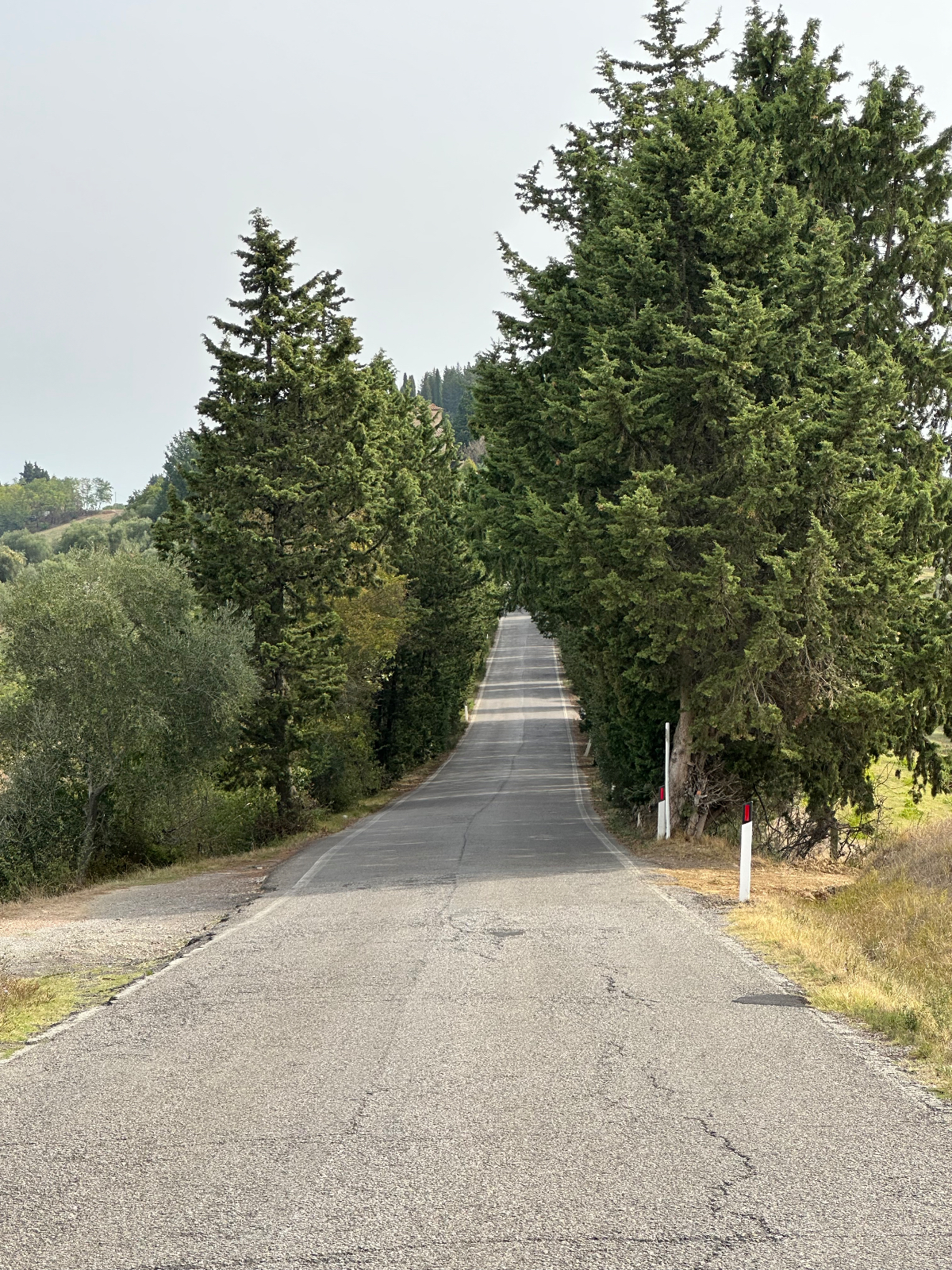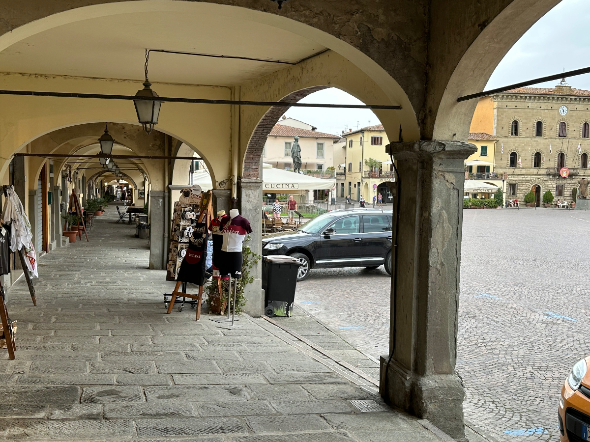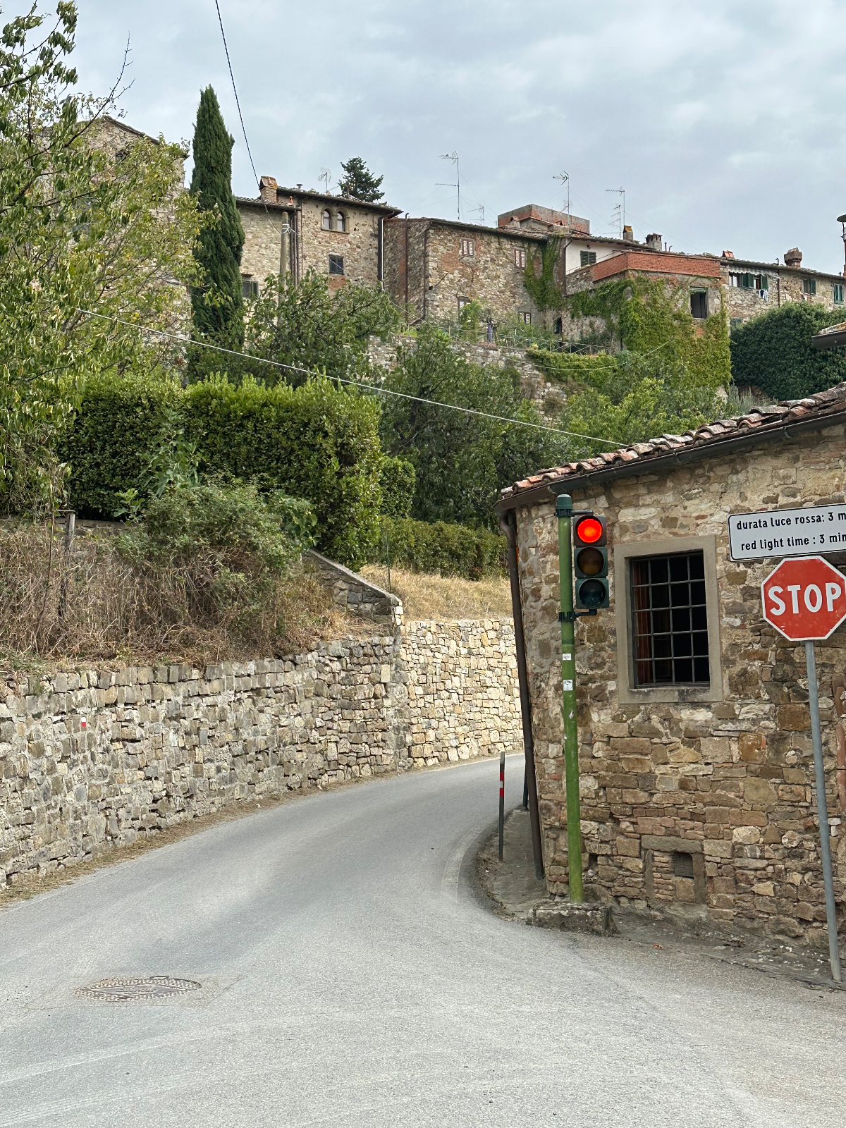 … und zwei Tage Siena sind schon wieder vorbei. Hier hat alles gepasst, das Hotel war großartig, Siena sowieso. Einmal muss ich noch den Berg hoch, um acht Uhr trete ich an, die Straße, die ich gestern bereits zu Fuß hinauf gegangen bin. In das Zentrum muss ich nicht hinein, ich fahre entlang der alten Stadtmauer, wo der Kampf um die Parkplätze bereits wieder begonnen hat. In diesen Städten kehrt wahrscheinlich erst im Winter Ruhe ein. Es ist ziemlich frisch, 17 Grad gerade einmal, speziell bergab unangenehm zu spüren, ich habe die Socken griffbereit vorbereitet und werde sie bald anziehen. Aber zuerst erreiche ich Montereggioni, eine gut erhaltene Festungsstadt auf einem Hügel gelegen. Ich fahre hinauf, um es mir aus der Nähe anzusehen. Wenn ich bedenke, dass ich bei meiner Erstplanung zuhause unbedingt hierher wollte, bin ich heute ein wenig enttäuscht. Keine Ahnung, was ich erwartet habe, aber es hat mich nicht geflasht. Darum habe ich mir auch schon lange vorgenommen, nichts mehr einzuplanen das ich unbedingt sehen möchte, sondern ich genieße alles, was mir der Weg so bietet. Davon gibt es schließlich reichlich hier, und mit dem Rad bekommt man so viel mehr mit :-) Dann tauche ich in ein Tal hinab, da wird es dann richtig kalt. Am Oberkörper verschwitz, die Füße eiskalt, die Socken müssen her! Es will heute so gar nicht schön werden, der Himmel ist bedeckt, keine Sonne zu sehen. Die 35 Grad in der Po Ebene waren mir lieber, aber es wird wohl auch hier Herbst. Poggibonsi ist recht groß, ich radle durch ohne anzuhalten, es gibt hier nicht zu sehen, zumindest auf meiner Route ist es so. Wird aber bald anders, als ich die Berge des Chianti erreiche. In den Weinhängen sind fleißige Händen bereits bei der Lese der vollreifen Trauben. Es gibt wieder einige knackige Anstiege zu bewältigen, aber das „erste Radfahrer´sche Gesetz“ besagt, wenn es hinauf geht, geht es irgendwann auch wieder hinunter, das ist Physik, daran ist nicht zu rütteln ;-) Die Straßen sind sehr schmal, entgegenkommende Autos hupen vor jeder Kurve, gute Idee. An einem alten Kloster halte ich an, Pinkelpause, da nähert sich ein langer Konvoi von Cabrios, mindestens 30, vorwiegend Alfa und Fiat, die meisten davon mit alten Kennzeichen aus Rom. Die Passagiere winken freundlich, als ich fotografiere. Alte Autos in dieser historischen Gegend, macht sich gut. Mein heutiges Ziel, Greve in Chianti ist nicht mehr weit entfernt. Am Höhenprofil sehe ich, ich bin bald ganz oben, dann dem Gesetz folgend geht´s bergab :-) Und zwar recht heftig, ich muss ständig bremsen und höre dabei ein schleifendes Geräusch der vorderen Bremse. Wenn die Beläge abgefahren sind, wird es mich nicht wundern, sie waren jetzt fast 2000 Kilometer im Einsatz, gutes Material! Bevor ich ganz unten in Greve ankomme, muss ich noch in einem alten Bergdorf an einer roten Ampel anhalten. Der folgende Abschnitt der Straße ist einfach nicht breit genug, ich kann da auch von keinem Auto überholt werden. Dieses Dorf ist mir aus unserem vorjährigen Besuch in Erinnerung, hier sind wir mit den Rädern herauf gestrampelt. Noch eine Abfahrt über ein paar Serpentinen, dann ist Greve erreicht. 14 Uhr, Zeit zum Essen. Ich setze mich in ein Restaurant, das ich auch aus dem Vorjahr kenne. Alessandro, der Inhaber, begrüßt mich wie einen alten Bekannten, aber das hat er bei unserem ersten Besuch auch so gemacht, ist seine persönliche Masche ;-) Ich bekomme unaufgefordert ein Glas Vino da casa und Pizzabrot. Nach meinem Essen gibt es zwei Stück Kuchen, auch aufs Haus, Danke Alessandro! Die Sonne scheint noch immer nicht durch die Wolkendecke, es hat 28 Grad und es ist drückend schwül. Zeit einzuchecken, um zu duschen. Ich habe heute ein Privatquartier, ein Apartment mit zwei Schlafzimmern und zwei Bädern. Was anderes war nicht zu kriegen. Wieder eine Gelegenheit, um zu sehen, wie diese alten Häuser innen aussehen. Der Nachteil, ich bin im zweiten OG, ich muss alles hinauf schleppen, und morgen wieder hinunter. Auch mein Rad musste ich ein Stockwerk hinaufbefördern, dort steht es am Gang. Es gibt hier auch eine Radverleih mit Werkstatt, dort habe ich meine vorderen Bremsklötze wechseln lassen. Alles wieder gut!