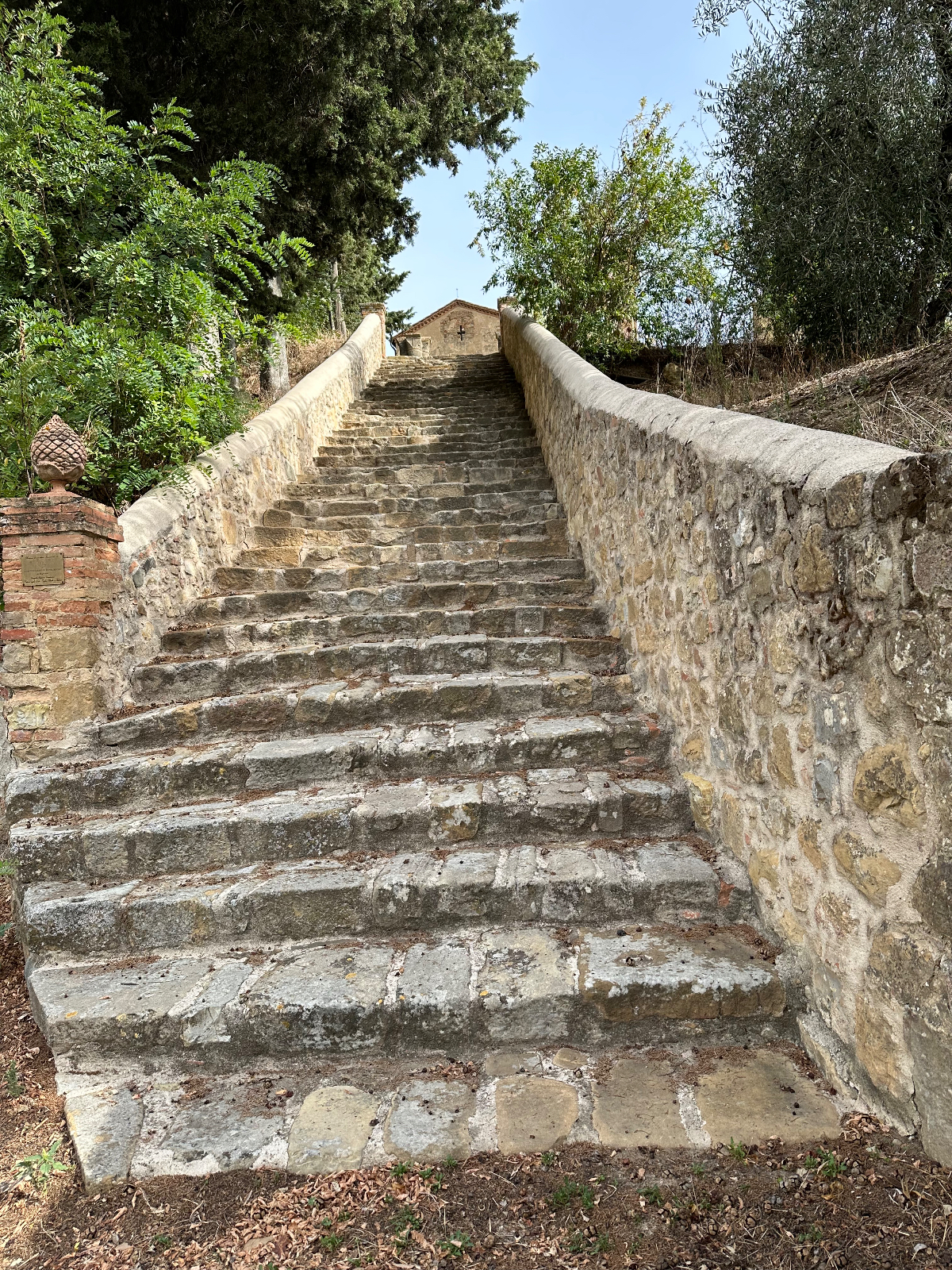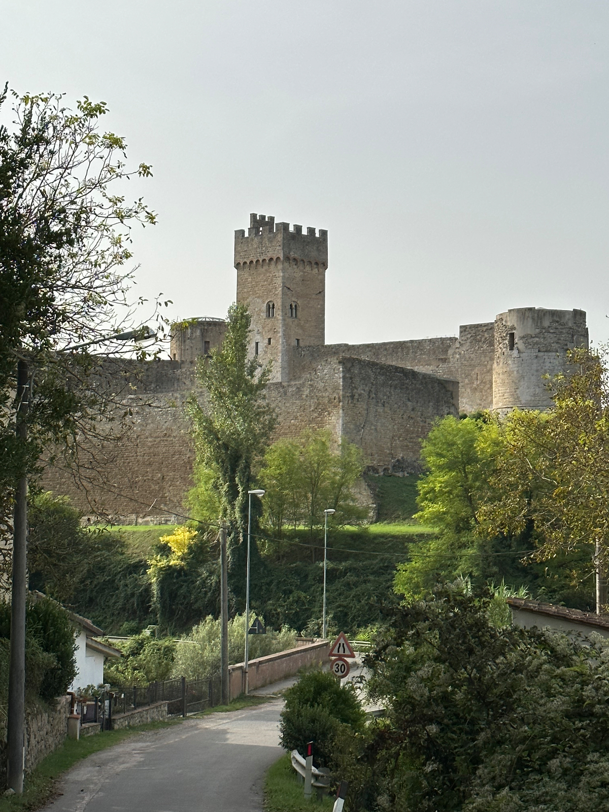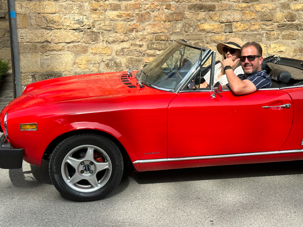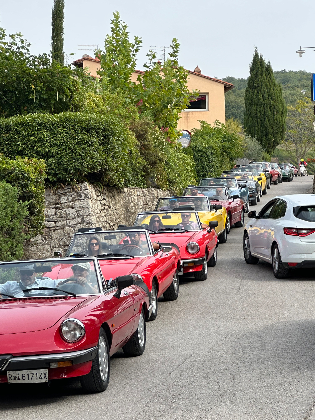 … und zwei Tage Siena sind schon wieder vorbei. Hier hat alles gepasst, das Hotel war großartig, Siena sowieso. Einmal muss ich noch den Berg hoch, um acht Uhr trete ich an, die Straße, die ich gestern bereits zu Fuß hinauf gegangen bin. In das Zentrum muss ich nicht hinein, ich fahre entlang der alten Stadtmauer, wo der Kampf um die Parkplätze bereits wieder begonnen hat. In diesen Städten kehrt wahrscheinlich erst im Winter Ruhe ein. Es ist ziemlich frisch, 17 Grad gerade einmal, speziell bergab unangenehm zu spüren, ich habe die Socken griffbereit vorbereitet und werde sie bald anziehen. Aber zuerst erreiche ich Montereggioni, eine gut erhaltene Festungsstadt auf einem Hügel gelegen. Ich fahre hinauf, um es mir aus der Nähe anzusehen. Wenn ich bedenke, dass ich bei meiner Erstplanung zuhause unbedingt hierher wollte, bin ich heute ein wenig enttäuscht. Keine Ahnung, was ich erwartet habe, aber es hat mich nicht geflasht. Darum habe ich mir auch schon lange vorgenommen, nichts mehr einzuplanen das ich unbedingt sehen möchte, sondern ich genieße alles, was mir der Weg so bietet. Davon gibt es schließlich reichlich hier, und mit dem Rad bekommt man so viel mehr mit :-) Dann tauche ich in ein Tal hinab, da wird es dann richtig kalt. Am Oberkörper verschwitz, die Füße eiskalt, die Socken müssen her! Es will heute so gar nicht schön werden, der Himmel ist bedeckt, keine Sonne zu sehen. Die 35 Grad in der Po Ebene waren mir lieber, aber es wird wohl auch hier Herbst. Poggibonsi ist recht groß, ich radle durch ohne anzuhalten, es gibt hier nicht zu sehen, zumindest auf meiner Route ist es so. Wird aber bald anders, als ich die Berge des Chianti erreiche. In den Weinhängen sind fleißige Händen bereits bei der Lese der vollreifen Trauben. Es gibt wieder einige knackige Anstiege zu bewältigen, aber das „erste Radfahrer´sche Gesetz“ besagt, wenn es hinauf geht, geht es irgendwann auch wieder hinunter, das ist Physik, daran ist nicht zu rütteln ;-) Die Straßen sind sehr schmal, entgegenkommende Autos hupen vor jeder Kurve, gute Idee. An einem alten Kloster halte ich an, Pinkelpause, da nähert sich ein langer Konvoi von Cabrios, mindestens 30, vorwiegend Alfa und Fiat, die meisten davon mit alten Kennzeichen aus Rom. Die Passagiere winken freundlich, als ich fotografiere. Alte Autos in dieser historischen Gegend, macht sich gut. Mein heutiges Ziel, Greve in Chianti ist nicht mehr weit entfernt. Am Höhenprofil sehe ich, ich bin bald ganz oben, dann dem Gesetz folgend geht´s bergab :-) Und zwar recht heftig, ich muss ständig bremsen und höre dabei ein schleifendes Geräusch der vorderen Bremse. Wenn die Beläge abgefahren sind, wird es mich nicht wundern, sie waren jetzt fast 2000 Kilometer im Einsatz, gutes Material! Bevor ich ganz unten in Greve ankomme, muss ich noch in einem alten Bergdorf an einer roten Ampel anhalten. Der folgende Abschnitt der Straße ist einfach nicht breit genug, ich kann da auch von keinem Auto überholt werden. Dieses Dorf ist mir aus unserem vorjährigen Besuch in Erinnerung, hier sind wir mit den Rädern herauf gestrampelt. Noch eine Abfahrt über ein paar Serpentinen, dann ist Greve erreicht. 14 Uhr, Zeit zum Essen. Ich setze mich in ein Restaurant, das ich auch aus dem Vorjahr kenne. Alessandro, der Inhaber, begrüßt mich wie einen alten Bekannten, aber das hat er bei unserem ersten Besuch auch so gemacht, ist seine persönliche Masche ;-) Ich bekomme unaufgefordert ein Glas Vino da casa und Pizzabrot. Nach meinem Essen gibt es zwei Stück Kuchen, auch aufs Haus, Danke Alessandro! Die Sonne scheint noch immer nicht durch die Wolkendecke, es hat 28 Grad und es ist drückend schwül. Zeit einzuchecken, um zu duschen. Ich habe heute ein Privatquartier, ein Apartment mit zwei Schlafzimmern und zwei Bädern. Was anderes war nicht zu kriegen. Wieder eine Gelegenheit, um zu sehen, wie diese alten Häuser innen aussehen. Der Nachteil, ich bin im zweiten OG, ich muss alles hinauf schleppen, und morgen wieder hinunter. Auch mein Rad musste ich ein Stockwerk hinaufbefördern, dort steht es am Gang. Es gibt hier auch eine Radverleih mit Werkstatt, dort habe ich meine vorderen Bremsklötze wechseln lassen. Alles wieder gut!