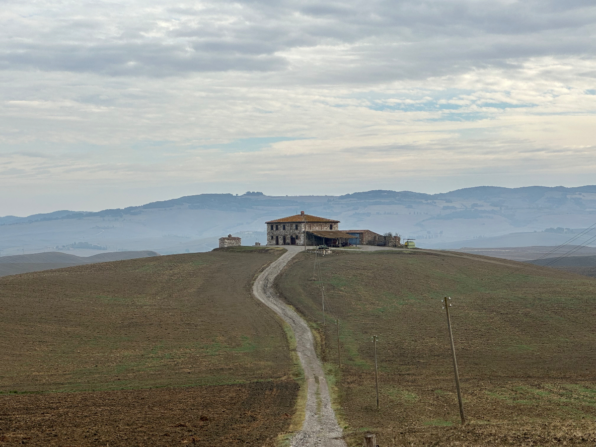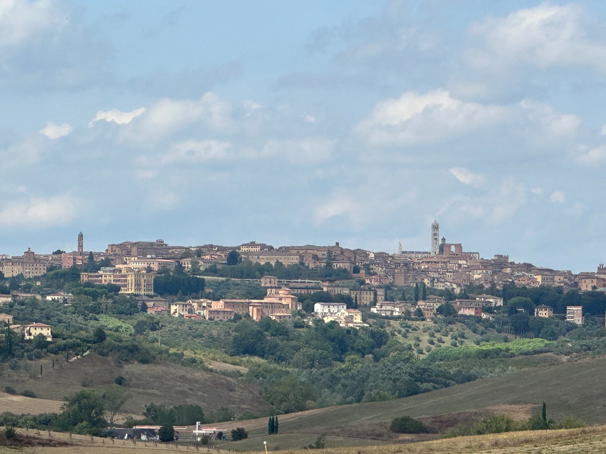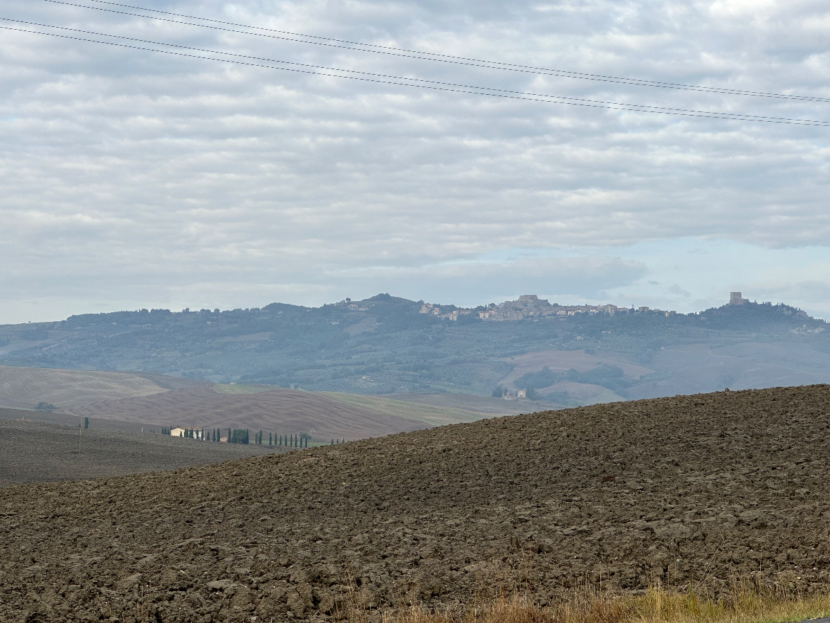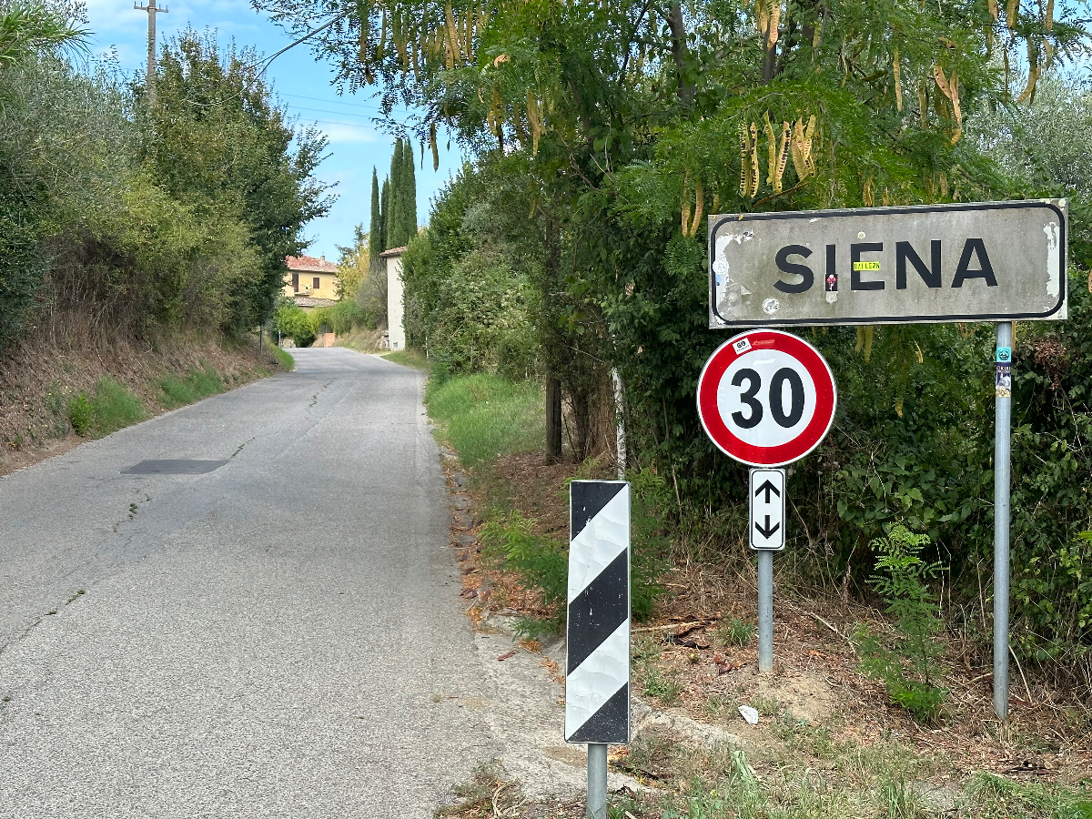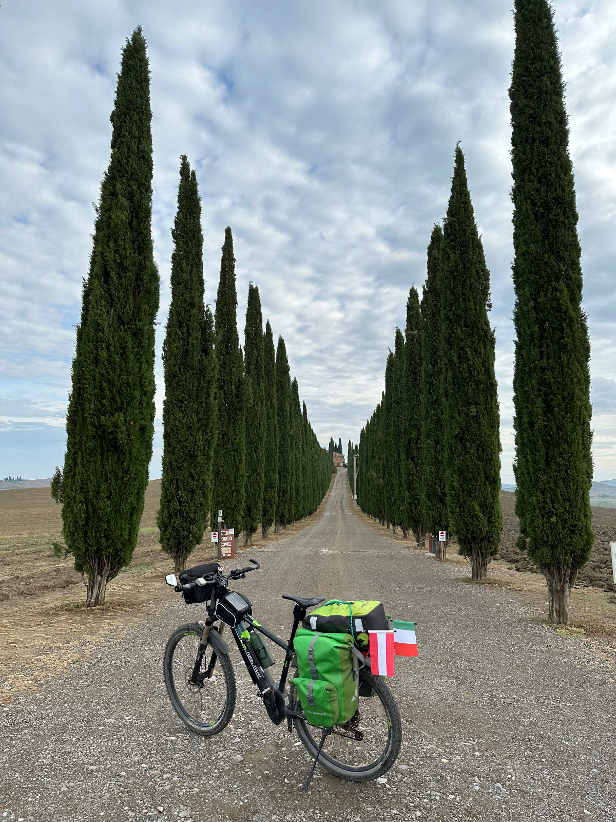 Eigentlich wollte ich kein Wort mehr zu den Betten, speziell den Matratzen verlieren, aber das Bett der letzten Nacht ist es wert, erwähnt zu werden. Kurz gesagt, es war die mit Abstand schlechteste Liegestatt meiner Reise, denn Bett darf man so etwas gar nicht nennen. Eine Art aufklappbares Notbett mit einer Matratze, die sich beim Hinsetzen schon durchbiegt. Beim Hineinlegen macht man gleich ein U, Kopf und Füße oben, der Hintern tief eingesunken, fast Bodenkontakt. Ich konnte das Ende der Nacht in diesem Folterbett kaum erwarten. Zum Frühstück esse ich die vier Mandarinen, die ich gestern hier um 4 Euro gekauft habe. Beim Blick nach Draußen hebt sich meine Laune auch nicht, es regnet und es hat gerad mal 15 Grad. Heute habe ich erstmal zwei Schichten unter der Regenjacke an. Durch das Dorf hinauf, dann geht es aber für zehn Kilometer kurvenreich hinunter ins Tal. Außer einem Pferd, das nach einer Kurve gemächlich die Fahrbahn quert, und vier Rehen am Straßenrand bin ich allein unterwegs. Trotz des schlechten Wetters ist die Schönheit dieser Gegend offensichtlich, trotz Nebel und Nieselregen. Bald erreiche ich die Abzweigung zu Bagni San Filippo, warme Quellen, die zu besuchen mir sehr empfohlen wurde. Danke Sepp für den Tipp, das Wetter hat leider einen Strich durch die Rechnung gemacht. Es geht wieder Hügel rauf und Hügel runter, so viele Fotomotive, wenn es nur schöner wäre…. Bald nieselt es nur noch, aber die Regenjacke vertrage ich wegen der Temperatur trotzdem. Ich muss sogar einmal stehenbleiben, um Socken anzuziehen, so kalt ist mir in den offenen Sandalen, speziell durch den Fahrtwind bei den Abfahrten. Total uncooles Touristenouting, kurze Radlerhose, dazu Sandalen mit Socken, aber der Zweck heiligt die Mittel ;-) Ich werde heute aber sicher noch ins Schwitzen kommen, dann sind die Socken ohnehin wieder weg. Wieder befahre ich den Franziskusweg, mit vielen Pilgern, die mir entgegenkommen. Mit einer Französin unterhalte ich mich kurz, als ich gerade meine Regenhaube vom Helm nehme, es hat aufgehört zu regnen. Sie ist nur wegen der Toskana hierhergekommen und schwärmt in den höchsten Tönen von der Schönheit der Toskana, ich stimme ihr vollkommen zu. Von allem, was ich in Italien schon gesehen habe, gehört mein Herz der Toskana. Besonders dieser Landstrich, durch den ich heute fahre, das Val d`Orcia ist atemberaubend schön. Es ist wie eine Fahrt durch ein Bilderbuch, mit der Erkenntnis, jede neu aufgeschlagene Seite ist noch schöner als die vorangegangene Seite es schon war. Dazu bessert sich auch das Wetter langsam, es kommt immer wieder kurz die Sonne durch. Ich könnte ständig stehenbleiben, um zu fotografieren, aber das ist zu umständlich. Wer sehen möchte was ich sehe, muss ohnehin herkommen, um es selbst zu erleben :-) In Torrenieri, ungefähr zur Hälfte der Strecke, gönne ich mir ein Frühstück. Es ist das erste Mal, dass ich mich mit Englisch nicht verständlich machen kann. Wenn Hemma hören könnte, was ich da auf Italienisch daherstammle …… (Hemma, Du bist eine ganz tolle Lehrerin :-) ich bin ein ganz schlechter Schüler ;-) Aber das Frühstück ist gesichert. Es geht weiter, wie bisher, nur dass der Verkehr jetzt massiv zugenommen hat. Da bin ich immer froh, wenn ich die ss2 mal kurz verlassen kann, um auf einer Schotterpiste Franziskuspilger zu sein. Siena taucht in der Ferne auf. Bevor ich Siena erreiche, muss ich noch eine Bergwertung absolvieren, teils auf Schotterpiste, teils auf Nebenstraßen, immer hinauf, schwitz. Durch ein mächtiges Tor fahre ich in das Zentrum, aber sehr bald muss ich das Rad schieben, es schieben sich maßen von Menschen durch die engen Gassen. Ich lasse das Rad einfach stehen, um ein paar Fotos zu machen. Dann suche ich meinen Weg zum Hotel, der Alternative. Hat alles geklappt, schnell einchecken und dann noch rechtzeitig in eine Trattoria zum Essen, Tortelloni mit Wildschweinragout, danach Tiramisu, dazu passend ein kleines Bier ;-) Das Hotel scheint ganz ok, das Bett fühlt sich hart an, also habe ich für zwei Nächte verlängert. Wäsche waschen steht wieder mal an, genauso wie die Kettenpflege dringend fällig ist, und Siena werde ich auch nochmals besuchen, eine Bushaltestelle habe ich direkt vor dem Hotel, ich freue mich auf diesen Tag off :-))