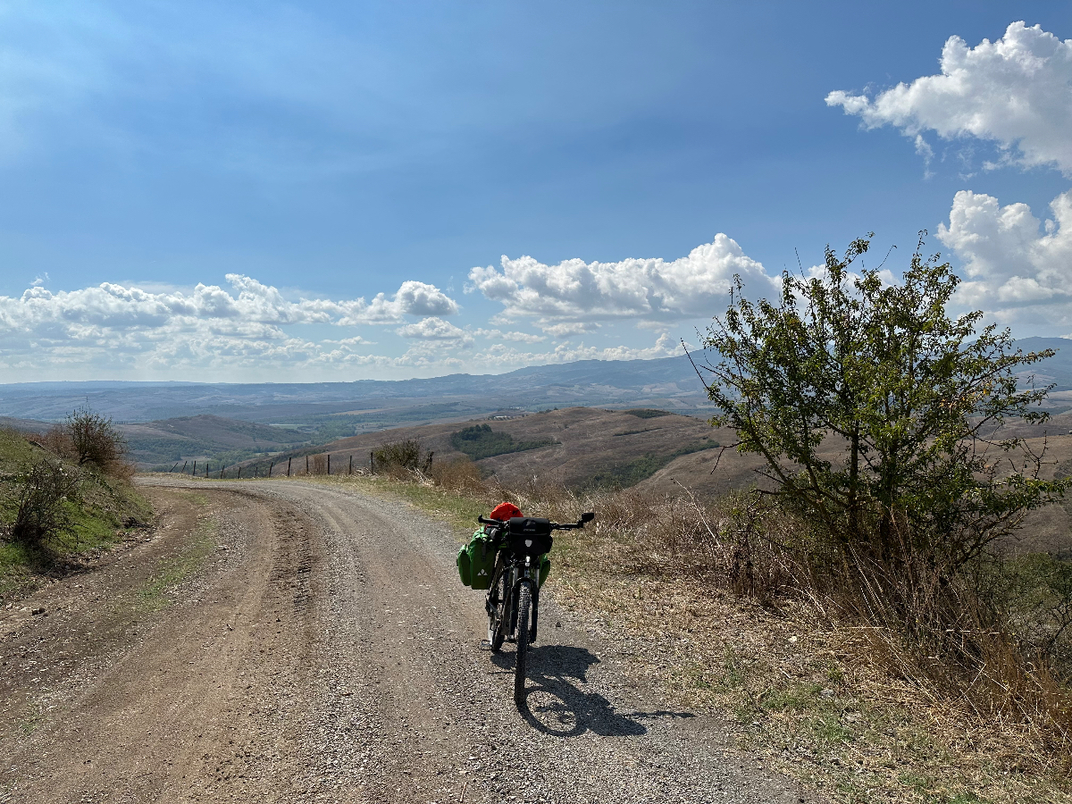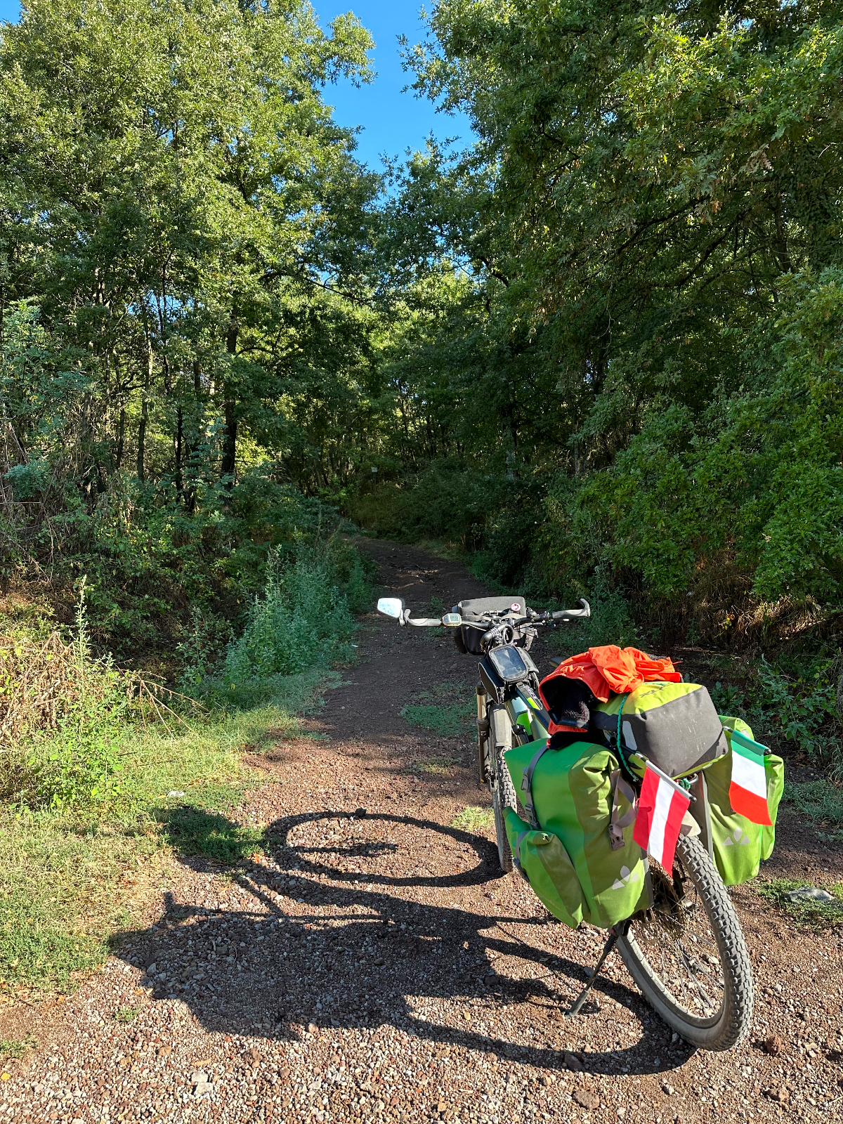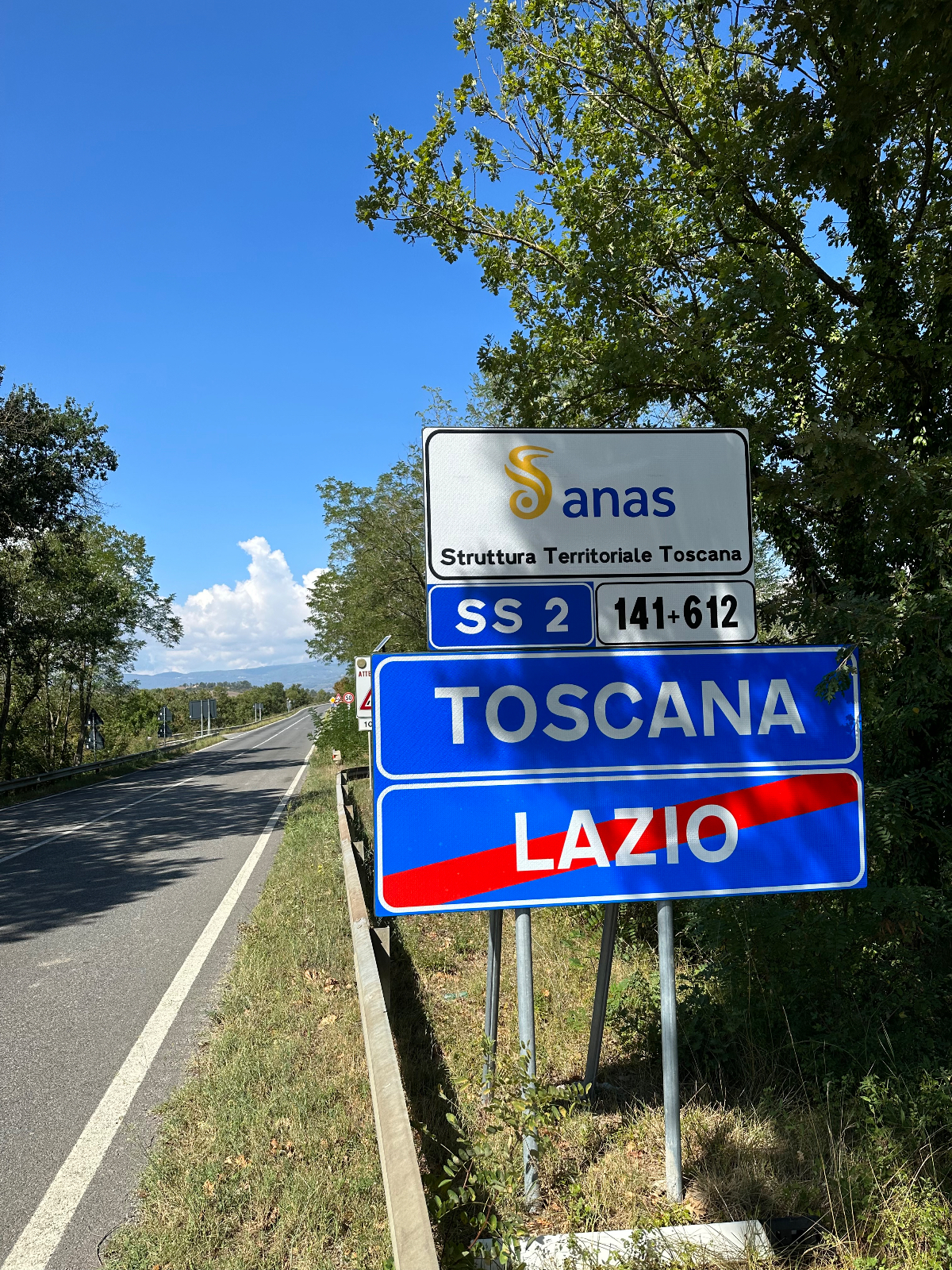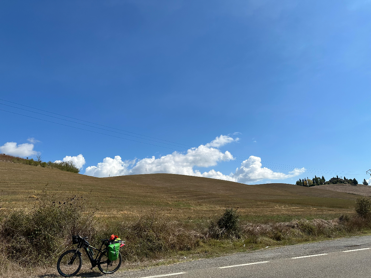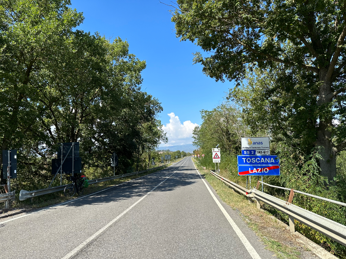 Nach meinem Frühstück, die Reste von gestern, Tomaten, Brot und Tee, geht es los. Zuerst gleich einmal den Berg wieder hinauf, aber dann soll es für lange Zeit hinunter gehen, bis ich auf Seeniveau angekommen bin. Von oben hat der See nicht so groß ausgesehen, aber ich fahre ca. 45 Minuten dem Ufer folgend, bis ich nach Bolsano komme. Der Ort liegt am nördlichen Ufer des Sees. Hier gibt es auch eine touristische Infrastruktur, Hotels, Camping, Seezugang. Noch einige Zeit folge ich dem Seeufer, ehe ich dann die Richtung ändere und den See verlasse. Sehr lange fahre ich heute auf der ss2 der Via Roma, bei relativ starkem Verkehr zügig dahin. Aber immer wieder verlasse ich die ss2, um den Franziskusweg zu befahren. Es gibt heute nur einige wenige Abschnitte, die fürs Rad eher wenig gut geeignet sind, verglichen mit dem, was schon hinter mir liegt, no problem. Wieder begegne ich vielen Pilgern, aber auch einige Radler sind wieder unterwegs. Heute habe ich den ersten Radfahrer mit einer österreichischen Flagge gesehen :-) Bei der Durchfahrt des Ortes Aquapendente muss ich meine Route suchen, denn es herrscht Markttag, es ist enorm viel los, ich muss mein Rad zwischen den Ständen durchschieben. Ich überlege gerade, links oder rechts weiter, da winkt mir ein vor einer Bar sitzender Radfahrer zu, um mir den rechten Weg zu weisen. Ich halte an dieser Bar und setze mich zu ihm. Er heißt Volker, kommt aus Deutschland und ist wie ich seit dem 22. August unterwegs. Sein Ziel heißt allerdings nicht Rom, sondern Ägypten. Er hat sein Zelt dabei und nächtigt immer auf Campingplätzen. Wir unterhalten uns einige Zeit, da gesellt sich eine weitere Radlerin zu uns, Sarah. Sarah und Volker sind sich schon zuvor begegnet. Sie kommt aus Australien, lebt aber in Neuseeland. Für zwei Wochen war sie mit dem Rucksack in den Südtiroler Bergen wandern, seither ist sie mit dem Rad, ausgehend vom Gardasee, gen Süden unterwegs. Ihr Ziel ist Malta. Ihr Rad hat sie aus Neuseeland mitgebracht. Es war sehr schön sich mit den beiden über unsere Erfahrungen auszutauschen. Noch ein Selfie fürs Album, dann trennen sich unsere Wege wieder. Bald erreiche ich die Grenze zwischen Lazio und der Toskana, und die Landschaft ändert auch gleich ich Gesicht. Die vorher freie Sicht über die Ebene mit Bergen in weiter Entfernung, wird nun durch erste, wellige Hügelverläufe bestimmt. An den Kämmen tauchen die ersten Zypressen Alleen auf, und es wird auch auf der Straße bergig. In der Ferne erscheint auf einem freistehenden Hügel eine Stadt mit einem alles überragenden Turm. Muss ich hoffentlich nicht da hinauf denke ich, doch bis zu meinem Ziel ist nicht mehr weit, es könnte passen. Und es passt, ich komme langsam näher. Die letzten 10 Kilometer haben es dann aber in sich. Ich hab schon zuvor im Höhenprofil der Tour gesehen, dass es steil bergauf geht. Zusätzlich sind diese letzten Kilometer auf einer Schotterpiste abzuleisten. Die Straße wurde wohl kürzlich neu mit grobem Schotter hergerichtet, das Material ist ziemlich lose, sehr schwer zu befahren. Und dann geht es richtig zur Sache, na servas die Wadln. Während ich mich hinauf plage, höre ich Im Kopf Hans Knaus sagen, „die Oberschenkel müssen brennen“, habe ich befolgt ;-) Mein Respekt für die Radler mit den „normalen“ Reiserädern ist groß, wenn sie auch wie z.B. Volker nur 18kg Gepäck mitschleppen. Bei solchen Steigungen und Straßenverhältnissen eine großartige Leistung, Hut ab!!