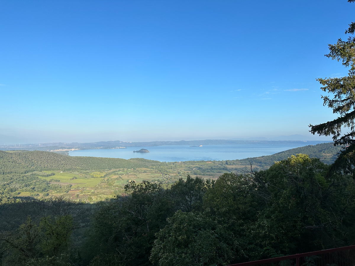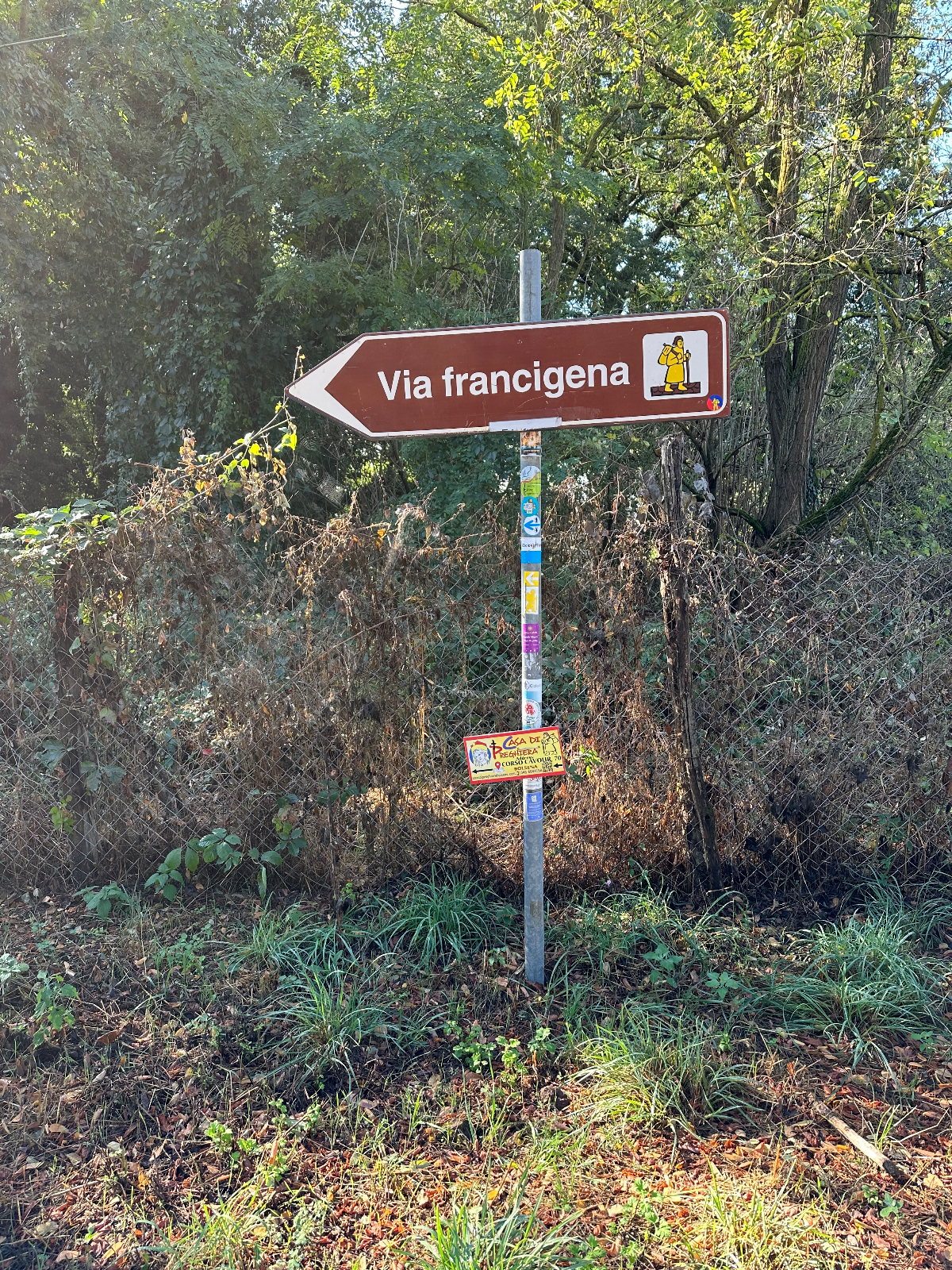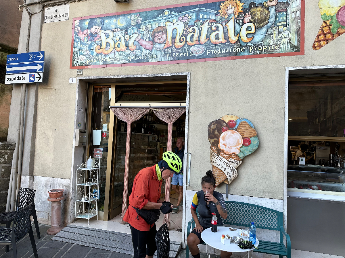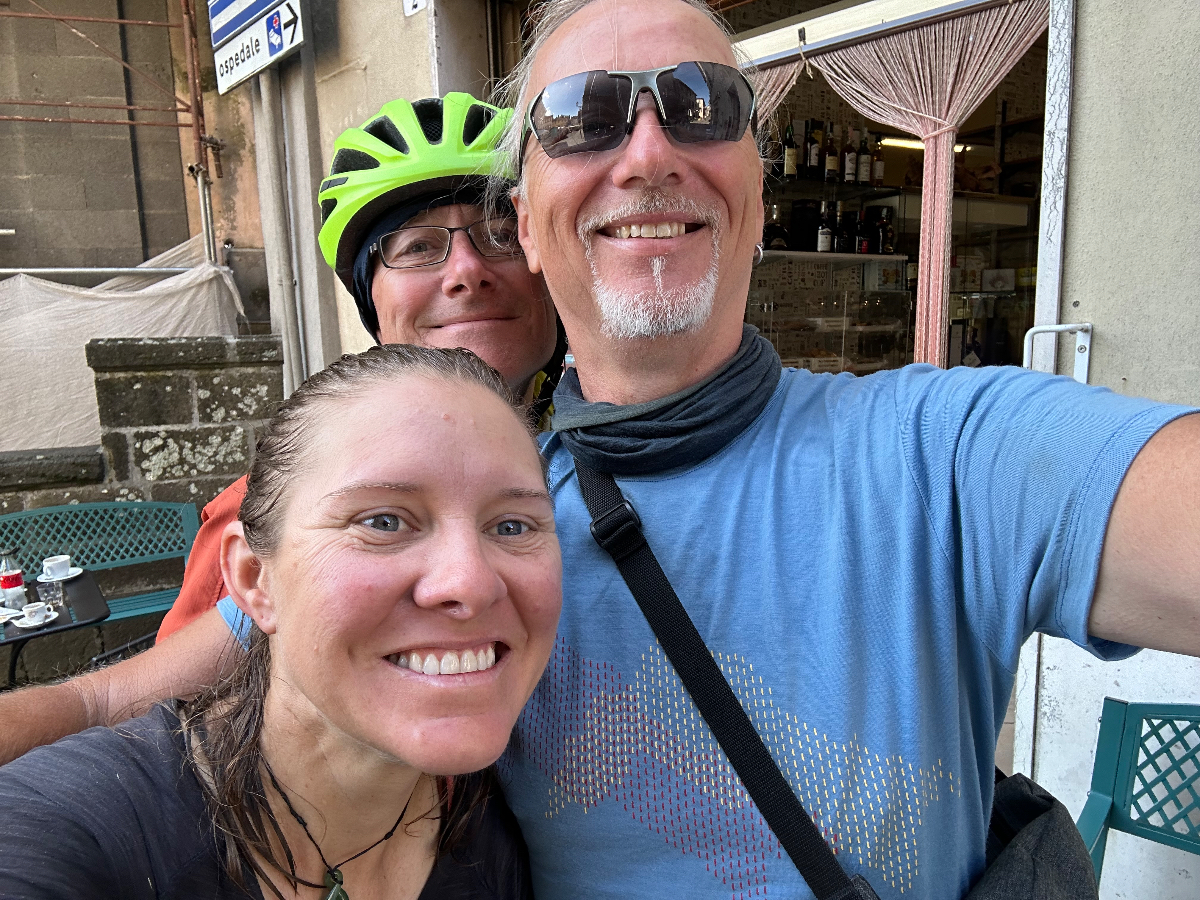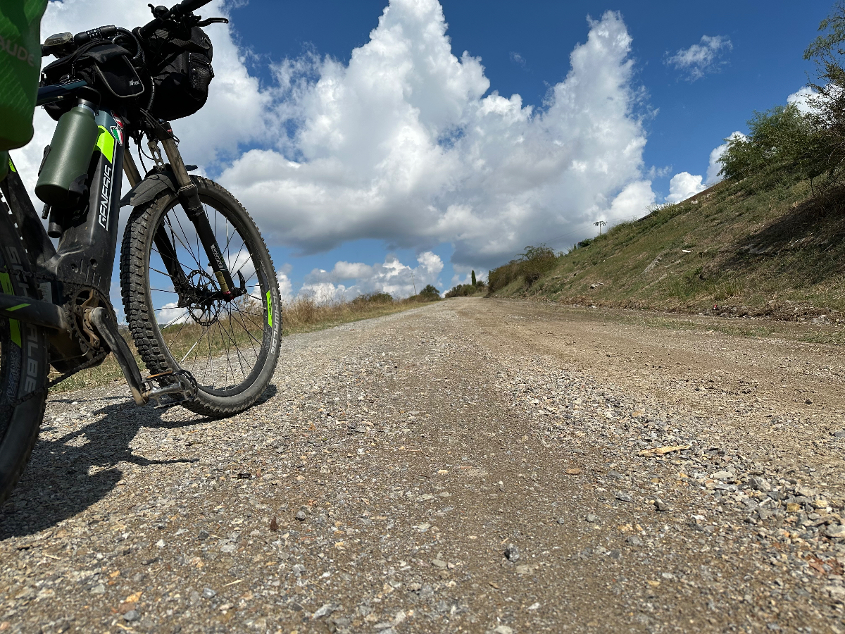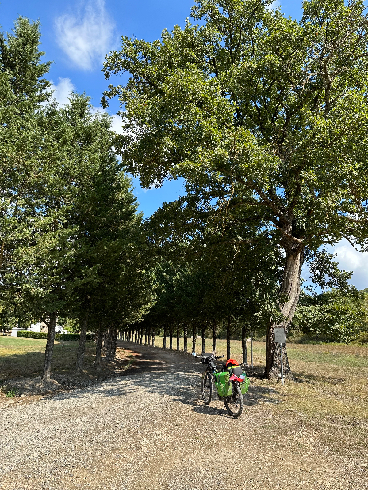 Nach meinem Frühstück, die Reste von gestern, Tomaten, Brot und Tee, geht es los. Zuerst gleich einmal den Berg wieder hinauf, aber dann soll es für lange Zeit hinunter gehen, bis ich auf Seeniveau angekommen bin. Von oben hat der See nicht so groß ausgesehen, aber ich fahre ca. 45 Minuten dem Ufer folgend, bis ich nach Bolsano komme. Der Ort liegt am nördlichen Ufer des Sees. Hier gibt es auch eine touristische Infrastruktur, Hotels, Camping, Seezugang. Noch einige Zeit folge ich dem Seeufer, ehe ich dann die Richtung ändere und den See verlasse. Sehr lange fahre ich heute auf der ss2 der Via Roma, bei relativ starkem Verkehr zügig dahin. Aber immer wieder verlasse ich die ss2, um den Franziskusweg zu befahren. Es gibt heute nur einige wenige Abschnitte, die fürs Rad eher wenig gut geeignet sind, verglichen mit dem, was schon hinter mir liegt, no problem. Wieder begegne ich vielen Pilgern, aber auch einige Radler sind wieder unterwegs. Heute habe ich den ersten Radfahrer mit einer österreichischen Flagge gesehen :-) Bei der Durchfahrt des Ortes Aquapendente muss ich meine Route suchen, denn es herrscht Markttag, es ist enorm viel los, ich muss mein Rad zwischen den Ständen durchschieben. Ich überlege gerade, links oder rechts weiter, da winkt mir ein vor einer Bar sitzender Radfahrer zu, um mir den rechten Weg zu weisen. Ich halte an dieser Bar und setze mich zu ihm. Er heißt Volker, kommt aus Deutschland und ist wie ich seit dem 22. August unterwegs. Sein Ziel heißt allerdings nicht Rom, sondern Ägypten. Er hat sein Zelt dabei und nächtigt immer auf Campingplätzen. Wir unterhalten uns einige Zeit, da gesellt sich eine weitere Radlerin zu uns, Sarah. Sarah und Volker sind sich schon zuvor begegnet. Sie kommt aus Australien, lebt aber in Neuseeland. Für zwei Wochen war sie mit dem Rucksack in den Südtiroler Bergen wandern, seither ist sie mit dem Rad, ausgehend vom Gardasee, gen Süden unterwegs. Ihr Ziel ist Malta. Ihr Rad hat sie aus Neuseeland mitgebracht. Es war sehr schön sich mit den beiden über unsere Erfahrungen auszutauschen. Noch ein Selfie fürs Album, dann trennen sich unsere Wege wieder. Bald erreiche ich die Grenze zwischen Lazio und der Toskana, und die Landschaft ändert auch gleich ich Gesicht. Die vorher freie Sicht über die Ebene mit Bergen in weiter Entfernung, wird nun durch erste, wellige Hügelverläufe bestimmt. An den Kämmen tauchen die ersten Zypressen Alleen auf, und es wird auch auf der Straße bergig. In der Ferne erscheint auf einem freistehenden Hügel eine Stadt mit einem alles überragenden Turm. Muss ich hoffentlich nicht da hinauf denke ich, doch bis zu meinem Ziel ist nicht mehr weit, es könnte passen. Und es passt, ich komme langsam näher. Die letzten 10 Kilometer haben es dann aber in sich. Ich hab schon zuvor im Höhenprofil der Tour gesehen, dass es steil bergauf geht. Zusätzlich sind diese letzten Kilometer auf einer Schotterpiste abzuleisten. Die Straße wurde wohl kürzlich neu mit grobem Schotter hergerichtet, das Material ist ziemlich lose, sehr schwer zu befahren. Und dann geht es richtig zur Sache, na servas die Wadln. Während ich mich hinauf plage, höre ich Im Kopf Hans Knaus sagen, „die Oberschenkel müssen brennen“, habe ich befolgt ;-) Mein Respekt für die Radler mit den „normalen“ Reiserädern ist groß, wenn sie auch wie z.B. Volker nur 18kg Gepäck mitschleppen. Bei solchen Steigungen und Straßenverhältnissen eine großartige Leistung, Hut ab!!