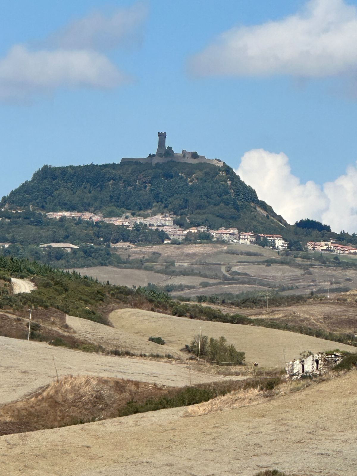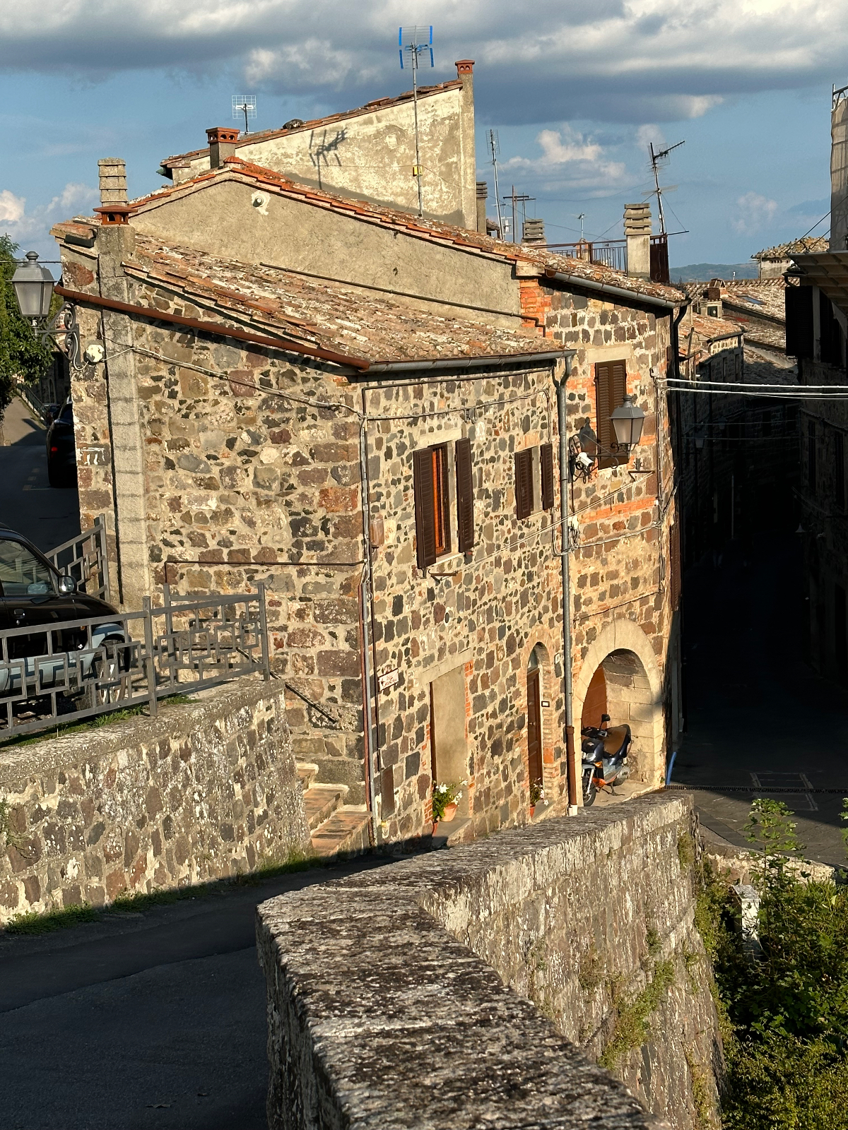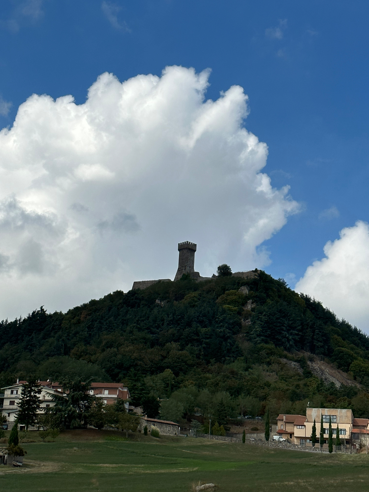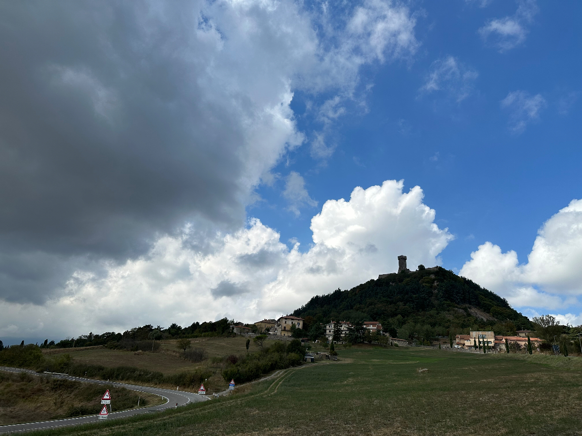 Ich erreiche Radicofani mit den ersten Regentropfen, es sieht nach Gewitter aus, aber es donnert nur in der Ferne. Ein sehr altes Bergdorf, eine Festung, und ein Turm den die Deutschen noch schnell vor Endes des Krieges weggesprengt haben. Ganz hinauf kann man leider nicht, es ist abgesperrt. Ich wohne heute in einem dieser historischen Gebäude. Meine Wohneinheit liegt auf Souterrain, vor dem Fenster spazieren Leute vorbei. Aber es ist sehr stimmig und sehr schön neu restauriert. Rohe Steinwände, neu verputzte Wände, die alten Holzbalken, ein schönes neues Badezimmer, eine Küchenzeile, und alles sehr sauber und gepflegt :-) Für Morgen habe ich in Siena reserviert, auch eine Buchungsbestätigung erhalten, dann aber einen Anruf erhalten, dass doch kein Zimmer frei ist. Es wurde mir aber eine Alternative angeboten, die ich akzeptiere, bin neugierig….