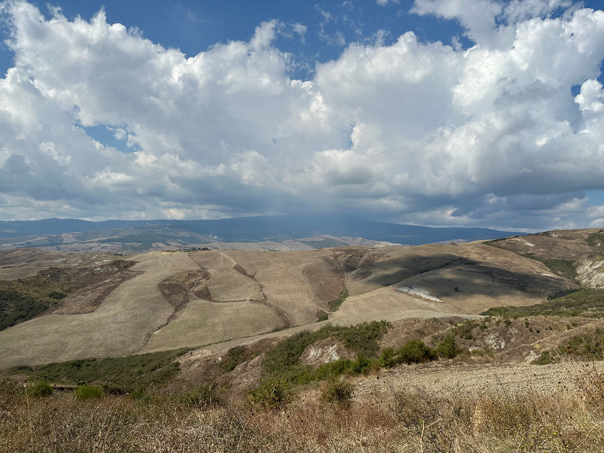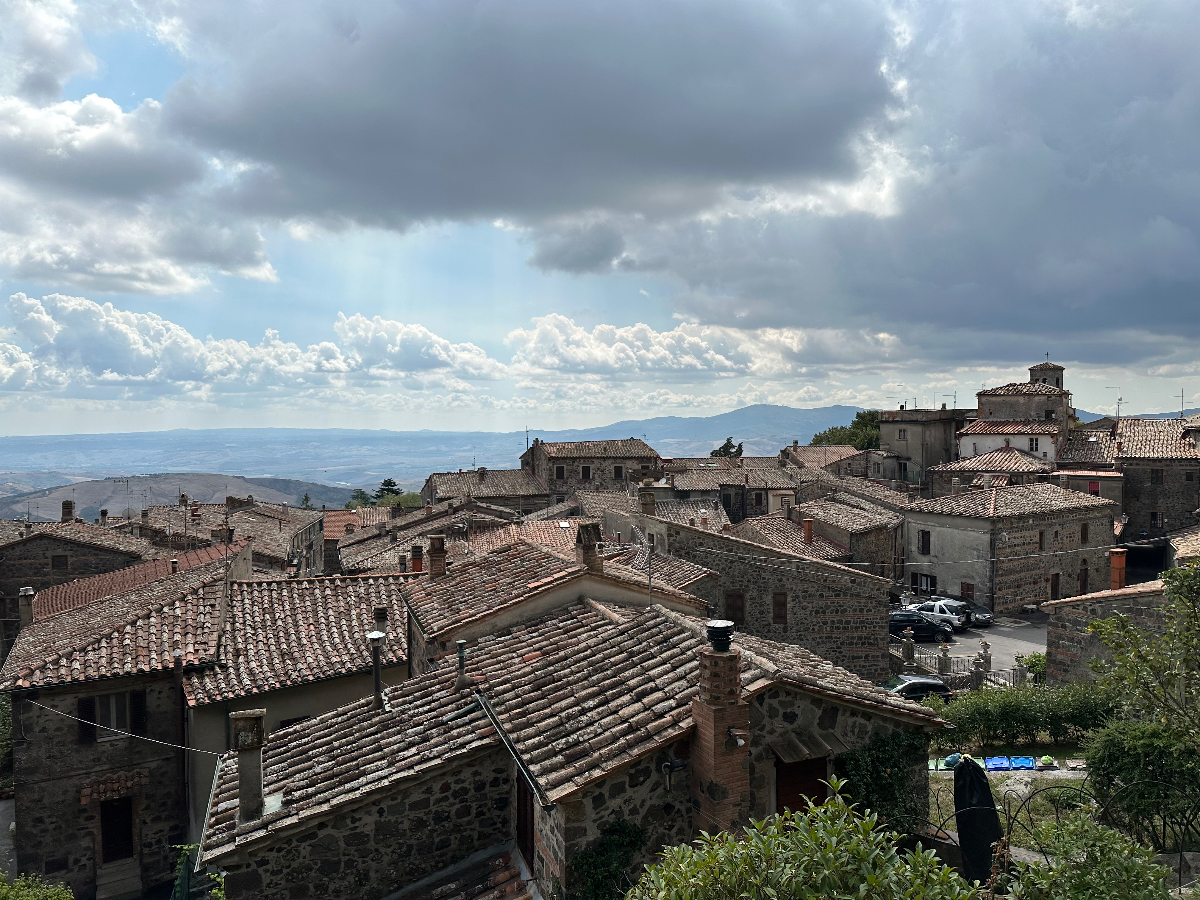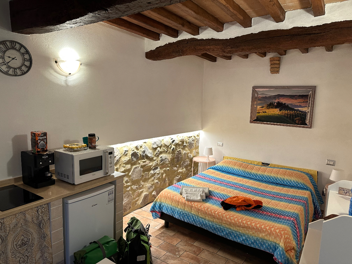 Ich erreiche Radicofani mit den ersten Regentropfen, es sieht nach Gewitter aus, aber es donnert nur in der Ferne. Ein sehr altes Bergdorf, eine Festung, und ein Turm den die Deutschen noch schnell vor Endes des Krieges weggesprengt haben. Ganz hinauf kann man leider nicht, es ist abgesperrt. Ich wohne heute in einem dieser historischen Gebäude. Meine Wohneinheit liegt auf Souterrain, vor dem Fenster spazieren Leute vorbei. Aber es ist sehr stimmig und sehr schön neu restauriert. Rohe Steinwände, neu verputzte Wände, die alten Holzbalken, ein schönes neues Badezimmer, eine Küchenzeile, und alles sehr sauber und gepflegt :-) Für Morgen habe ich in Siena reserviert, auch eine Buchungsbestätigung erhalten, dann aber einen Anruf erhalten, dass doch kein Zimmer frei ist. Es wurde mir aber eine Alternative angeboten, die ich akzeptiere, bin neugierig….