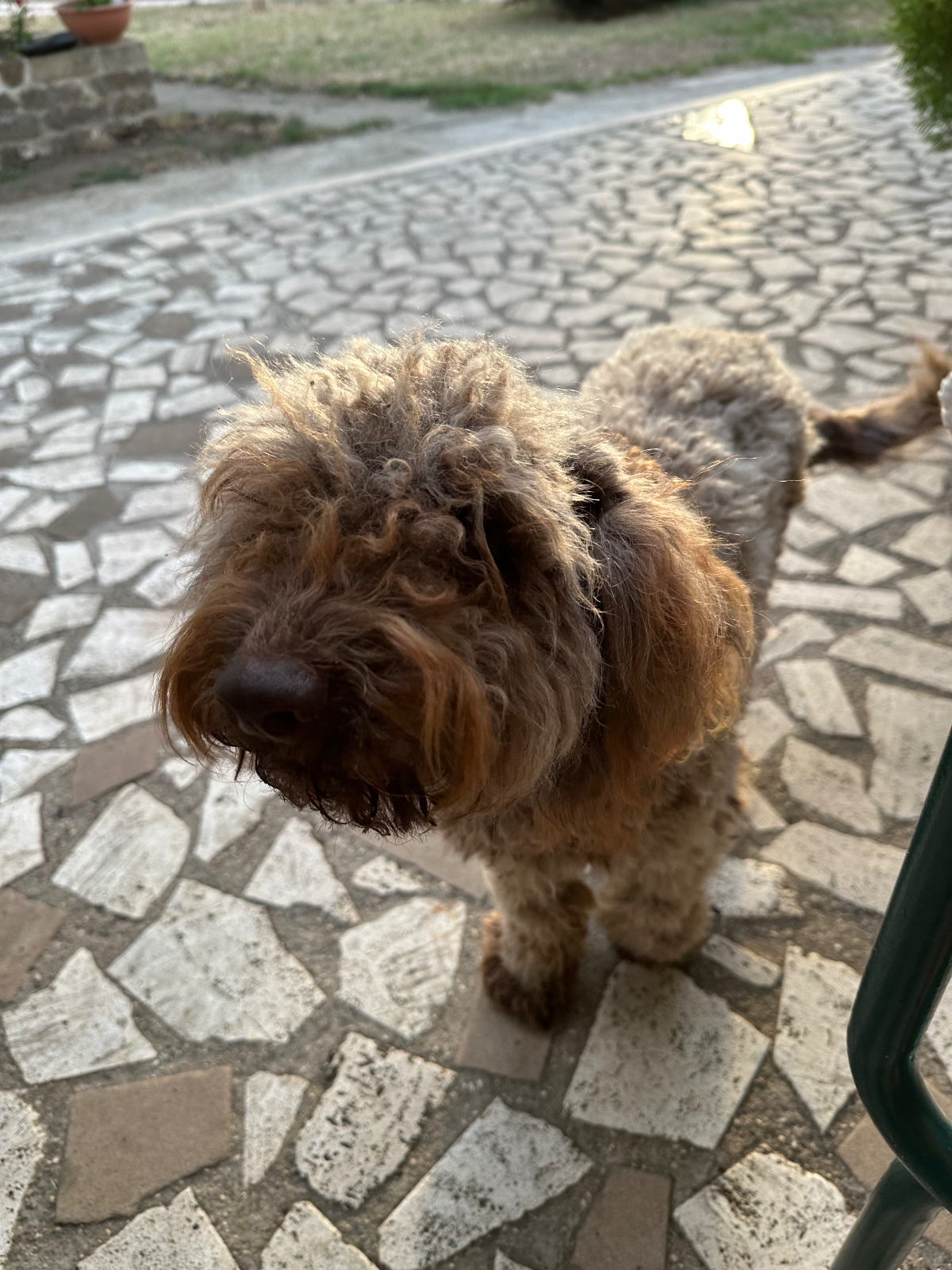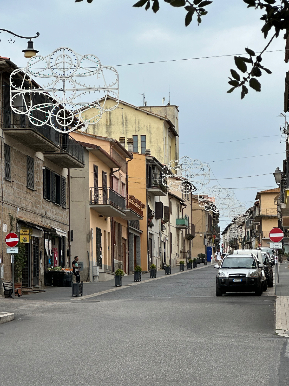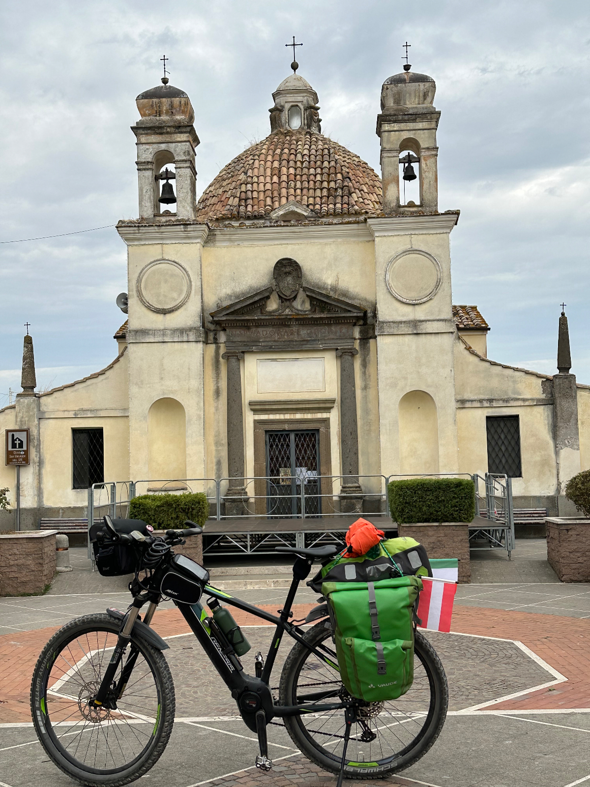 Nach nur zwei Kreuzungen im heftigen Frühverkehr, „bei nächster Gelegenheit rechts abbiegen“. Und da ist tatsächlich ein Radweg, und was für einer. Zweispurig, farblich markiert führt er mich direkt aus Rom hinaus, immer den Tiber entlang, und kein Stress, das gefällt mir! Übergangslos tauche ich dann in ein Naturschutz Reservat ein, der Radweg bleibt auch hier bestehen. Zum ersten Mal, seit ich hier in Italien bin, sehe ich Weidetiere, Kühe und Schafe grasen. Darüber hinaus sehe ich etliche Reitsporteinrichtungen entlang des Weges. Irgendwann endet aber die Idylle und der Wahnsinn der Straße hat mich wieder, aber das stresst mich längst nicht mehr so wie zu Anfang der Reise. In Casale Prima Porta treffe ich auch auf Radreisende, natürlich in meiner Gegenrichtung, unterwegs nach Rom, ich befinde mich am EV5 dem Eurovelo5, der streckenweise auch dem Franziskusweg folgt. An einer Bar mache ich dann Halt, um endlich mein Frühstück nachzuholen. An der Bar werde ich nach dem woher und wohin befragt, die Männer nicken anerkennend mit den Köpfen und ich werde sehr freundlich bedient. Zum wieder Eingrooven habe ich für heute bewusst eine kurze Etappe gewählt, an die 60km sollen heute reichen. Schon bald verlasse ich die Hauptstrass und es geht, mehr bergauf als bergab, hinein in eine hügelige Landschaft. Nicht sehr spektakulär, aber ich komme gut voran. Aber auch diese Straße verlasse ich bald, die Straße wird schmäler und schlechter. Erstmalig sehe ich ein Hinweisschild Strada Danneggiata, aber so schlimm ist der Zustand der Straße gar nicht, noch nicht. Vor mir taucht ein Ort auf, mit Häusern an den steilen Hängen verteilt, muss ich da hinauf? Ja ich muss, die Straße ist steil, aber es geht. An einer Kreuzung nehme ich die falsche Abzweigung, zu früh gefreut, zurück und weiter hinauf. Diesmal geht es wirklich steil nach oben. Ich fahre im niedrigsten Gang mit höchster Unterstützung durch ein paar Serpentinen, es ist so steil, dass mir das Vorderrad immer hochkommen will. Endlich oben ist aber noch nicht ganz oben angekommen, es geht weiter auf und ab. Dann biege ich in eine Staubstraße ein, die nach einigen km zu einem Feldweg wird, und schließlich stehe ich vor einer Abfahrt durch einen steilen Hohlweg. Hilft nichts, ich muss runter. Diesen Weg sollte ein Radfahrer nicht fahren müssen, ich rutsche und taumle da irgendwie hindurch, ein Glück dass ich grobstollige Reifen habe. Ich nehme mir vor, ab sofort die nächste geplante Route genauer im Detail zu checken, denn eigentlich dürfte Komoot nach meinen Vorgaben solche Streckenabschnitte niemals einbauen! Beim Nachlesen der heutigen Tour fand ich dann den Hinweis, an einigen Abschnitten der Tour werden sie ihr Rad schieben müssen…. danke Komoot, schieben wäre gar nicht möglich gewesen! Ich juble innerlich, als ich endlich wieder auf eine asphaltierte Straße komme, aber der Zustand dieser Straße ist einfach unbeschreiblich. Einen derartigen Löcher-und Fleckerlteppich von unterschiedlichstem Niveau habe ich noch nie befahren (müssen). Autos die entgegenkommen, springen mehr, als dass sie fahren, die Fahrwerke machen üble Geräusche. In Monterosi angekommen, ist es noch zu früh um mein Zimmer zu beziehen. Ich gehe etwas essen, wo auch einige Arbeiter ihr Mittagessen einnehmen. Das Ankommensbier geht da gleich mit ;-) Mein heutiges Quartier liegt am Ende einer Straße am Ortsende und wird von drei Hunden bewacht. Zwei Schäferhunde müssen leider in ein eigens umzäuntes Areal gesperrt werden, der Pudel darf bleiben und wir schließen Freundschaft. Meine nette Gastgeberin spricht noch ein wenig Deutsch, sie ist vor vierzig Jahren aus Sterzing hierhergezogen. Zimmer ist ok, groß genug und sehr sauber, Matratze halt der übliche Standard.