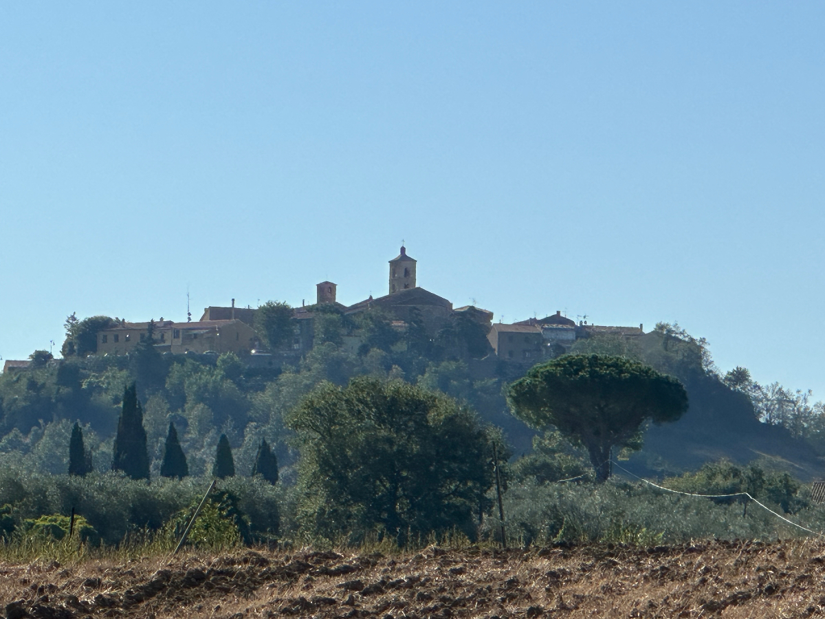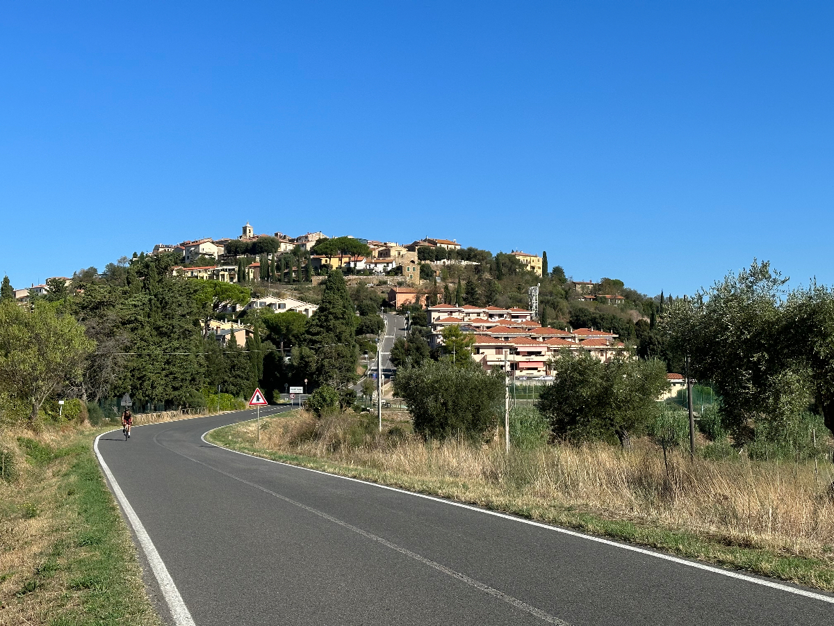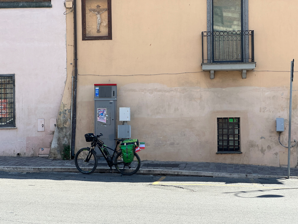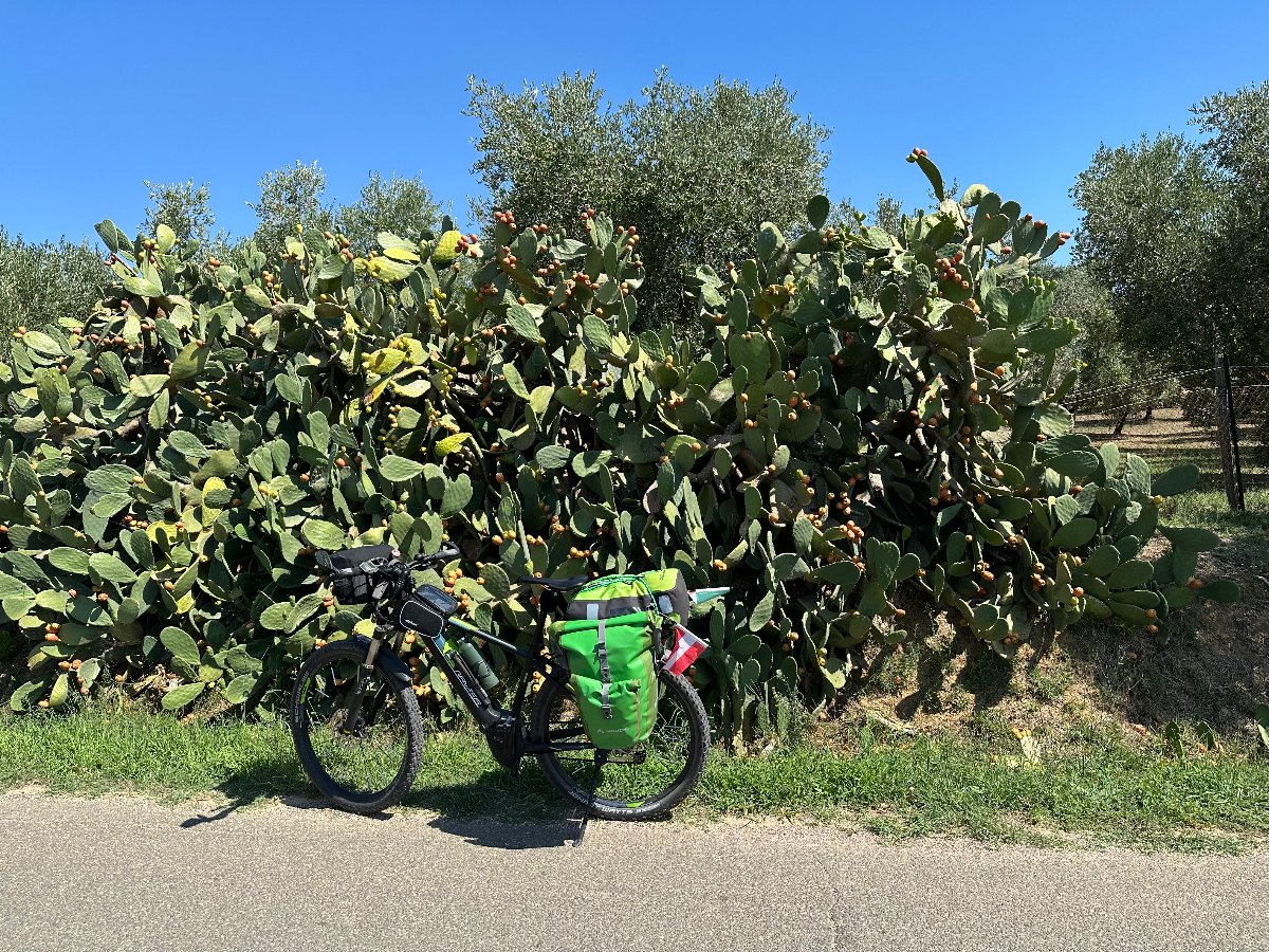 Wieder eine weiche Krippe, aber letzte Nacht habe ich das Bett ausgetrickst ;-) Es war ein Doppelbett mit geteilten Matratzen, und genau auf die Trennstelle habe ich mich gelegt, und bin nicht so tief eingesunken wie sonst mitten auf der Matratze. Dafür habe ich tief geschlafen, 8:06 Stunden und davon 3:11 Tiefschlaf. Ich vermute, die gestrige „Brettljause“ war nicht ganz astrein, in drei Durchgängen hat sich heute nach dem Aufstehen mein Körper von allem befreit, was offensichtlich nicht ganz in Ordnung war. Ein kleines Frühstück ließ ich mir dann aber gut schmecken. Das Navi lotst mich dann zuverlässig aus der Stadt, bis ich halt wieder auf einem Weg lande, der sich als Sackgasse entpuppt. Die ersten Mehrkilometer also schon am Morgen absolviert, es sollen nicht die letzten bleiben. Es geht zuerst auf einer heute nicht so stark befahrenen Straße dahin, wohl weil Samstag ist. Mir ist´s recht. Mit voller Turbounterstützung schraube ich mich über Serpentinen einen Berg hoch, und freue mich schon auf die Abfahrt, die mich auf der anderen Seite erwartet. Aber sie kommt nicht. Es geht immer weiter hinauf, und oben bleibe ich dann auch. Ich durchradle eine wunderschöne Toskanalandschaft, abgeerntete Felder wechseln sich mit weitläufigen Olivenhainen und Weinhängen ab, dazwischen tauchen oben auf den Hügeln Kirch-oder Wehrtürme von Ansiedelungen auf, an denen ich vorbeifahre. Es ist schon fast Mittag und bereits sehr heiß, als ich einer solchen Stadt Rast mache, Capalbio. Hoch oben thront eine Burg, es scheint ein beliebtes Ausflugsziel zu sein. Ich fülle mit einem Liter Wasser meine Speicher auf und fahre nach einer halben Stunde weiter. Irgendwann geht es dann doch wieder hinunter, eine Wohltat. Ich kämpfe den ganzen Tag mit dem Wind, der zumeist ein Gegenwind ist, und mir wegen der zusätzlichen Anstrengung, keine Abkühlung bringt. Bei meiner Buchung für heute habe ich ein Quartier an der Küste gewählt, einmal noch ans Meer, dachte ich mir dabei. Die Küste kommt und kommt aber nicht in Sicht, es ist bretteleben, die Berge liegen hinter mir, die Straßen endlos lang gerade, und kein Schatten bei dieser Hitze. An einer Abzweigung weist ein Schild nach Montalto die Castro, mein heutiges Ziel, eigentlich. Das Navi schickt mich aber in die andere Richtung, der ich folge, in der Hoffnung bald an der Küste zu sein. Ich erreiche Montalto die Castro auch irgendwann, aber der Ort liegt auf einem Hügel, der Umweg war sinnlos, wieder einmal. Das Navi schickt mich nach einigen Wirren für einige weitere km hinunter ins Tal. Dann kommt die Aufforderung, in einen Singletrail einzubiegen. Es reicht! Ich schaue auf Google, wo mein Hotel ist, und folge Google die gesamte Strecke wieder zurück hinauf. Ich zweifle schon an der Richtigkeit von Google, da es mich auf eine Fernverkehrsstrasse schickt, mit dem Hinweis, das Ziel sei in 300m erreicht. Aber es stimmt, das Hotel liegt an dieser Straße. Passt irgendwie eh zum heutigen Tag, nach 96km :-( Das Zimmer ist ok, das Restaurant öffnet erst um 20 Uhr. Seit einer Stunde ist es unglaublich laut geworden im Haus. Endlose Schreie in einer mir nicht bekannten Sprache, wildes Getrampel in den Gängen, Türen werden laut zugeschlagen, es ist als ob die Vandalen eingefallen wären. Ich war gerade an der Rezeption unten um zu klären, ob ich vielleicht früher essen könne. Frage, haben sie reserviert? Erstauntes Kopfschütteln meinerseits, und dann der Hammer, kein Platz für eine Person, vielleicht irgendwann später!? Geschenkt. Ich habe zum Glück noch einen Müsliriegel, und morgen beim Frühstück fülle ich wieder ordentlich auf ;-) Nach der heutigen Tour habe ich für morgen kürzer geplant, und diesmal wirklich an der Küste, hoffentlich! Und am Montag bin ich in Rom :-)))