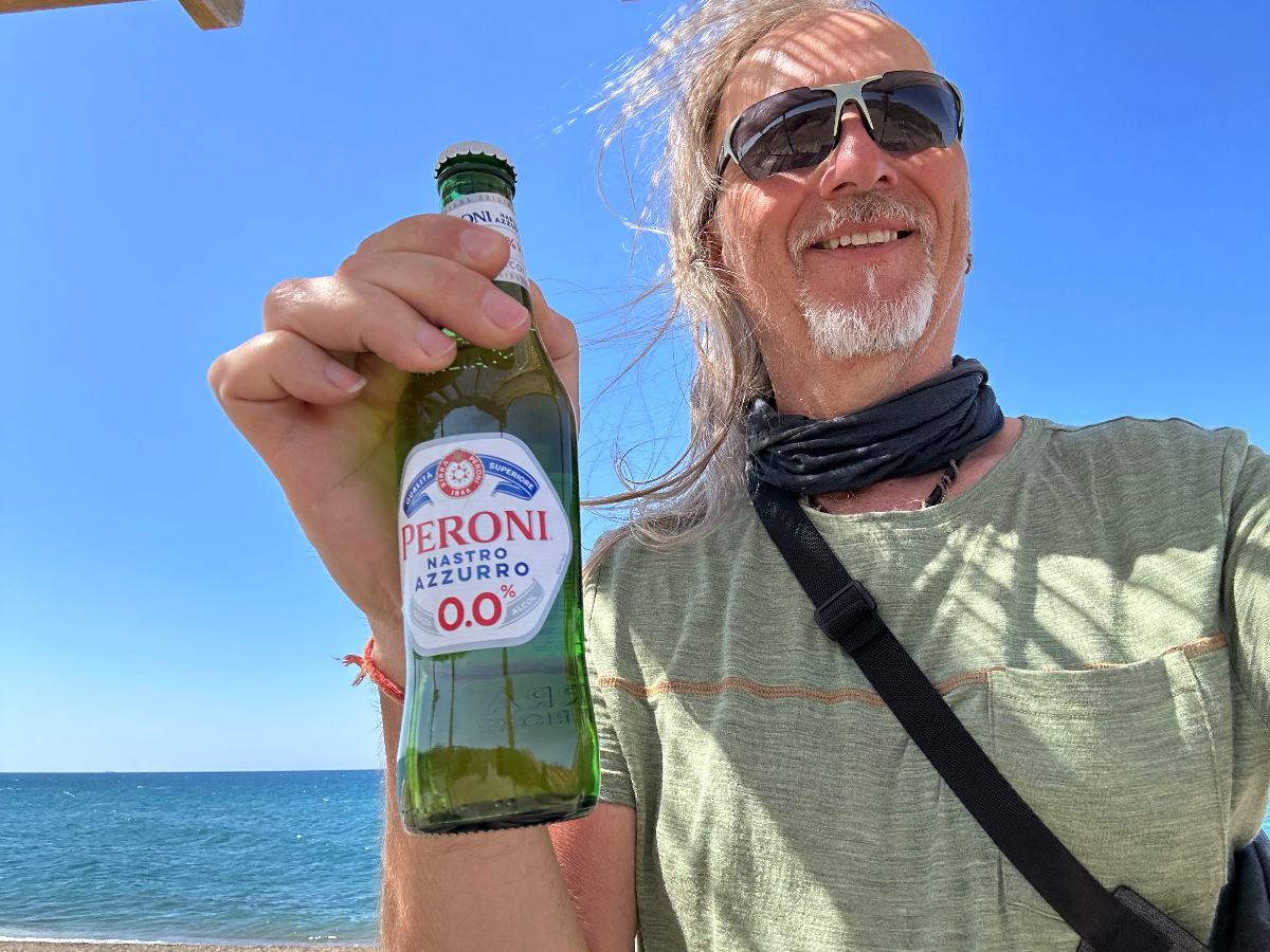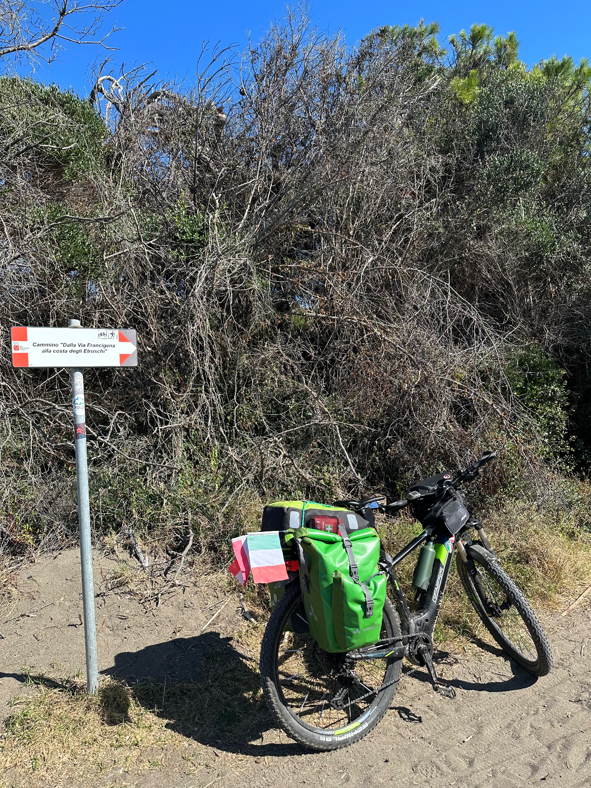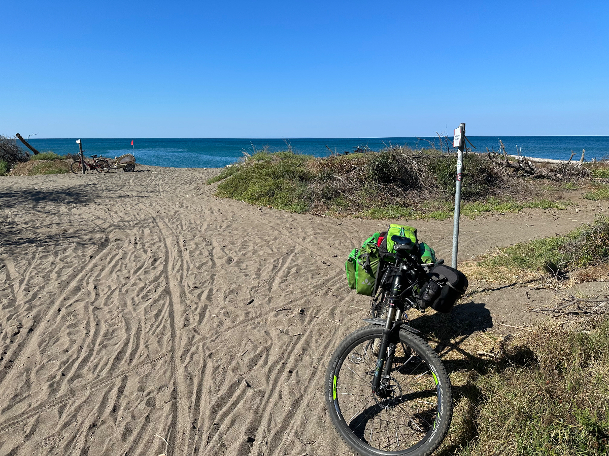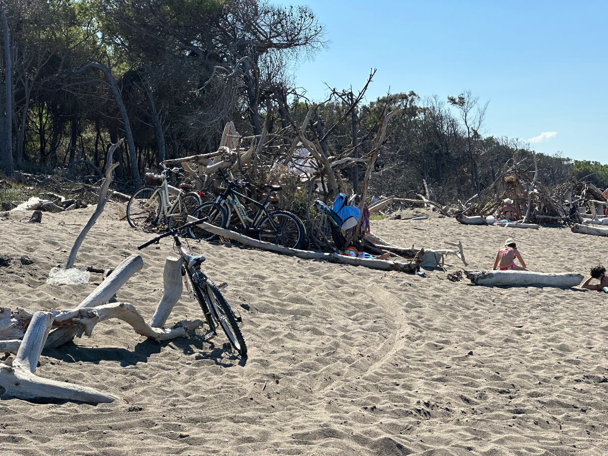 Der gestrige Tag hat geendet, wie er begonnen hat. Kein Frühstück, kein Abendessen. Dazwischen ein Brötchen, ein Eisbecher und ein Bier. Das heutige Frühstück ist demnach sehr umfangreich ausgefallen. Bisher waren die Eier im Buffet immer hartgekocht, so dachte ich auch beim heutigen Ei, das ich abzuschälen versuchte. Allerdings rann mir der Dotter des rohen Eis durch die Finger. Nun gut, war halt ein Versehen, das nächste wird sicher hart sein. War es wieder nicht, und so löffelte ich halt ein rohes, ganz leicht angekochtes Ei, natürlich gekühlt. Das Hotel lag in einem Vorort von Livorno, mit dem üblich heftigen Morgenverkehr war ich bald durch die Stadt am Hafen angelangt. Herrlich, endlich am Meer! Die Fähre nach Korsika liegt noch im Hafen, und draußen warten einige große Frachter auf ihre Einfahrt in den Hafen. Es geht einige Zeit entlang der Küste auf einem guten Radweg aus der Stadt hinaus, dann wie schon gewohnt, einreihen in den fließenden Verkehr und Gas, sprich alles geben, was die Beine – und der Motor - hergeben. Vom Meer weht eine steife Brise harauf, natürlich Gegenwind, war eh klar ;-) Es geht einige Hügel hinauf, das Meer immer in Riechweite. Bei einer Abfahrt in eine Senke muss ich sogar treten, so stark ist hier der Wind. Macht nichts, am Vormittag habe ich noch reichlich Power. Ich habe letzte Nacht sehr gut geschlafen, es war das bisher beste Bett meiner Reise, genau die richtige Härte, ich fühle mich fit :-) 45 km sind so schnell abgespult, ich bin um 10:30 schon bei Cecina. Dort beginnt ein Nationalpark, durch den man nur gehen UND radfahren darf. Über mehrere Kilometer erstreckt sich ein dichter Kiefernwald, es duftet unheimlich gut und ich mache meine erste Pause. Dieser Wald ist stellenweise mehrere 100m breit, immer zwischen der Straße und dem Meer gelegen. Nachdem ich lange gerade auf diesem wunderschönen Waldweg dahinradle, kommt eine Kurve in Richtung Meer. Laut Navi geht der Weg ganau daran entlang. Ich freu mich darauf, aber nur kurz, der Weg ist kein Weg mehr, es ist der Sand vom Strand, da habe ich mit meinem Gewicht keine Chance. Aber es lohnt ohnehin, hier abzusitzen und sich den Strand anzusehen. Obwohl so gut mit dem Fahrrad erreichbar, sind nur einige wenige Menschen an diesem Strand. Aus Treibholz und/oder abgebrochenen Ästen haben sie sich Unterstände gebaut. Das erinnert mich an unsere ersten Griechenland Urlaube als Jugendliche, wir hausten für Wochen auch nur wild an einem Strand, wir brauchten so wenig um glücklich zu sein. Heute darf´s schon ein bisserl mehr sein, eine Liege am Strand samt Sonnenschirm soll es wenn möglich schon sein ;-) Auf einem Alternativweg fahre ich dann noch einige Zeit durch diesen Duft-Wald, dann wieder hinaus auf die Straße. Mittlerweile ist es heiß geworden, im Wald war es so angenehm kühl, und kein Wind war zu spüren. Damit ist wieder Schluss. Das Fahren wird nun mühsamer, es zaaaaht sich dahin bei ständigem Gegen-oder Seitenwind. Nach einer langen Geraden halte ich bei einem Gemüsehändler an. Als sich mich aufrichte wird mir ganz schwindelig, ich bin benommen. Hab eh genug getrunken, denke ich mir, was ist da los? Tja, essen soll man halt auch. Mein kluges Handy hat mir heute geschrieben, dass ich seit 14 Tagen (heute Tag 15) einen erhöhten Energieverbrauch habe, 1880 Kalorien über dem Grundumsatz. Ich kaufe und esse 4 Tomaten und zwei Bananen und zwei Flaschen Wasser, setz mich in den Schatten, und warte bis es mir besser geht. Geht schon, und ist ja auch nicht mehr weit. Es ist magic, der Wind hat gedreht und bläst nun von hinten oder von der Seite, zur Straßenmitte hin. Ich biete ja auch genügend Angriffsfläche für den Wind. Dann endlich wieder ein Radweg, baulich getrennt von der Fahrbahn, super! Die Gegend in die ich nun komme, erscheint mir vertraut, war ich doch letztes Jahr mit Riki in diesem Gebiet im Urlaub. Für einen Tag waren wir an einem dieser wenig besuchten Strände, ganz viele schöne Erinnerungen kommen hoch. Ich halte nach einem Restaurant Ausschau, und finde es tatsächlich wieder. Hier habe ich uns mit Bier versorgt, das wir am Strand getrunken haben, und so mache ich es heute auch. Ein Holzsteig führt durch eine Wald mit Schirmakazien zum Strand und endet auf einer mit Schilf überdachten Bretterfläche. Mein Rad lasse ich zurück, wird schon noch da sein, wenn ich wiederkomme. Der Strand ist wie vor einem Jahr Jahr, beinahe menschenleer. Nur ganz verstreut stehen Sonnenschirme im Sand. Wie vor einem Jahr sitze ich unter dem Schilfdach im Halbschatten, genieße ein alkoholfreies Bier und hänge meinen Gedanken nach. Schon krass jetzt hier zu sein - und mit dem Rad hergekommen zu sein, heute sind es genau 1205 km geworden. Riki fährt ja nicht so gerne ein zweites mal an den selben Ort, aber ich wusste, hier komme ich nochmals her :-) Abgehakt ! Die letzten 5 von heute 85 km sind schnell erledigt, ich habe ein Quartier gebucht, das ich letztes Jahr im Vorüberfahren gesehen habe. Es ist eine große Anlage (kein all inkl.) mit Pizzeria, Gelateria, Waschsalon, Bike Shop und Werkstatt, Mini Market, Tennisplatz und drei Pools. Das Hauptklientel hier sind Italiener.