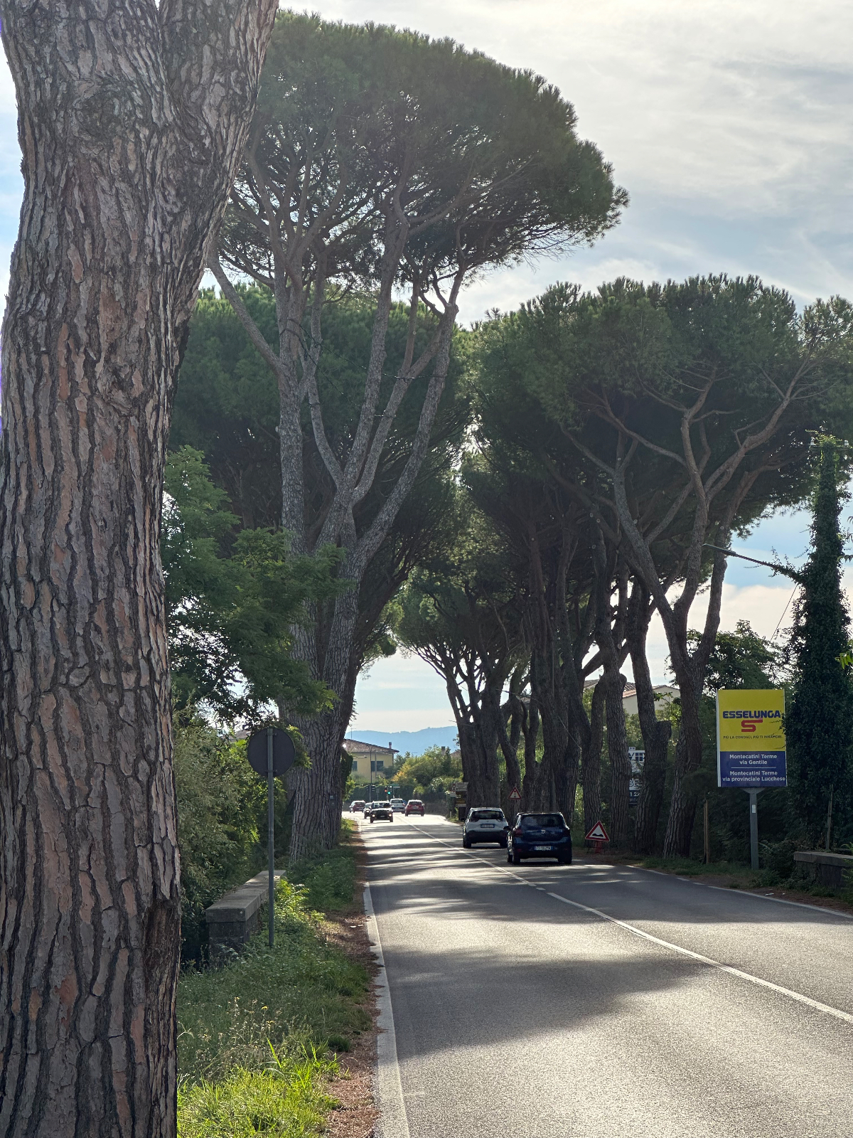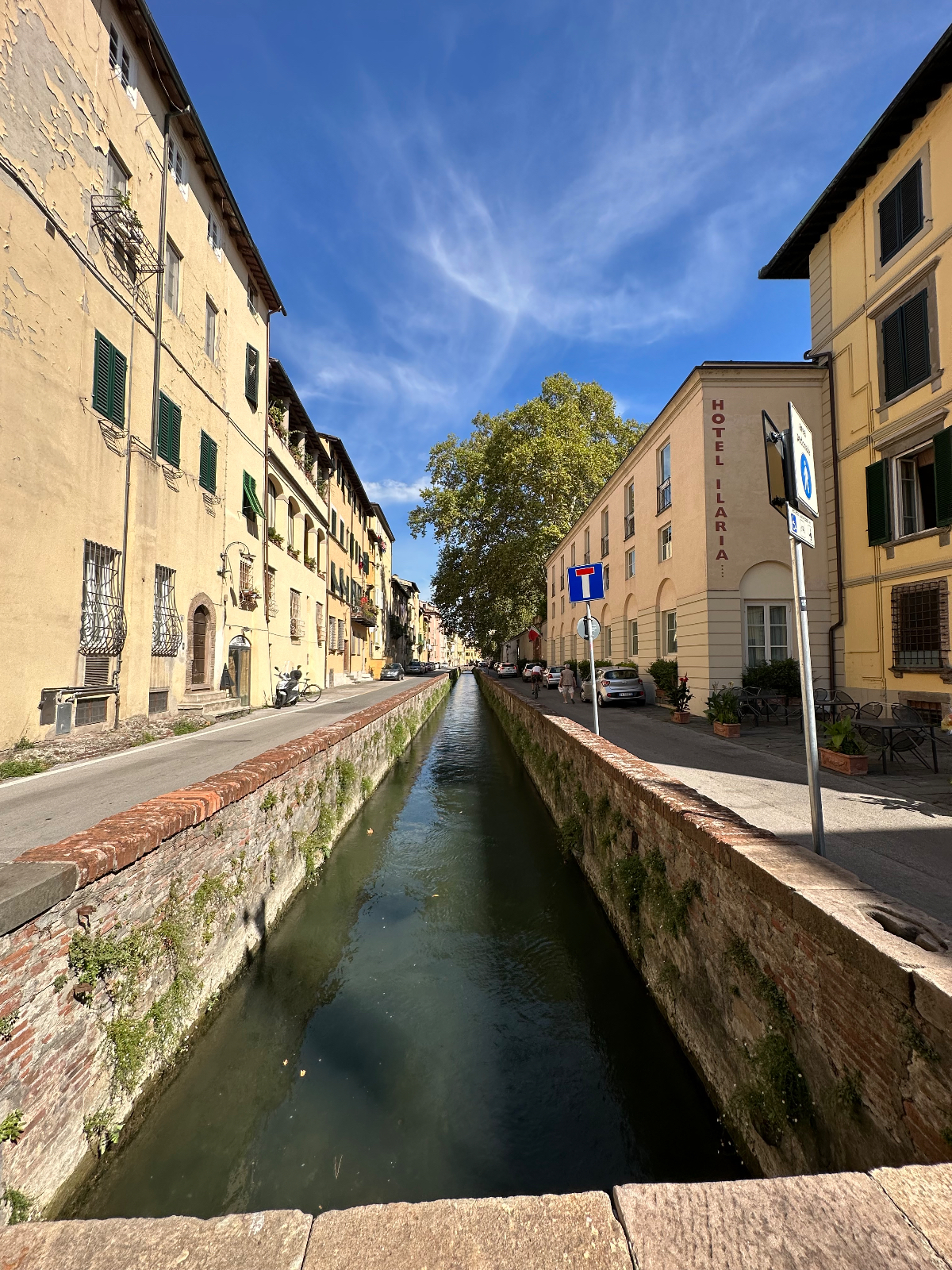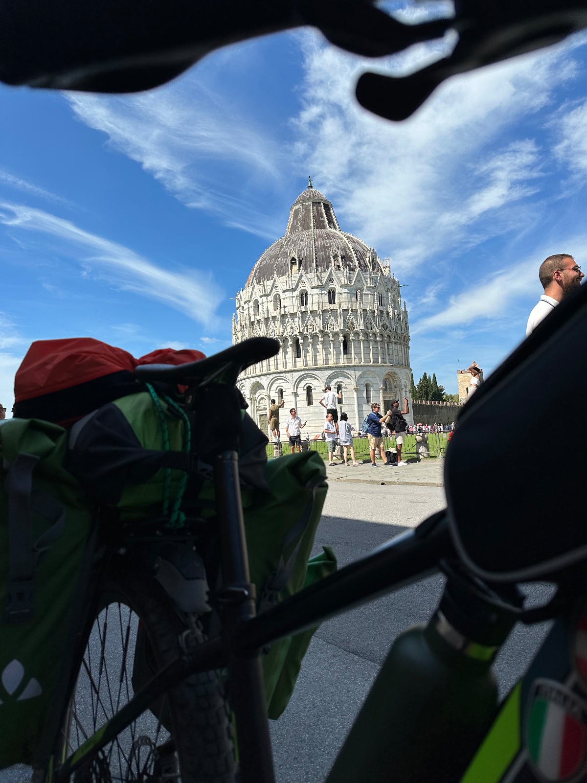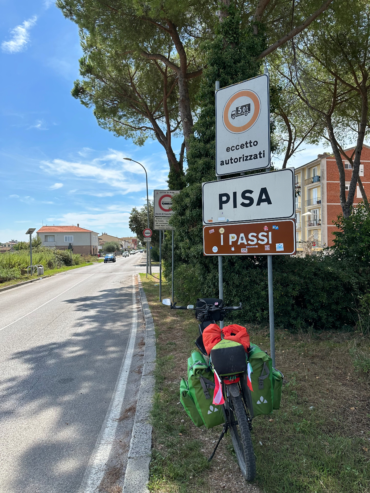 Die Unterkunft in Pistoia wird von Chiara und Fabio geführt, es handelt sich um ein Apartment in einer Wohnanlage im 3.Stock. Man trifft dort niemanden an, check in erfolgt online und man bekommt eine Zugangsmaske aufs Handy geschickt. Mittels vier Buttons wählt man das Gartentor, Hauseingang, Apartment und schließlich das Zimmer an. Doppelklick genügt, und die jeweilige Tür springt auf, wo sind die Zeiten als es noch Schlüssel gab ;-) Das Zimmer und Bad sind ok, es gibt einen Kühlschrank, leider ohne Inhalt, dafür röhrt er wie ein Helikopter. Trotzdem gut geschlafen, wie gewohnt und mittlerweile schon recht routiniert erfolgt das Packen und es kann losgehen, heute halt ohne Frühstück. Zum Glück gibt es einen Aufzug, ein sehr antiquiertes Modell allerdings. Zuerst eine Aussentür, dann eine Doppelpendeltür, die in die Kabine hinein öffnet, die ohnehin sehr klein ist. Mein Gepäck und ich haben gerade so Platz. Alle drei Türen müssen korrekt geschlossen sein, sonst fährt der no-speed Korb erst gar nicht los. Ich vermute, die meisten Bewohner nehmen lieber das Stiegenhaus. Mein Rad musste ich draussen stehen lassen, es ist noch da wo ich es abgestellt hatte :-) Es scheint nicht die feinste Gegend zu sein, unmittelbar beim Bahnhof gelegen. Das merkt man auch am Strom der Menschen, die vom Bahnhof kommend in die Stadt zur Arbeit unterwegs sind, als ich auf die Strasse fahre. Es ist wieder kurz nach acht, das Navi geleitet mich sicher aus Pistoia hinaus. Aber dann geht es los. Ich fahre beschildert und alternativlos auf einer sehr stark befahrenen Strasse in Richtung Lucca. Es herrscht das selbe Chaos auf der Strasse, wie auch bei uns am ersten Tag nach den Ferien. Meine Hoffnung diese Piste bald verlassen zu können, erfüllt sich leider nicht. Mit meiner Überbreite bin ich auf der ohnehin nicht breiten Strasse ein Hindernis für die Autos, mein Blick pendelt ständig zwischen der Fahrbahn um kein Schlagloch zu übersehen, dem Rückspiegel um zu sehen was von hinten auf mich zukommt, und aufs Navidisplay um ja keine Abzweigung zu übersehen. Es ist so laut, dass ich vom Navi nichts hören kann. Nach 20km Höllenritt muss ich mal runter von der Strasse, ich halte bei einer Bar und hole erstmal das Frühstück nach, ein Mortadella Panino und ein Croissant. Hilft nicht, ich muss weiter, es wird auch schon wieder warm, aber der Schweiß stammt wohl mehr von der hohen Konzentration und Trittfrequenz. Irgendwann wird es ruhiger und ich kann durchatmen, Nebenstrassen und sogar einige Meter Radwege folgen. Dann lotst mich das Navi auf eine Schotterpiste, der ein Feldweg folgt. Sehr angenehm denke ich noch, da steht ein Schild und weist darauf hin, dass der folgende Weg nur ein Fußweg ist. Ohne lange zu überlegen biege ich in den Weg ein, der bald nur noch ein Pfad ist. Von links und rechts überwachsen, Spinnfäden hängen von den Zweigen quer über den Pfad. Was soll´s, wird schon gehen denke ich mir, hat doch Komoot - die Software mit der ich meine Touren plane - diesen Weg vorgeschlagen. Es fällt mir ein dass ich schon mehrmals Erfahrungen von Radreisenden verfolgt habe, die davon berichten, dass Komoot hin und wieder Wege in eine Tour einbaut, die für Reiseräder ungeeignet sind. Und so ist auch dieser, nämlich ungeeignet mit einem Rad befahren zu werden, und schon gar nicht mit einer Fuhre wie der meinen. Folge dem Weg 1,4km habe ich noch gehört, dann geht es über grosse runde Steine teils steil bergan, voller Einsatz ist gefragt, und es geht immer weiter. Das Rad samt Gepäck klappert und tscheppert, und irgendwann bin ich doch oben, schweissgebadet. Nach dem Absteigen vom Rad kann ich meine Wirbelsäule erst nach einiger Zeit schmerzfrei aufrichten, und zwei Spinnenbisse unter dem Knie habe ich auch erhalten. An dieser Stelle führt eine Schotterpiste vorbei, und gegen den Protest des Navi, das mich weiter auf diesen Trail schicken möchte, nehme ich diese Piste. Nach einigen km treffe ich eh wieder auf meine Route, geschafft. Und auch wieder etwas gelernt, Fußwege heissen Fußwege weil es Fußwege sind, Punkt! Bei der Weiterfahrt kommen mir Wanderer entgegen und dann vereinzelt weitere. Dann sehe ich das Schild, ich befinde mich gerade auf einem Abschnitt des Franziskuswegs, der via Francigena nord, den ich in Gegenrichtung fahre. Also sind diese Wanderer Pilger, wie ich unterwegs nach Rom. Ich fahre ja nicht die direkte Route, morgen fahre ich entlang der ligurischen Küste nach Piombino hinunter, und dann irgendwie weiter nach Rom. Bald darauf ist Lucca erreicht, wow, was für eine Stadt. Auf der Stadtmauer kann man die ganze Altstadt umrunden, dazu werde ich nochmals herkommen, und ich weiß auch schon, wer mich da gerne begleiten wird :-) Es ist auffallend, dass gegenüber den letzten Tagen sehr viele Familien mit kleinen, noch nicht schulpflichtigen Kindern unterwegs sind. Mehrheitlich Touristen bevölkern die schönen Gassen und Plätze, direkt vor dem Dom lasse ich mich nieder und geniesse einen Eisbecher und sehe dem Treiben zu. Ich kann nicht sagen ob es immer schon so war, aber es kommt hier in Italien niemand zum kassieren an den Tisch, alle Gäste gehen hinein um zu bezahlen, so auch ich. Dann schlendere ich über den Vorplatz zum Dom und greife zum Handy um Fotos zu machen. Kein Handy da wo es sein sollte, Panik! Zurück zur Bar liegt es noch an dem Platz, an dem ich es liegen ließ. Im Dom zünde ich dann eine Kerze an ......... Am Eingang zum Dom hängt ein Schild, SILENZIO, davon ist drinnen nichts zu merken, es ähnelt ohnehin mehr einem Museum. Ganz vorne unter dem Altar, liegt eine Reliquie, wohl die Leiche eines Heiligen oder sonstig Verehrten. Mit diesem Kult kann ich nicht viel anfangen, es erinnert mich an die vielen derartigen Reliquien am spanischen Jakobsweg. Interessante Bauwerke sind diese Kirchen und Kathedralen mit Sicherheit, doch wieviel Blut, Schweiß und Tränen von Ausgebeuteten haben diese Mauern schon gesehen ..... Anyway, es is