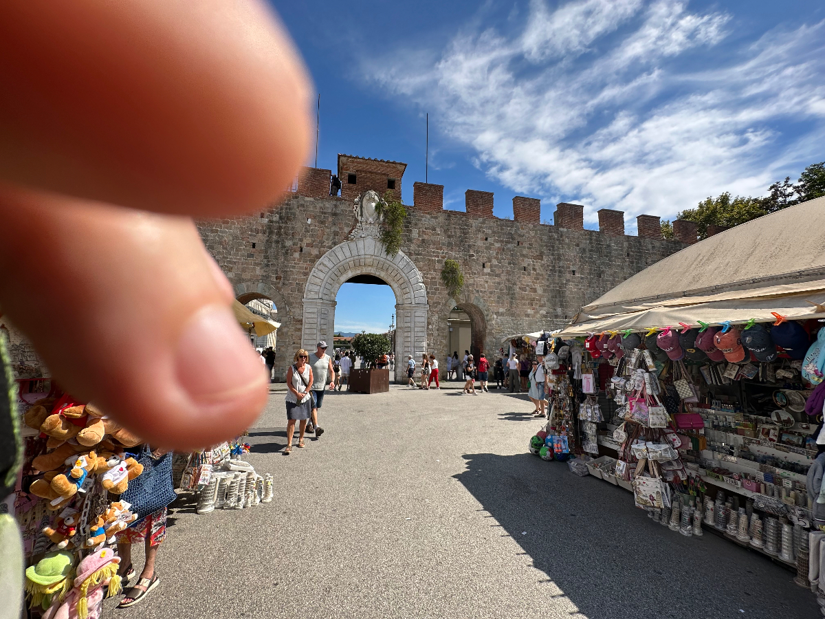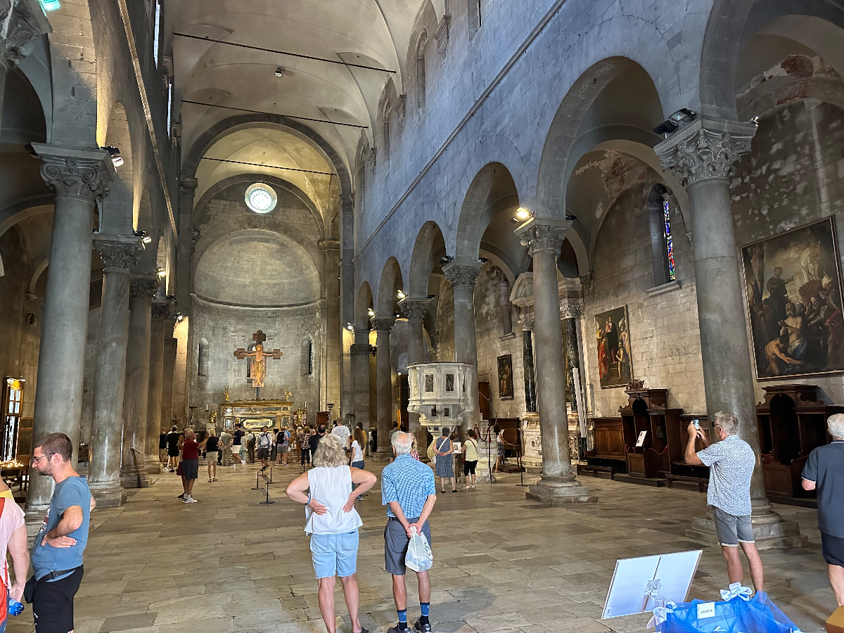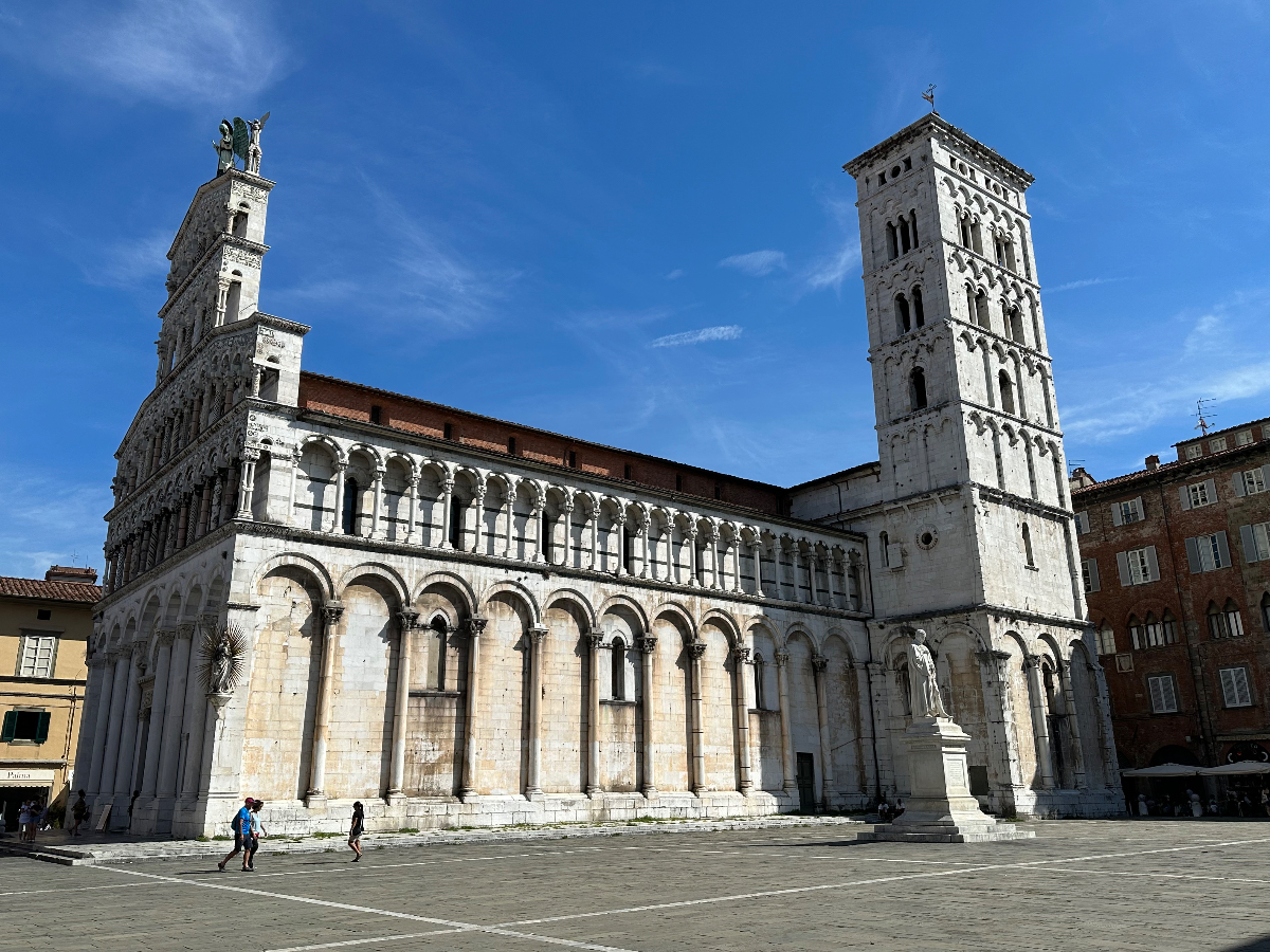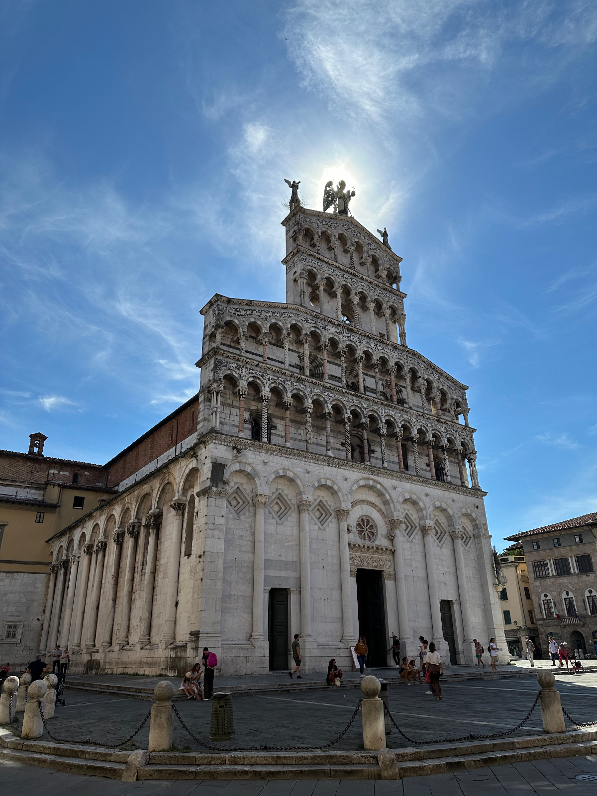Die Unterkunft in Pistoia wird von Chiara und Fabio geführt, es handelt sich um ein Apartment in einer Wohnanlage im 3.Stock. Man trifft dort niemanden an, check in erfolgt online und man bekommt eine Zugangsmaske aufs Handy geschickt. Mittels vier Buttons wählt man das Gartentor, Hauseingang, Apartment und schließlich das Zimmer an. Doppelklick genügt, und die jeweilige Tür springt auf, wo sind die Zeiten als es noch Schlüssel gab ;-) Das Zimmer und Bad sind ok, es gibt einen Kühlschrank, leider ohne Inhalt, dafür röhrt er wie ein Helikopter. Trotzdem gut geschlafen, wie gewohnt und mittlerweile schon recht routiniert erfolgt das Packen und es kann losgehen, heute halt ohne Frühstück. Zum Glück gibt es einen Aufzug, ein sehr antiquiertes Modell allerdings. Zuerst eine Aussentür, dann eine Doppelpendeltür, die in die Kabine hinein öffnet, die ohnehin sehr klein ist. Mein Gepäck und ich haben gerade so Platz. Alle drei Türen müssen korrekt geschlossen sein, sonst fährt der no-speed Korb erst gar nicht los. Ich vermute, die meisten Bewohner nehmen lieber das Stiegenhaus. Mein Rad musste ich draussen stehen lassen, es ist noch da wo ich es abgestellt hatte :-) Es scheint nicht die feinste Gegend zu sein, unmittelbar beim Bahnhof gelegen. Das merkt man auch am Strom der Menschen, die vom Bahnhof kommend in die Stadt zur Arbeit unterwegs sind, als ich auf die Strasse fahre. Es ist wieder kurz nach acht, das Navi geleitet mich sicher aus Pistoia hinaus. Aber dann geht es los. Ich fahre beschildert und alternativlos auf einer sehr stark befahrenen Strasse in Richtung Lucca. Es herrscht das selbe Chaos auf der Strasse, wie auch bei uns am ersten Tag nach den Ferien. Meine Hoffnung diese Piste bald verlassen zu können, erfüllt sich leider nicht. Mit meiner Überbreite bin ich auf der ohnehin nicht breiten Strasse ein Hindernis für die Autos, mein Blick pendelt ständig zwischen der Fahrbahn um kein Schlagloch zu übersehen, dem Rückspiegel um zu sehen was von hinten auf mich zukommt, und aufs Navidisplay um ja keine Abzweigung zu übersehen. Es ist so laut, dass ich vom Navi nichts hören kann. Nach 20km Höllenritt muss ich mal runter von der Strasse, ich halte bei einer Bar und hole erstmal das Frühstück nach, ein Mortadella Panino und ein Croissant. Hilft nicht, ich muss weiter, es wird auch schon wieder warm, aber der Schweiß stammt wohl mehr von der hohen Konzentration und Trittfrequenz. Irgendwann wird es ruhiger und ich kann durchatmen, Nebenstrassen und sogar einige Meter Radwege folgen. Dann lotst mich das Navi auf eine Schotterpiste, der ein Feldweg folgt. Sehr angenehm denke ich noch, da steht ein Schild und weist darauf hin, dass der folgende Weg nur ein Fußweg ist. Ohne lange zu überlegen biege ich in den Weg ein, der bald nur noch ein Pfad ist. Von links und rechts überwachsen, Spinnfäden hängen von den Zweigen quer über den Pfad. Was soll´s, wird schon gehen denke ich mir, hat doch Komoot - die Software mit der ich meine Touren plane - diesen Weg vorgeschlagen. Es fällt mir ein dass ich schon mehrmals Erfahrungen von Radreisenden verfolgt habe, die davon berichten, dass Komoot hin und wieder Wege in eine Tour einbaut, die für Reiseräder ungeeignet sind. Und so ist auch dieser, nämlich ungeeignet mit einem Rad befahren zu werden, und schon gar nicht mit einer Fuhre wie der meinen. Folge dem Weg 1,4km habe ich noch gehört, dann geht es über grosse runde Steine teils steil bergan, voller Einsatz ist gefragt, und es geht immer weiter. Das Rad samt Gepäck klappert und tscheppert, und irgendwann bin ich doch oben, schweissgebadet. Nach dem Absteigen vom Rad kann ich meine Wirbelsäule erst nach einiger Zeit schmerzfrei aufrichten, und zwei Spinnenbisse unter dem Knie habe ich auch erhalten. An dieser Stelle führt eine Schotterpiste vorbei, und gegen den Protest des Navi, das mich weiter auf diesen Trail schicken möchte, nehme ich diese Piste. Nach einigen km treffe ich eh wieder auf meine Route, geschafft. Und auch wieder etwas gelernt, Fußwege heissen Fußwege weil es Fußwege sind, Punkt! Bei der Weiterfahrt kommen mir Wanderer entgegen und dann vereinzelt weitere. Dann sehe ich das Schild, ich befinde mich gerade auf einem Abschnitt des Franziskuswegs, der via Francigena nord, den ich in Gegenrichtung fahre. Also sind diese Wanderer Pilger, wie ich unterwegs nach Rom. Ich fahre ja nicht die direkte Route, morgen fahre ich entlang der ligurischen Küste nach Piombino hinunter, und dann irgendwie weiter nach Rom. Bald darauf ist Lucca erreicht, wow, was für eine Stadt. Auf der Stadtmauer kann man die ganze Altstadt umrunden, dazu werde ich nochmals herkommen, und ich weiß auch schon, wer mich da gerne begleiten wird :-) Es ist auffallend, dass gegenüber den letzten Tagen sehr viele Familien mit kleinen, noch nicht schulpflichtigen Kindern unterwegs sind. Mehrheitlich Touristen bevölkern die schönen Gassen und Plätze, direkt vor dem Dom lasse ich mich nieder und geniesse einen Eisbecher und sehe dem Treiben zu. Ich kann nicht sagen ob es immer schon so war, aber es kommt hier in Italien niemand zum kassieren an den Tisch, alle Gäste gehen hinein um zu bezahlen, so auch ich. Dann schlendere ich über den Vorplatz zum Dom und greife zum Handy um Fotos zu machen. Kein Handy da wo es sein sollte, Panik! Zurück zur Bar liegt es noch an dem Platz, an dem ich es liegen ließ. Im Dom zünde ich dann eine Kerze an ......... Am Eingang zum Dom hängt ein Schild, SILENZIO, davon ist drinnen nichts zu merken, es ähnelt ohnehin mehr einem Museum. Ganz vorne unter dem Altar, liegt eine Reliquie, wohl die Leiche eines Heiligen oder sonstig Verehrten. Mit diesem Kult kann ich nicht viel anfangen, es erinnert mich an die vielen derartigen Reliquien am spanischen Jakobsweg. Interessante Bauwerke sind diese Kirchen und Kathedralen mit Sicherheit, doch wieviel Blut, Schweiß und Tränen von Ausgebeuteten haben diese Mauern schon gesehen ..... Anyway, es is