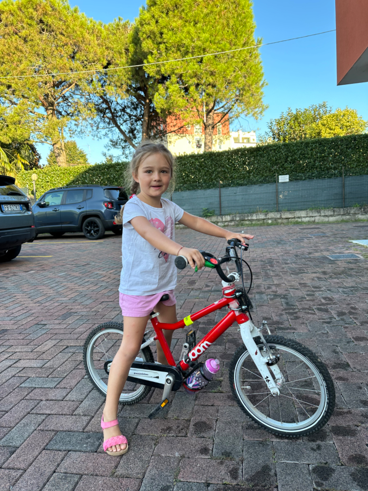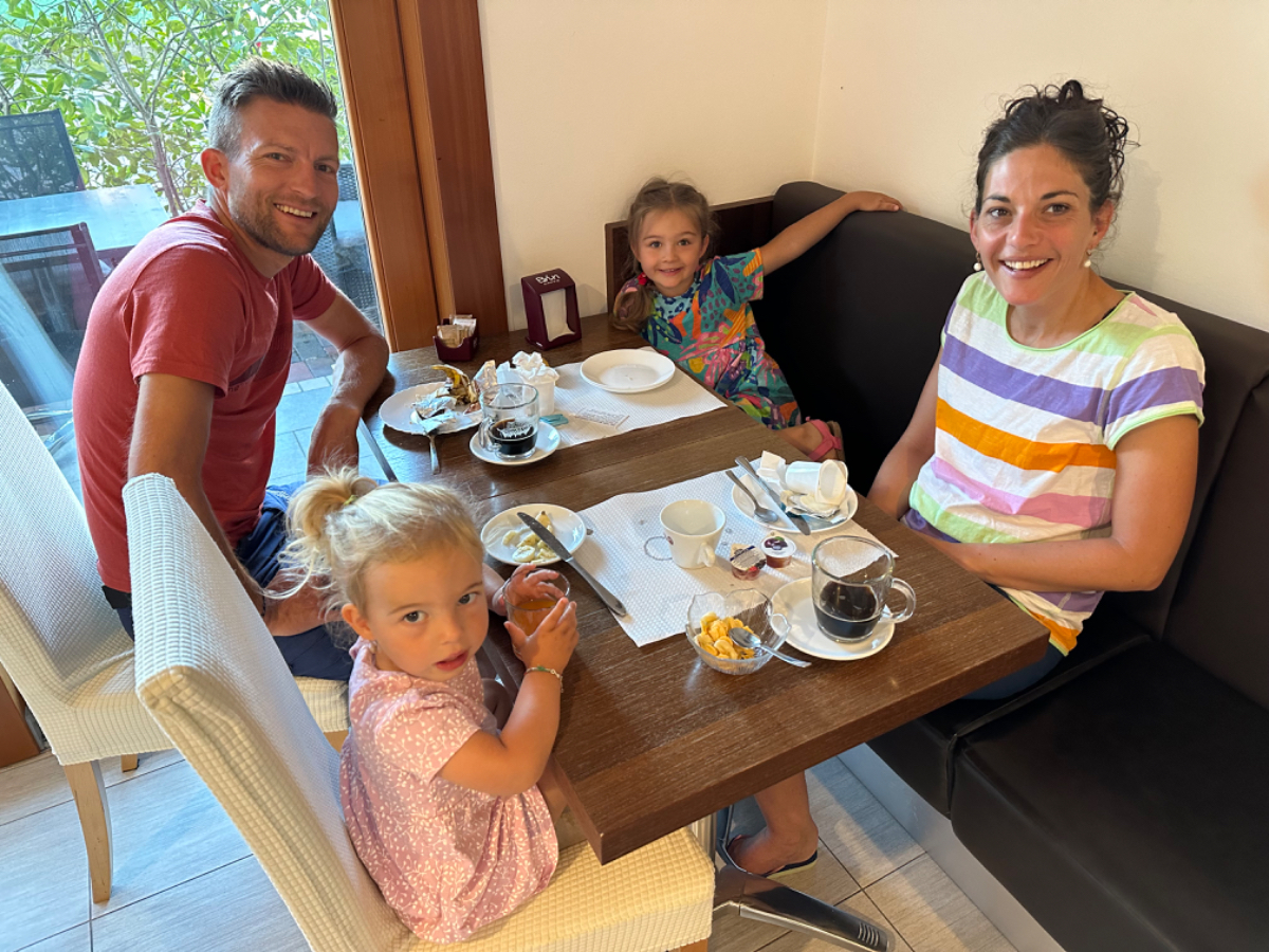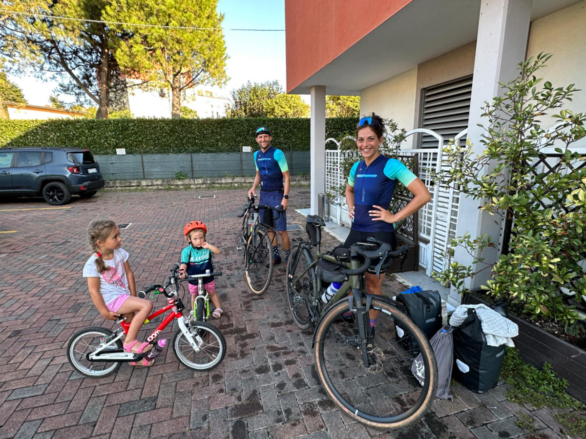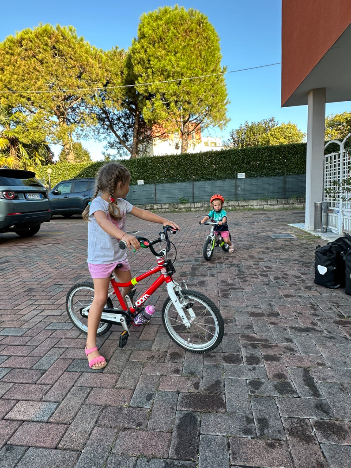 Als ich gestern von meiner Innenstadtrunde zurück ins Hotel kam, war da inzwischen eine junge Familie aus dem Schwarzwald angekommen, Eltern und zwei entzückende kleine Mädchen. Wie ich sind sie mit Rädern unterwegs. Gestartet sind sie in Innsbruck, ihr Ziel ist Venedig. Beim Frühstück haben wir uns heute wieder getroffen und ein wenig geplaudert. Sie werden heute Venedig erreichen. Ich habe großen Respekt vor dieser netten Familie, ich stelle mir vor dass es nicht einfach ist mit zwei kleinen Kindern, aber die beiden Mädchen wirken dermaßen entspannt, sie machen das auch nicht zum ersten Mal. Die kleinere, Leni, ist zweieinhalb, sie fährt im Anhänger mit, ihre große Schwester Amelie fährt die ganze Strecke auf ihrem Rad, das mit einer Stange mit dem Rad ihrer Mama verbunden ist. Amelie wird in der kommenden Woche fünf, alles Gute liebe Amelie :-)