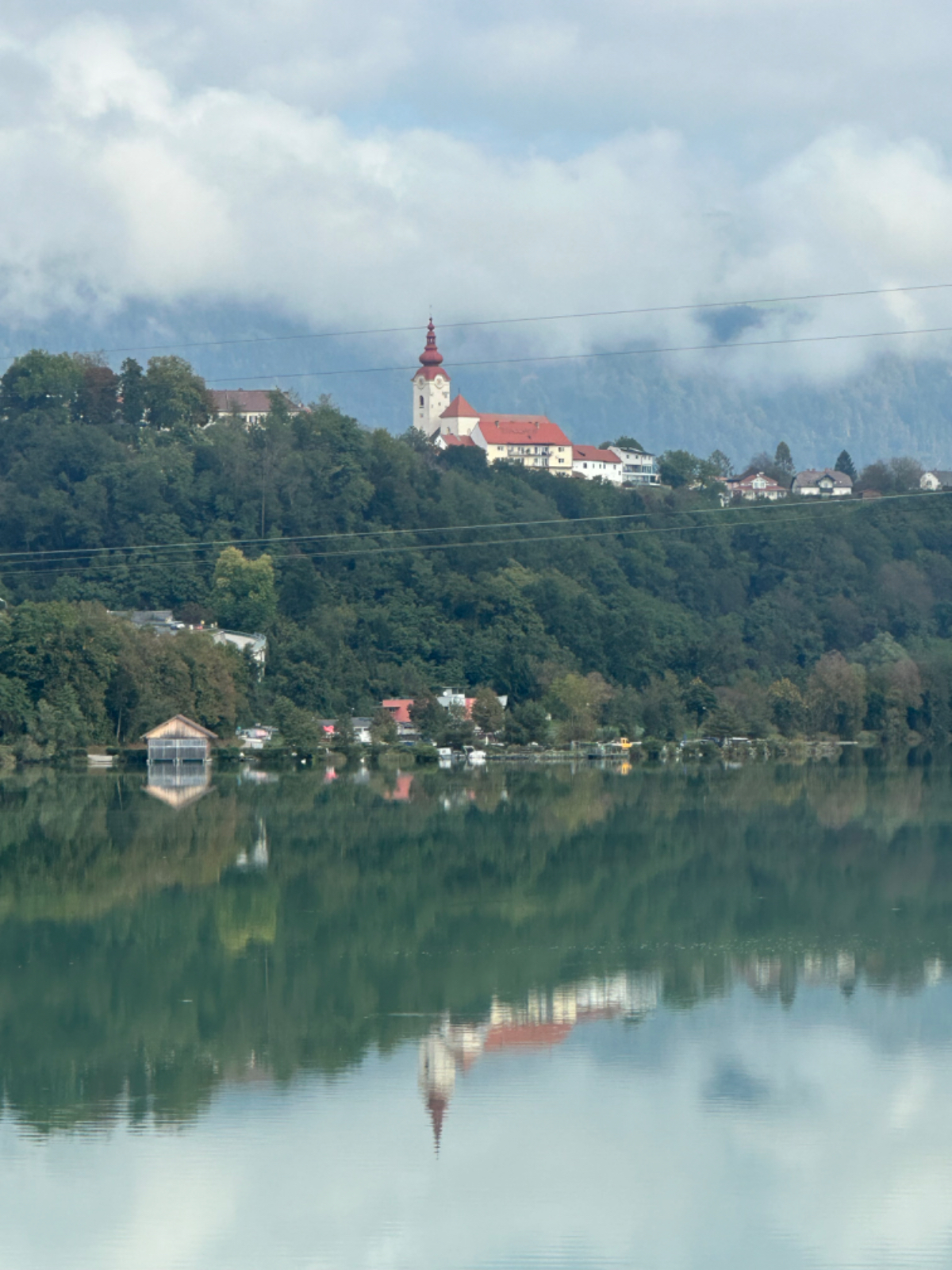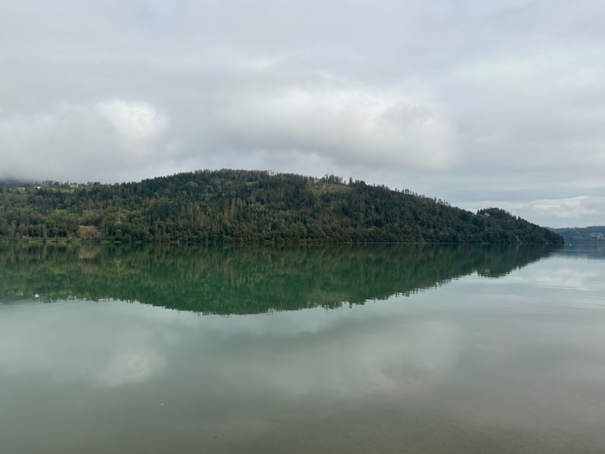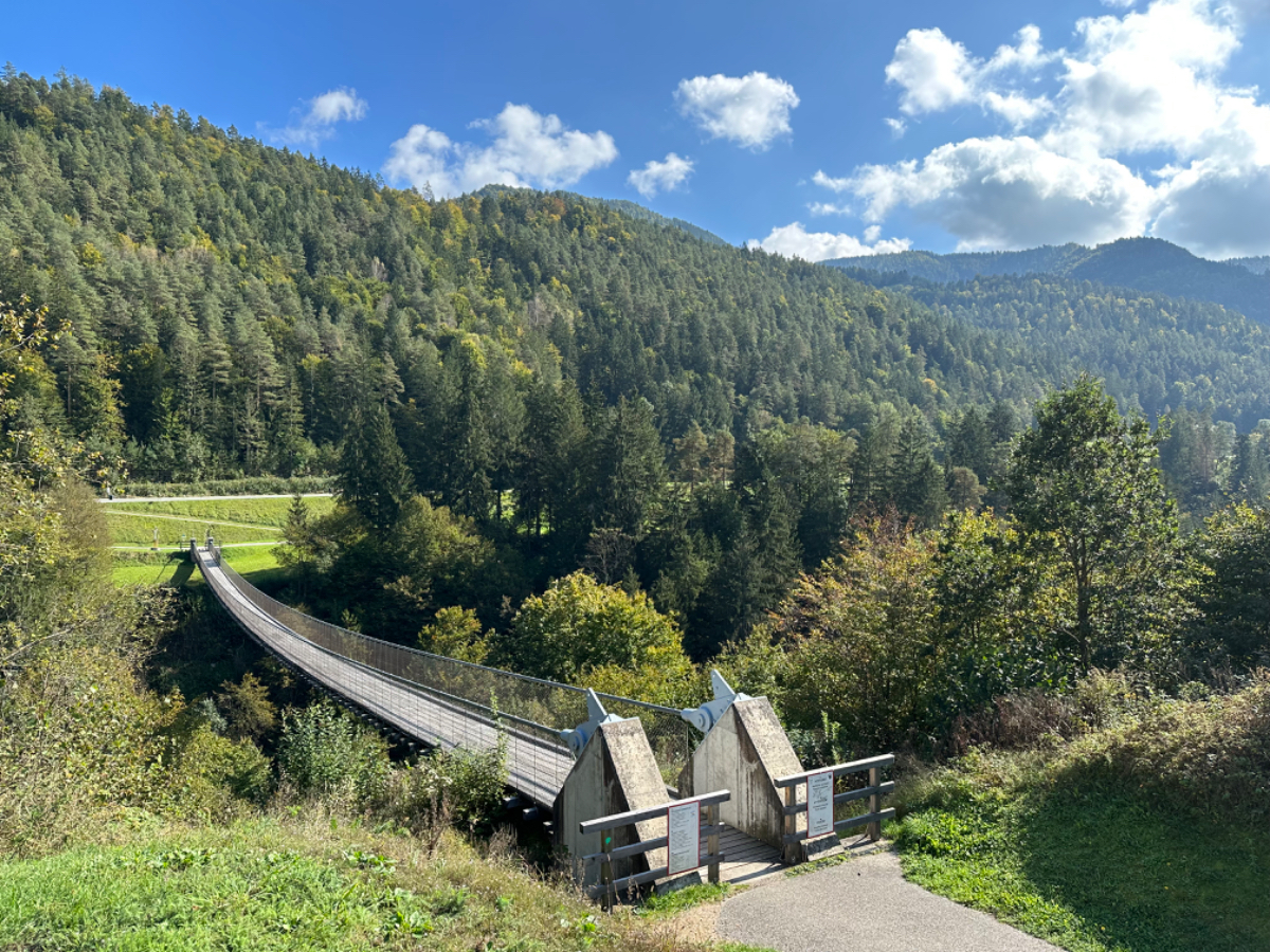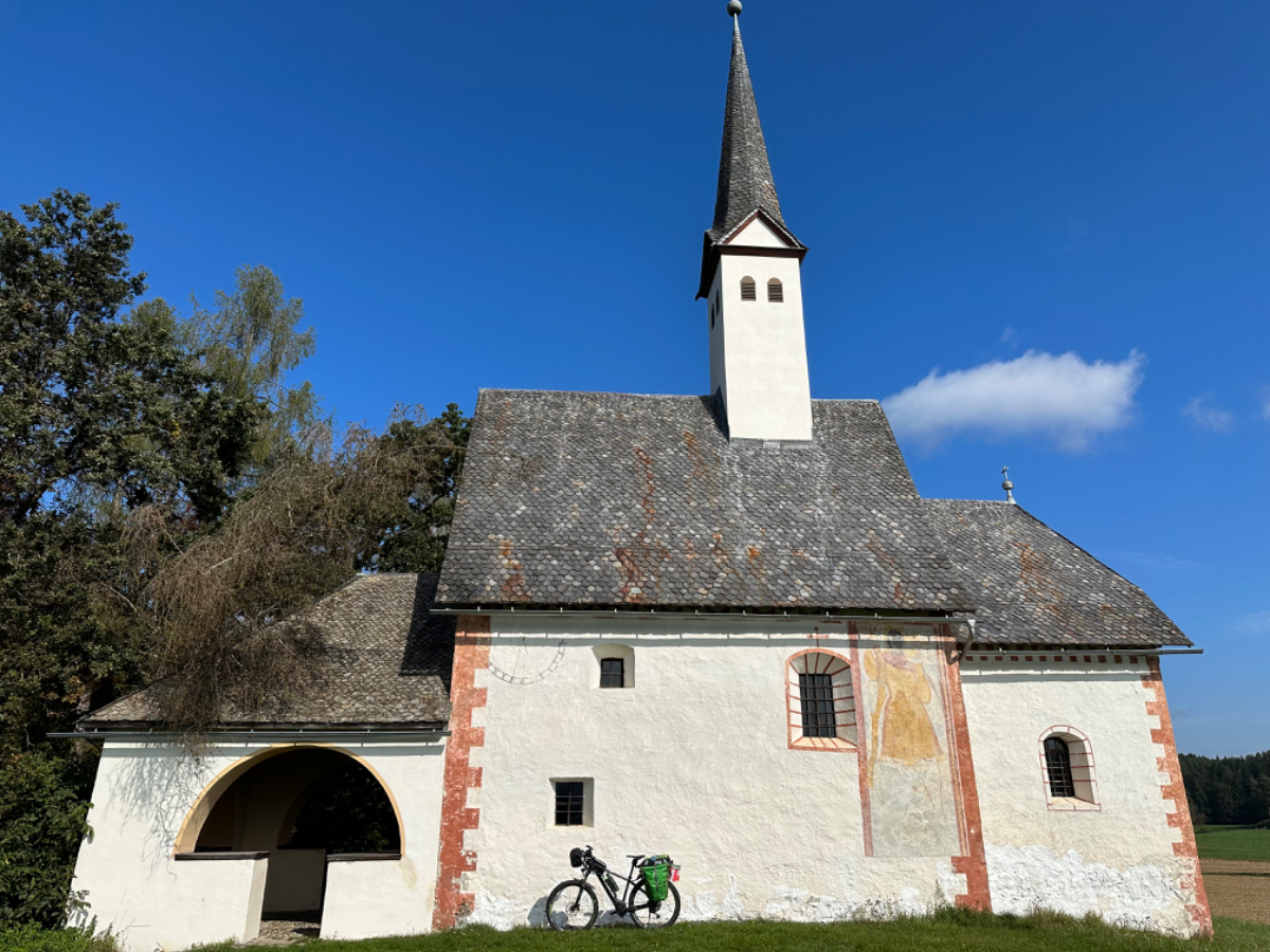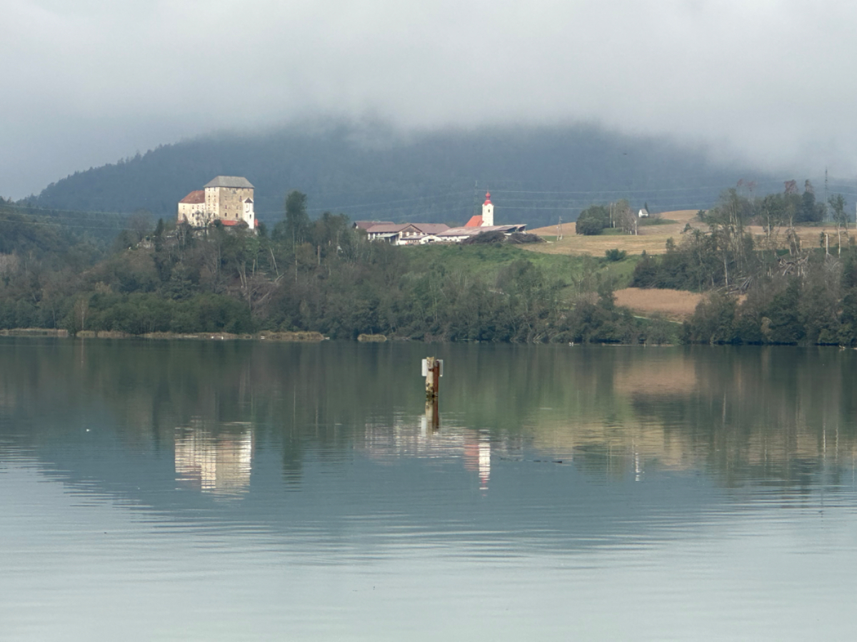 Es ist bereits nach zehn Uhr, als ich mich auf das Rad schwinge. Heute habe ich alle Zeit der Welt, so mein Gefühl, heute fahre ich mit knapp fünfzig Kilometer die kürzeste Etappe der gesamten Tour, und die Wettervorhersage war auch vielversprechend. Nach der letzten Nacht bin ich froh, dass die Rückenschmerzen der Nacht sich mit dem Verlassen dieser unseligen, ultraweichen Bettstatt nicht manifestiert haben, alles gut :-) Noch ist es bewölkt und recht kühl, aber es geht gut dahin. Ich habe mir vorgenommen, heute wirklich zu bummeln und die Fahrt an jedem Kilometer bewusst zu genießen, doch so einfach ist das gar nicht, ich bin es seit Wochen gewöhnt, immer recht zügig zu fahren. So wird auch der Radweg am Damm entlang der Drau als sehr angenehm erlebbar ;-) Wieder fahre ich durch Dörfer, es geht rauf und runter, fast schon wie in der Toskana, halt wirklich nur fast. Bevor ich Völkermarkt erreiche, beginnt der Bereich mit den extremen Sturmschäden im Wald. Die vor sechs Wochen noch überall sichtbaren Schäden sind großteils aufgearbeitet, überall im Wald hört man das Kreischen der Motorsägen, große Stapel von abgelängten Baumstämmen warten auf ihren Abtransport. Dann setzt sich endlich die Sonne durch, es wird angenehm warm, die Jacke kann weg. Jetzt wird das Radfahren zu einer Genussfahrt durch die sonnenbeschiene Herbstlandschaft, es macht richtig Freude. Heute ist ja der Tag des Lächelns, das fällt mir heute auch wirklich nicht schwer :-) Bei Ruden mache ich an einem Rastplatz halt und genieße die warmen Sonnenstrahlen, was für ein Tag! Dann erreiche ich die Jörg Haider Brücke, die über die Drau führt und Ruden und Bleiburg verbindet. Es ist Kärntens höchste Brücke, mit Höhenangst ausgestattet kostete es mich große Überwindung in der Brückenmitte abzusteigen, hinunter zu schauen und Fotos zu machen, ich war froh, als ich die Brücke hinter mir hatte. Eine weitere Brücke hatte ich noch vor mir, über die ich vor Wochen schon das Rad geschoben habe, die Hängebrücke Santa Lucia über den fünfzig Meter tiefen Feistritzbachgraben. Vor der Brücke treffe ich einen Mann, der sich die Sonne auf den gebräunten Körper scheinen lässt. Ernsti ist mit seiner Begleiterin Hanni gestern in Bleiburg bei einem Jazz Konzert gewesen. Er erzählt mir, dass er schon Spanien und Portugal durchwandert hat. Heute wollen sie noch das Liaunig Museum besuchen. Noch ein paar Fotos, und mit guten Wünschen fahre ich weiter. Schön euch kennengelernt zu haben! Die Fahrt über die Brücke ist ok, ich schaue halt nur gerade voraus und nicht links oder rechts hinunter. Nach Lavamünd ist nun nicht mehr weit, als ich gerade eine Anhöhe hinunterrolle, sehe ich auf der anderen Straßenseite das Liaunig Museum. Spontan kehre ich um und fahre hin. Die Zufahrt ist für Fahrräder verboten, ich fahre trotzdem hinein, ich möchte ja nur ein paar Fotos machen. Es dauert nicht lange, da kommt eine junge Frau heraus und auf mich zu. Ich bin schon auf einen Verweis eingestellt, doch sie fragt mich freundlich, ob sie mir weiterhelfen kann, und überreicht mir einen Folder des Museums. Ich bekomme einen Privatvortrag zur Geschichte des Museums, dessen Gründer, der Industrielle Herbert Liaunig, erst letzten Freitag verstorben ist. Die schwarze Fahne an der Einfahrt war mir aufgefallen. Es war sehr interessant, nicht ausgeschlossen, dass ich das Museum einmal besuchen werde. Kurz nach 14 Uhr erreiche ich Lavamünd, trinke im sonnigen Gastgarten ein Ankommensbier, checke ein, dusche, und dennoch ist noch reichlich Zeit bis 17 Uhr, erst dann gibt es was zu essen. Ich gehe spazieren, mit Attraktionen ist dieser Ort wahrlich nicht gesegnet. Was auffällt, sind die kürzlich erfolgten Bauarbeiten zur Hochwasservermeidung. Hier, am Zusammenfluss der Lavant in die Drau, gab es wohl schon die eine oder andere Katastrophe. Alles andere als eine Katastrophe war dann mein Abendessen, zuerst Käsespätzle, doch dann das kulinarische Highlight, Kärntner Nudeln mit Topfen und Marillen, wow, was für ein Genuss! :-) dazu ein Glas Chardonnay........ im Radio habe ich einen italienischen Sender gefunden, ich verstehe zwar kaum etwas, aber es fühlt sich heute einfach gut an :-)