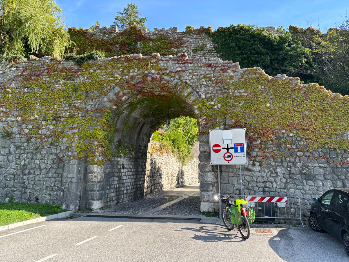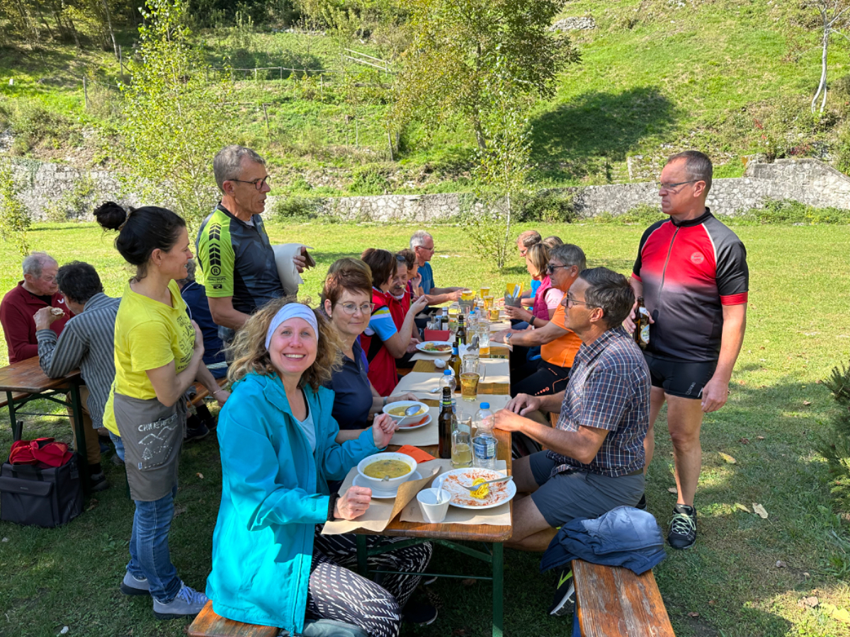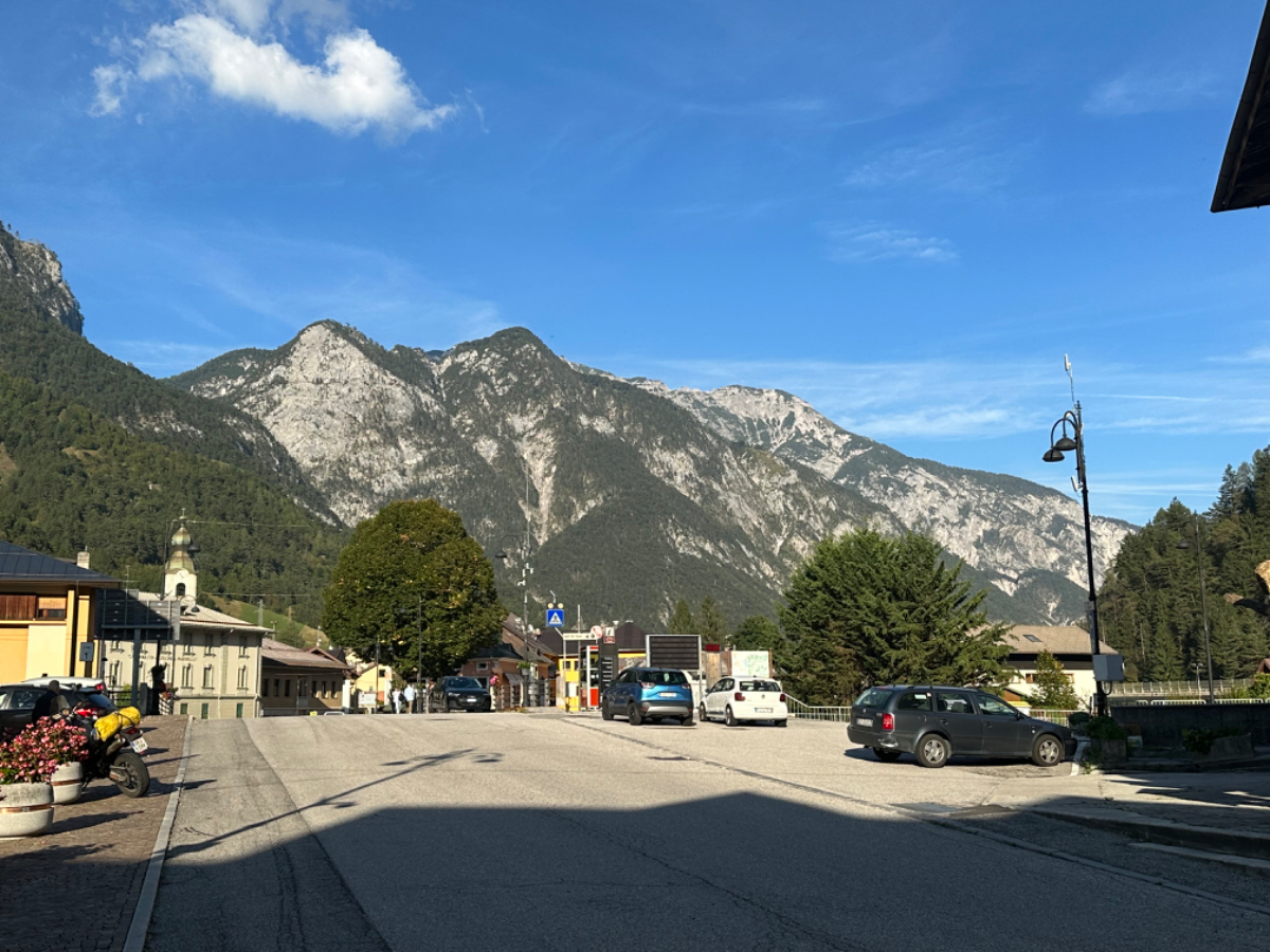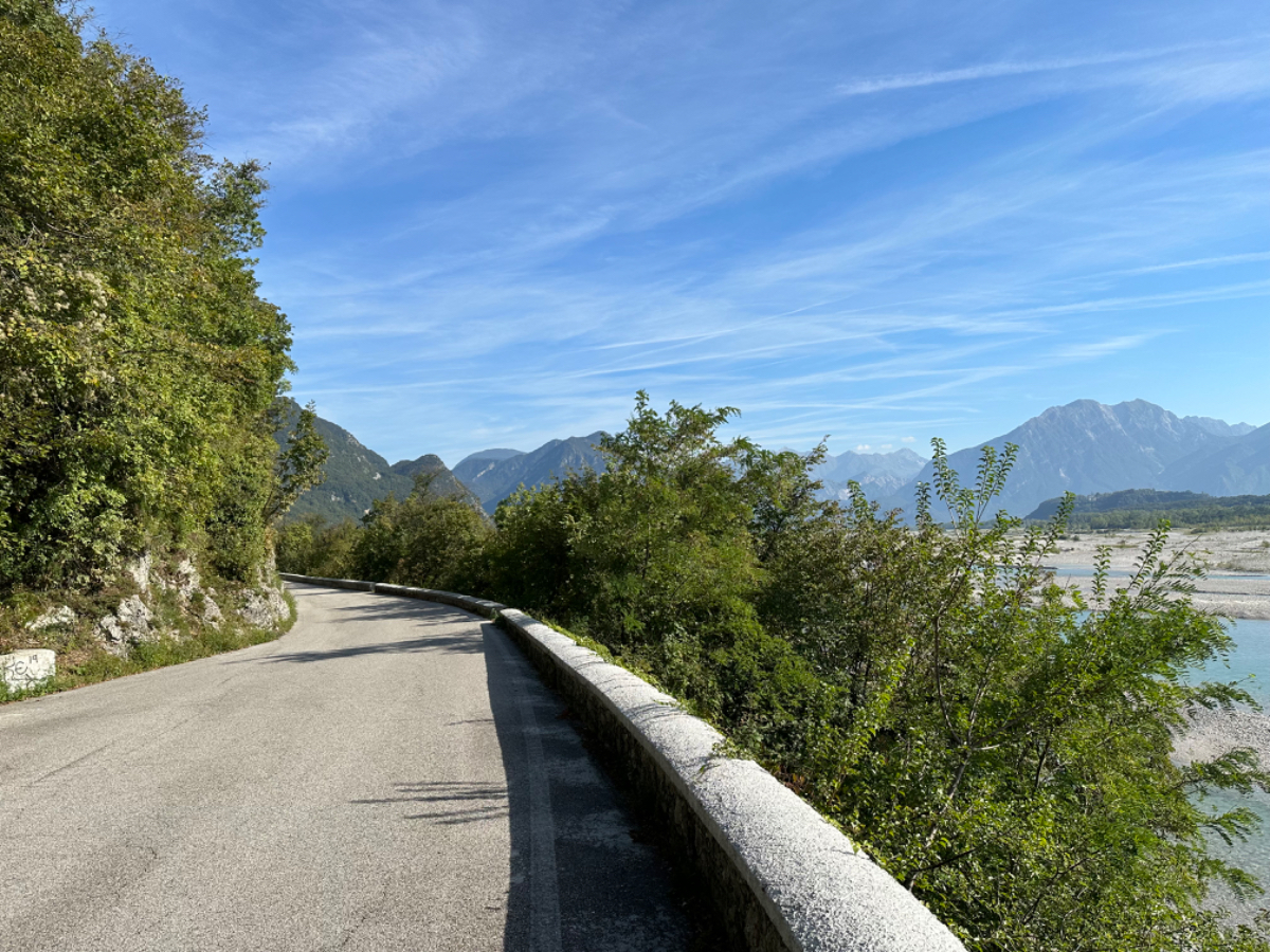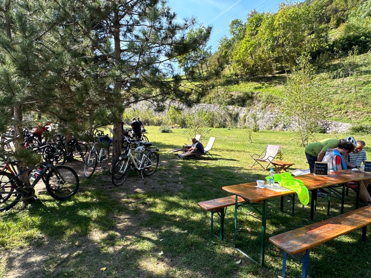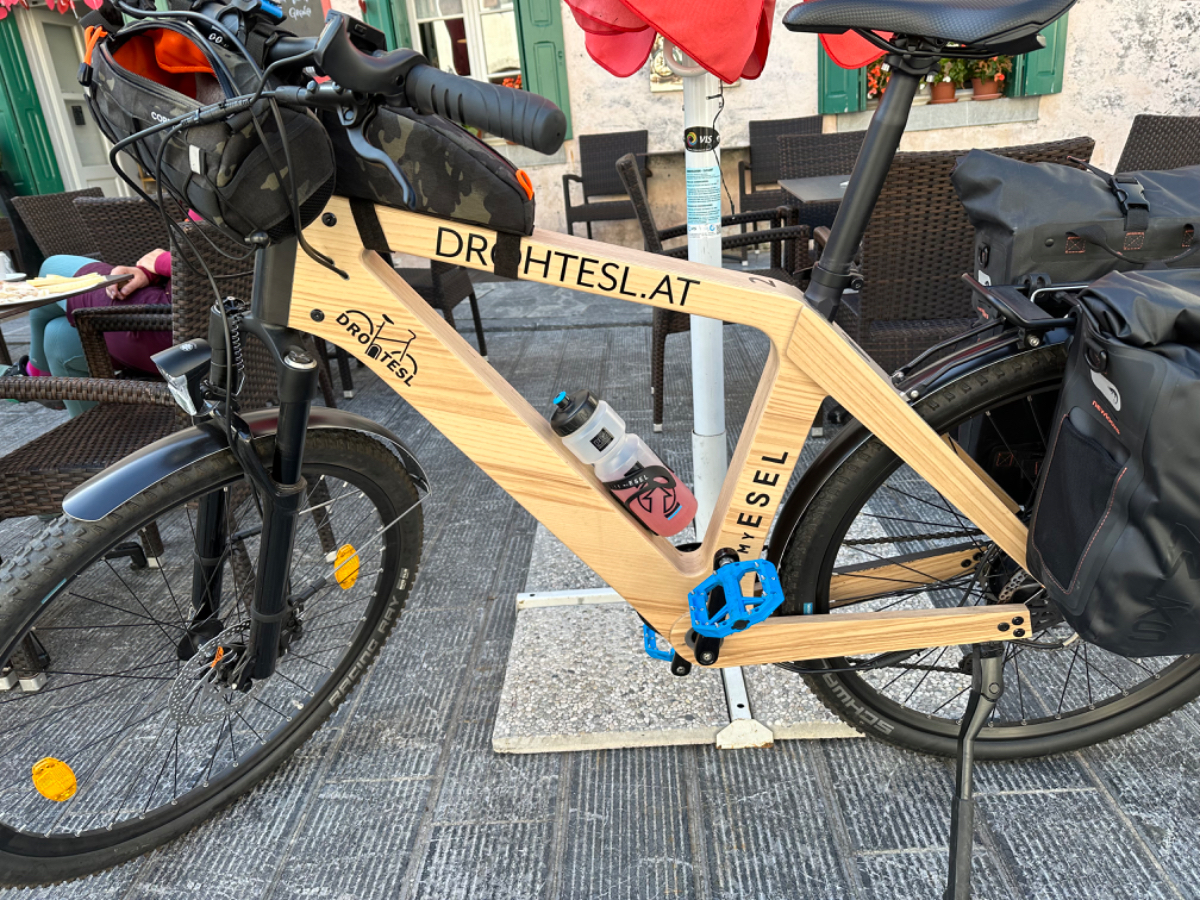 Das Hotel President in Spilimbergo ist ein weiteres auf meiner Reise, das ein großes Restaurant hat, welches aber nicht mehr geöffnet ist. Überall nur noch bed & breakfast, aber das Frühstück war sehr in Ordnung. Das Rad war im Keller sicher untergebracht, auch diesbezüglich hatte ich immer Glück. Beim Rausfahren aus Spilimbergo zeigt sich, dieser Ort ist größer als ich dachte, aber mit dem Navi keinerlei Probleme, die richtigen Wege zu finden. Kaum aus der Stadt, werde ich gleich auf einen Nebenweg geleitet. Nicht schon wieder! Wieder eine derartige Rumpelpiste, dass es kaum ein Vorankommen gibt. Endlich wieder auf der Straße, beschließe ich, nur noch dieser zu folgen, solange es Sinn macht. Ich fahre auf die Berge zu, und bin schon gleich mitten drinnen, es steigt stetig an, wie es in den Bergen so ist ;-) Die Straße ist sehr schmal und kurvenreich, aber es herrscht kaum Verkehr, es geht gut voran. Ich erreiche den Lago di Cornino, einen idyllischen kleinen Bergsee. Dann geht es lange Zeit entlang des Tagliamento auf ruhigen Straßen dahin, bis ich eine Brücke erreiche. Auf der anderen Seite liegt Venzone, mein heutiges Zwischenziel nach 40 Kilometer. Durch das Stadttor erreiche ich einen Platz, an beiden Seiten eine Bar. Ich entscheide mich für links, der Platz liegt in der Sonne. Allerdings trifft das Angebot nicht meinen Geschmack, ich wechsle die Seiten. Gute Wahl, hier gibt es frischen Apfelstrudel, dazu einen café, da ist der Schattenplatz zu vernachlässigen. Am Nebentisch sitzt ein Paar, sie sind auch mit Rädern da. Ich frage nach dem woher und wohin, und erkundige mich über ihre auffallenden Bikes. Es sind Fahrräder aus Holz, eBikes, Made in Oberösterreich, cool! Die beiden, Elisabeth und Eugen kommen aus Wien, sie sind sowohl Motorrad wie auch Rad-Biker. Es war sehr angenehm mit ihnen zu plaudern, dann bekommen sie ihr Essen, und ich muss weiter. Habt noch eine schöne Zeit! :-) Der weitere Weg führt entlang der Bundesstraße bis kurz vor Moggio Udinese, immer leicht ansteigend, anders wird es heute auch nicht mehr. Ich fahre auf den Alpe Adria Radweg, den schönsten Abschnitt vor mir, die ehemalige Bahnstrecke Pontebbana, mit ihren zahllosen Tunnels - in denen es arschkalt ist - und herrlichen Ausblicken auf das Kanaltal. Diesen Weg bin ich schon dreimal gefahren, heute erstmals in die Gegenrichtung. Wie bereits gesagt, es geht nun 30 Kilometer stetig bergan, aber sehr moderat. Der erste Tunnel, wie alle weiteren, ist gut beleuchtet, viele Lichter im Gegenverkehr, es ist noch recht viel Verkehr in Richtung Süden. Wieviel es tatsächlich ist, sehe ich bei meinem nächsten Stopp in Chiusaforte, ein Restaurant in einer ehemalige Bahnstation. Ein älterer Herr, der auch gerade hier halt macht, sagt zu mir, hier stehen Räder im Wert von mindestens 100.000 Euro, er hat Recht! So voll ist es hier. Auch auf der gegenüberliegenden Straßenseite stehen Tische, hier wird mir ein Platz zugewiesen. Am Tisch ein Schild mit der Aufschrift " Riservato Peter 13:30" Mir ist nicht bewusst dass ich reserviert hätte, aber passt doch. Ich bestelle pasta con ragu und Wasser, da kommt eine größere Gruppe von Radlern an, die Reservierung Peter. Peter ist Hotelier in Bodensdorf, er macht mit seinen Gästen eine Tagestour von Tarvisio bis Moggio Udinese, dort werden sie wieder abgeholt. Eine nette Truppe aus Deutschen und Österreichern, wir plaudern eine Weile, dann muss ich aber weiter, wir wünschen uns zum Abschied noch eine gute Reise. Nach dem Essen ist es dann doch ein bisschen mühsam, aber ich finde bald wieder meinen Rhythmus. Pontebba ist bald erreicht, an der Ortseinfahrt eine Werkstatt, Alfa Marchesan. Dio mio, da werden Erinnerungen wach! Vor dreißig Jahren! bin erstmals mit einem Alfa hierher zu Walter gefahren, eine Reparatur die in Österreich ein kleines Vermögen gekostet hätte, wurde von Walter, einem Edelschrauber, kostengünstig erledigt. Seitdem bin ich immer wieder mit diversen Autos zu Walter gefahren. Wenn man die Gesamtkosten inkl. Anfahrt berechnet, war es nicht immer nur eine Kostenentscheidung, Walter hatte einfach mein ultimatives Vertrauen. Gerne hätte ich ihn heute wiedergesehen, doch er war nicht da, er ist auch schon in Pension. Das Albergo Spina in Pontebba ist einfach aber absolut ok, ein eigener abgesperrter Radraum und liegt direkt am Radweg. Bei meiner Ankunft hatte es noch angenehme 22 Grad, ich habe am Hauptplatz in der Sonne zwei kleine Bier genossen. Rund um Pontebba sind hohe Berge, da ist die Sonne leider bald verschwunden, und es wird schnell unangenehm kalt, ich muss hinein und eine Jacke anziehen. Morgens hat es hier zehn Grad ....... Das ist heute also l'ultima notte in Italia, kaum zu glauben, und auch wenn Riki es nicht versteht, es macht mich ein wenig schwermütig. Vielleicht sollte ich morgen umkehren und in den Süden radeln, Zeit habe ich, und die nächste Pension kommt auch in den kommenden Tagen auf's Konto ;-) Realistisch ist aber, morgen habe ich in Villach gebucht, da bleibe ich zwei Tage, ich habe keine saubere Wäsche mehr, und Riki braucht dringend eine Kettenpflege. Dann noch einige Tage am Drauradweg über Maribor heim nach Graz. Ich freue mich darauf! :-))