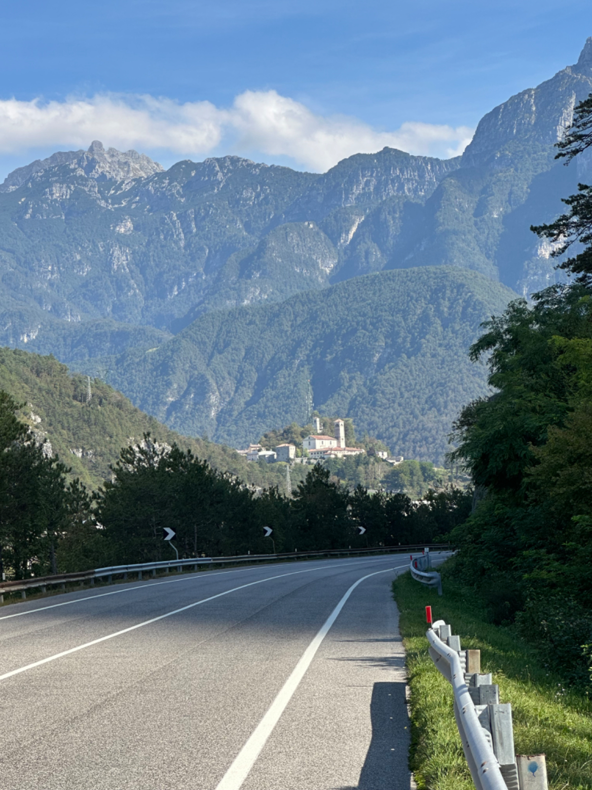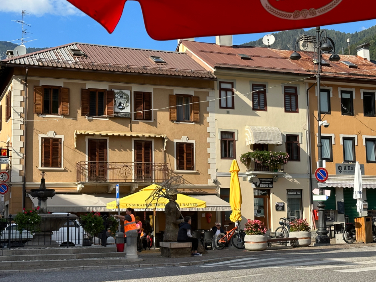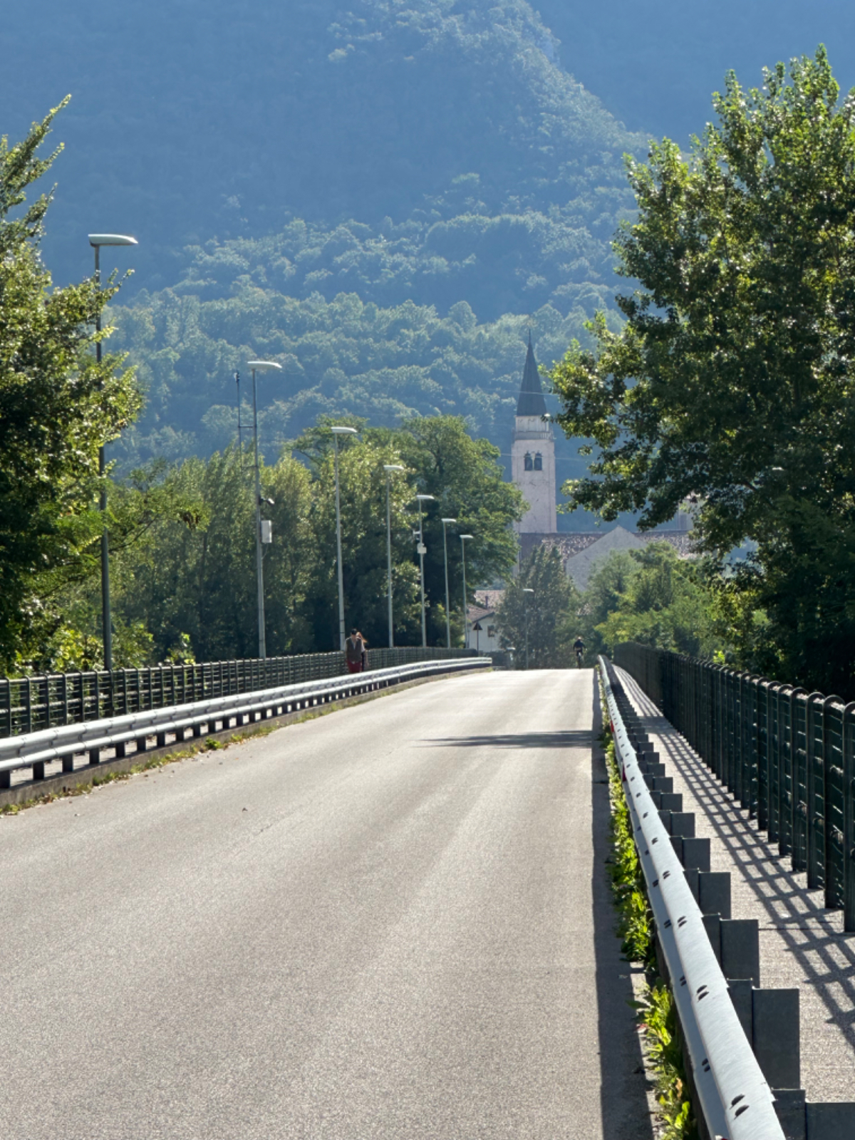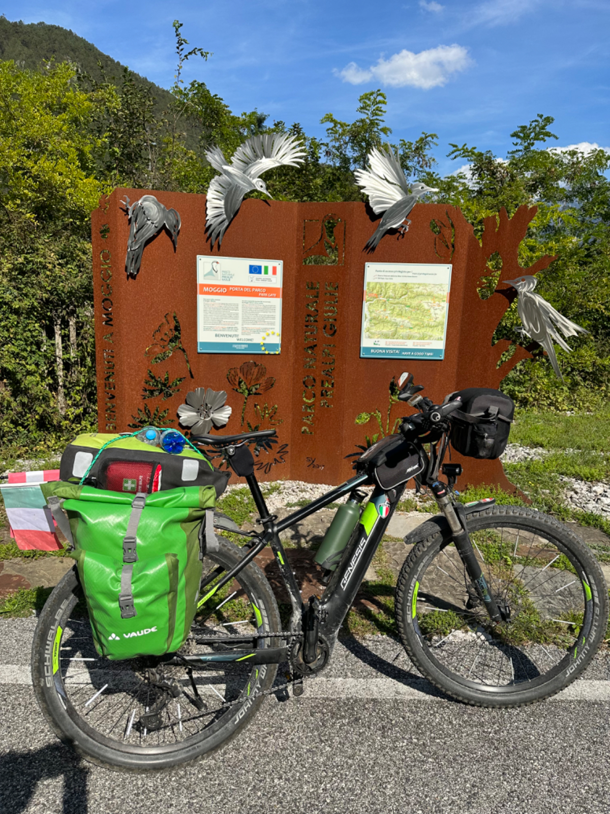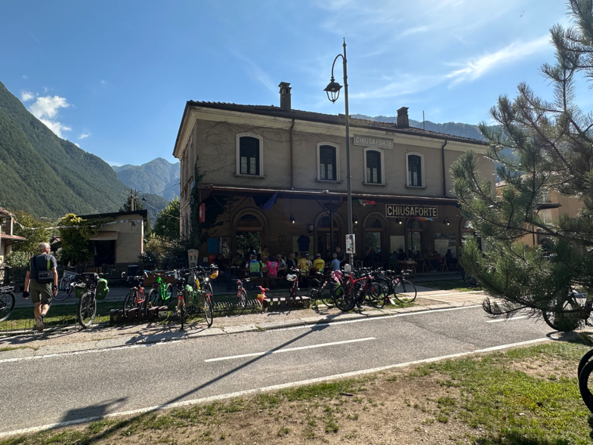 Das Hotel President in Spilimbergo ist ein weiteres auf meiner Reise, das ein großes Restaurant hat, welches aber nicht mehr geöffnet ist. Überall nur noch bed & breakfast, aber das Frühstück war sehr in Ordnung. Das Rad war im Keller sicher untergebracht, auch diesbezüglich hatte ich immer Glück. Beim Rausfahren aus Spilimbergo zeigt sich, dieser Ort ist größer als ich dachte, aber mit dem Navi keinerlei Probleme, die richtigen Wege zu finden. Kaum aus der Stadt, werde ich gleich auf einen Nebenweg geleitet. Nicht schon wieder! Wieder eine derartige Rumpelpiste, dass es kaum ein Vorankommen gibt. Endlich wieder auf der Straße, beschließe ich, nur noch dieser zu folgen, solange es Sinn macht. Ich fahre auf die Berge zu, und bin schon gleich mitten drinnen, es steigt stetig an, wie es in den Bergen so ist ;-) Die Straße ist sehr schmal und kurvenreich, aber es herrscht kaum Verkehr, es geht gut voran. Ich erreiche den Lago di Cornino, einen idyllischen kleinen Bergsee. Dann geht es lange Zeit entlang des Tagliamento auf ruhigen Straßen dahin, bis ich eine Brücke erreiche. Auf der anderen Seite liegt Venzone, mein heutiges Zwischenziel nach 40 Kilometer. Durch das Stadttor erreiche ich einen Platz, an beiden Seiten eine Bar. Ich entscheide mich für links, der Platz liegt in der Sonne. Allerdings trifft das Angebot nicht meinen Geschmack, ich wechsle die Seiten. Gute Wahl, hier gibt es frischen Apfelstrudel, dazu einen café, da ist der Schattenplatz zu vernachlässigen. Am Nebentisch sitzt ein Paar, sie sind auch mit Rädern da. Ich frage nach dem woher und wohin, und erkundige mich über ihre auffallenden Bikes. Es sind Fahrräder aus Holz, eBikes, Made in Oberösterreich, cool! Die beiden, Elisabeth und Eugen kommen aus Wien, sie sind sowohl Motorrad wie auch Rad-Biker. Es war sehr angenehm mit ihnen zu plaudern, dann bekommen sie ihr Essen, und ich muss weiter. Habt noch eine schöne Zeit! :-) Der weitere Weg führt entlang der Bundesstraße bis kurz vor Moggio Udinese, immer leicht ansteigend, anders wird es heute auch nicht mehr. Ich fahre auf den Alpe Adria Radweg, den schönsten Abschnitt vor mir, die ehemalige Bahnstrecke Pontebbana, mit ihren zahllosen Tunnels - in denen es arschkalt ist - und herrlichen Ausblicken auf das Kanaltal. Diesen Weg bin ich schon dreimal gefahren, heute erstmals in die Gegenrichtung. Wie bereits gesagt, es geht nun 30 Kilometer stetig bergan, aber sehr moderat. Der erste Tunnel, wie alle weiteren, ist gut beleuchtet, viele Lichter im Gegenverkehr, es ist noch recht viel Verkehr in Richtung Süden. Wieviel es tatsächlich ist, sehe ich bei meinem nächsten Stopp in Chiusaforte, ein Restaurant in einer ehemalige Bahnstation. Ein älterer Herr, der auch gerade hier halt macht, sagt zu mir, hier stehen Räder im Wert von mindestens 100.000 Euro, er hat Recht! So voll ist es hier. Auch auf der gegenüberliegenden Straßenseite stehen Tische, hier wird mir ein Platz zugewiesen. Am Tisch ein Schild mit der Aufschrift " Riservato Peter 13:30" Mir ist nicht bewusst dass ich reserviert hätte, aber passt doch. Ich bestelle pasta con ragu und Wasser, da kommt eine größere Gruppe von Radlern an, die Reservierung Peter. Peter ist Hotelier in Bodensdorf, er macht mit seinen Gästen eine Tagestour von Tarvisio bis Moggio Udinese, dort werden sie wieder abgeholt. Eine nette Truppe aus Deutschen und Österreichern, wir plaudern eine Weile, dann muss ich aber weiter, wir wünschen uns zum Abschied noch eine gute Reise. Nach dem Essen ist es dann doch ein bisschen mühsam, aber ich finde bald wieder meinen Rhythmus. Pontebba ist bald erreicht, an der Ortseinfahrt eine Werkstatt, Alfa Marchesan. Dio mio, da werden Erinnerungen wach! Vor dreißig Jahren! bin erstmals mit einem Alfa hierher zu Walter gefahren, eine Reparatur die in Österreich ein kleines Vermögen gekostet hätte, wurde von Walter, einem Edelschrauber, kostengünstig erledigt. Seitdem bin ich immer wieder mit diversen Autos zu Walter gefahren. Wenn man die Gesamtkosten inkl. Anfahrt berechnet, war es nicht immer nur eine Kostenentscheidung, Walter hatte einfach mein ultimatives Vertrauen. Gerne hätte ich ihn heute wiedergesehen, doch er war nicht da, er ist auch schon in Pension. Das Albergo Spina in Pontebba ist einfach aber absolut ok, ein eigener abgesperrter Radraum und liegt direkt am Radweg. Bei meiner Ankunft hatte es noch angenehme 22 Grad, ich habe am Hauptplatz in der Sonne zwei kleine Bier genossen. Rund um Pontebba sind hohe Berge, da ist die Sonne leider bald verschwunden, und es wird schnell unangenehm kalt, ich muss hinein und eine Jacke anziehen. Morgens hat es hier zehn Grad ....... Das ist heute also l'ultima notte in Italia, kaum zu glauben, und auch wenn Riki es nicht versteht, es macht mich ein wenig schwermütig. Vielleicht sollte ich morgen umkehren und in den Süden radeln, Zeit habe ich, und die nächste Pension kommt auch in den kommenden Tagen auf's Konto ;-) Realistisch ist aber, morgen habe ich in Villach gebucht, da bleibe ich zwei Tage, ich habe keine saubere Wäsche mehr, und Riki braucht dringend eine Kettenpflege. Dann noch einige Tage am Drauradweg über Maribor heim nach Graz. Ich freue mich darauf! :-))