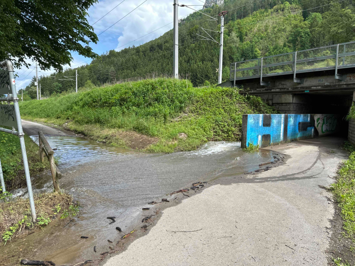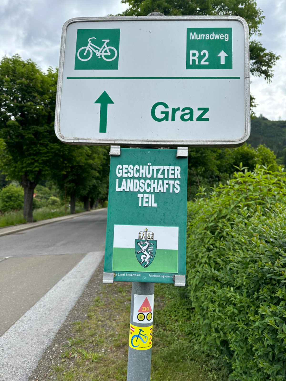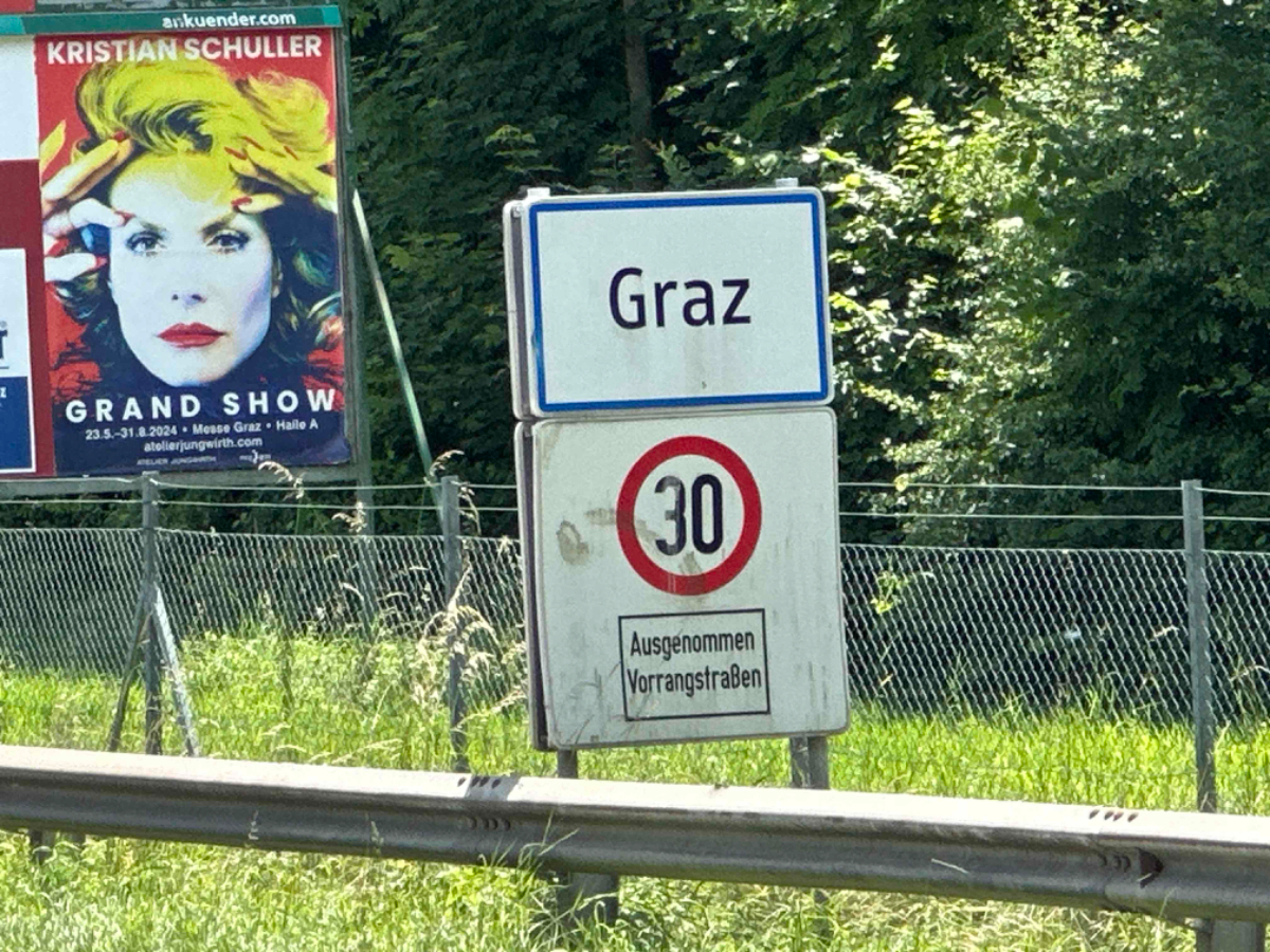 Bis Frohnleiten sind noch einige Spuren der starken Regenfälle der vergangenen Tage zu sehen, ich bin froh nicht vor zwei Tagen hier durchgefahren zu sein. Der Wettergott hatte dankenswerterweise über die gesamte Reise hinweg das schlechte Wetter von mir ferngehalten. In Frohnleiten wollte ich einem Schulfreund kurz Hallo sagen, er betreibt ein Lokal dort. Besser gesagt, betrieb er es, er ist schon wieder weiter gezogen und eröffnet im Juni ein neues Lokal. Entlang der Badlwand Galerie bis hinein nach Peggau muss ich auf die vielbefahrene Landesstraße mit reichlich Schwerverkehr, nicht schön! Viel schöner wird es dann auch bis Graz nicht mehr, bei Gegenwind immer entlang der B67, es ist einfach nur laut. In Peggau gönne ich mir einen letzten Besuch beim Billa, und ja, natürlich hole ich mir eine Leberkässemmel, ein ritueller Abschluß, quasi ;-)