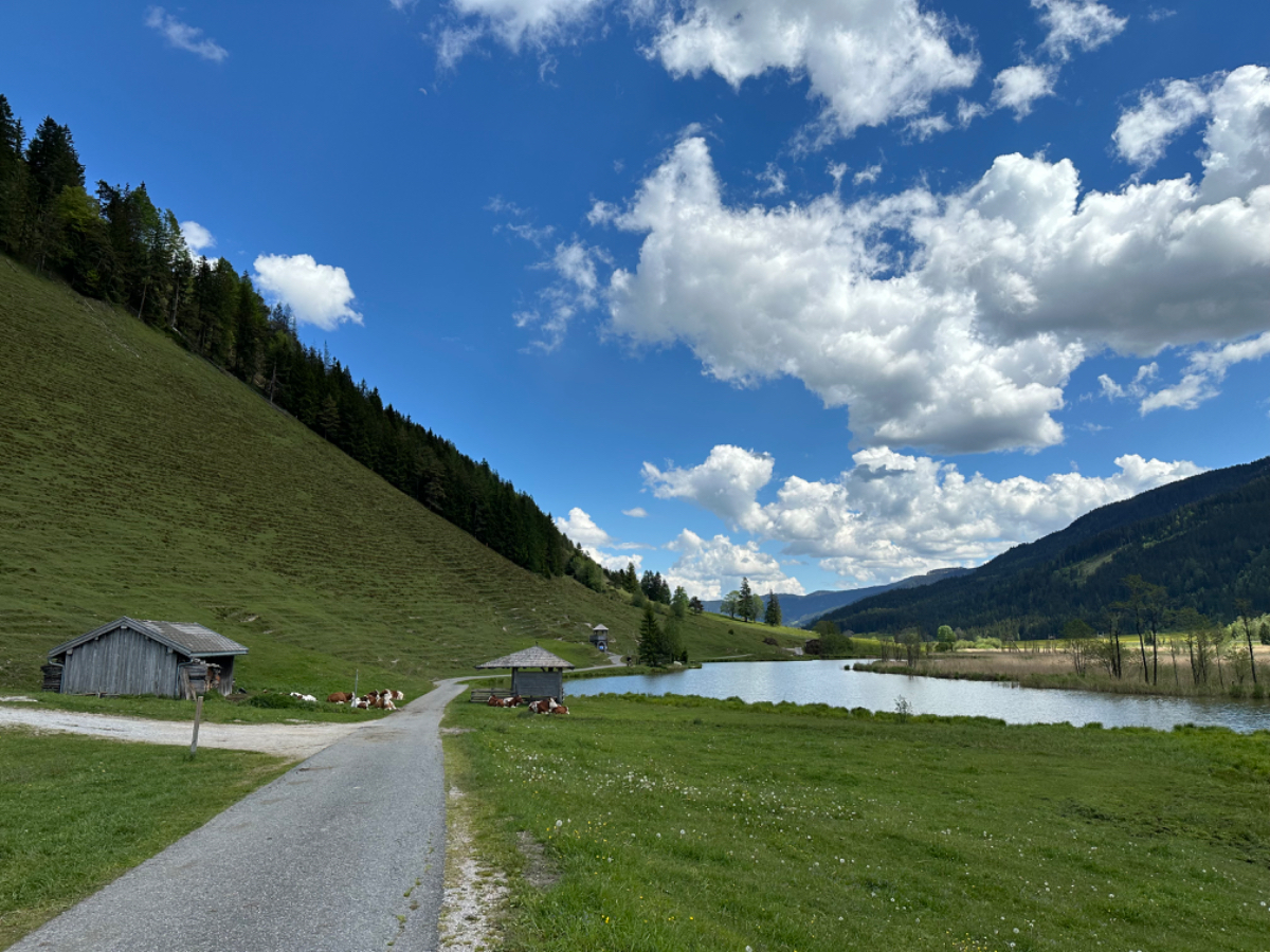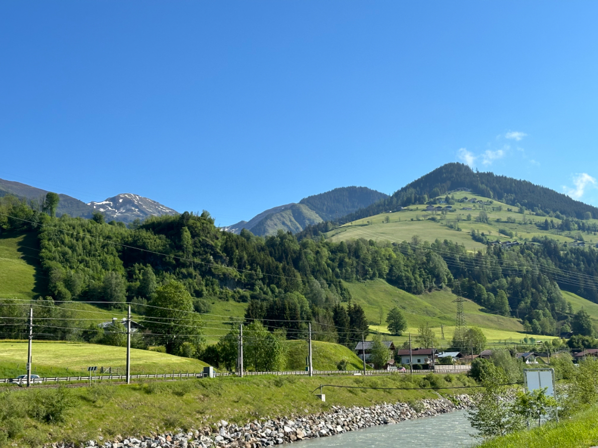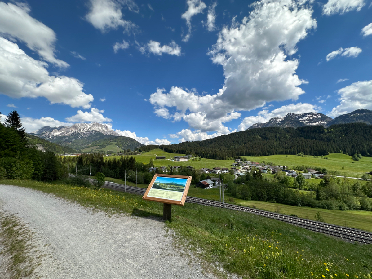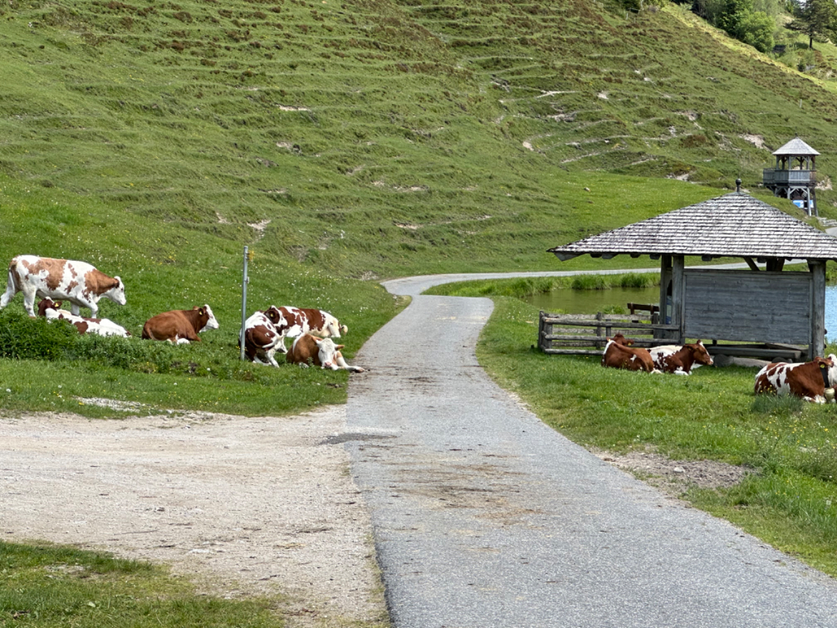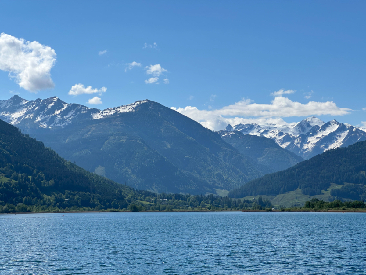 Ein neuer Tag, ein neues Abenteuer:-) Ich hatte mir vorgenommen, mir mehrere Ortsnamen, die an meinem Weg liegen zu merken. Aber aussichtslos, ich bin schon zufrieden wenn ich mir ein paar Highlights merke ;-) Und deren gab es heute viele! Ich muss meine Aussage über den schönsten Tourabschnitt revidieren, Tag 3 Ennstal war super schön, aber heute Tag 5 war eine absolute Steigerung! Beispielsweise Zell am See (und natürlich auch die Fahrt bis dorthin) war eines der Highlights. Über schöne Radwege, verkehrsarme Nebenstraßen erreiche ich nach 20 Kilometer Sellamse. Scheich habe ich in dieser schönen Stadt am See keinen gesehen, aber im Bereich rund um das Grandhotel und Casino etliche, die heute als solche durchgehen ;-) Aber sie lassen sich nicht gerne fotografieren. Entlang des Sees ist die Luft sehr kühl, obwohl bei fast wolkenlosen Himmel die Sonne scheint. Bei der Weiterfahrt ziehe ich mein Gilet verkehrt herum an, damit mir durch den Fahrtwind nicht zu kalt wird, und am Rücken der Schweiß verdunsten kann. So der Plan, aber ganz funktioniert es doch nicht, ich hoffe darauf, dass es bald wärmer wird. Wird es dann auch, als ich gegen Mittag Saalfelden am steinernen Meer erreiche. Die Landschaft bis hierhin war beeindruckend, rundum türmen sich hohe, schneebedeckte Berge auf, schön anzusehen, wenn ich nicht hinauf muss ;-) Entlang einer laaangen Allee radle ich nach Salfelden hinein. Auf der Suche nach einer Möglichkeit, meinen Akku aufzuladen, verliere ich einige Zeit, bin aber nicht erfolgreich. Im Tourismusbüro verweist man mich nach Leogang. Auf gehts nach Leogang. In einer app für ebiker finden sich öffentliche Lademöglichkeiten, alle Angaben für Saalfelden waren allerdings Nieten. In Leogang am Gemeindeamt soll es eine Möglichkeit geben. Gibt es natürlich nicht, aber der Bedienstete gibt mir den entscheidenden Tipp, beim Sport und Freizeitzentrum, das idealerweise an meiner Route liegt, dort haut es hin. Ich lerne dort Dirk kennen, den Betreiber des Restaurant Birnhorn, ein unheimlich netter Typ, bei dem ich fast zwei Stunden verbringe, während der Akku lädt. Dirk ist vor sechs Jahren mit Frau und Kind von Deutschland nach Leogang gezogen um zu bleiben. Leogang ist Sport Hotspot, Sommer wie Winter. Im Winter ein beliebtes Schigebiet, und danach bis zum nächsten Winter fallen die Downhill Biker dort ein, somit ist das ganze Jahr Saison. Wir verabschieden uns, ich muss weiter, vor mir liegen noch etliche Höhenmeter, der höchste Punkt auf 1000 Meter. Es ist jetzt 14 Uhr und die Sonne brennt vom Himmel, auf meiner linken Wade habe ich bereits einen Sonnenbrand. Dass ich Tirol erreicht habe zeigt sich an den Kfz Kennzeichen, aber auch an den Bauernhöfen und Häusern die an meinem Weg liegen. Und an den noch mehr und noch höheren Bergen ringsum. Selbst mir, der es nicht so mit den Bergen hat, entfährt so manches wow, so schön und mächtig sind sie anzusehen. Wie würde es da erst Riki gefallen hier zu radeln, die ja diese Panoramen und die Berge überhaupt liebt. Diese Leidenschaft teilen wir leider gar nicht. Ja, aber sie ist nicht hier, drückt lieber die Schulbank ;-)) Über wunderbare Radwege und teilweise auch Schotterpisten geht es immer weiter hinauf, auf Almen, mit freilaufenden Kühen die meinen Weg kreuzen. Ich glaube, ohne Nachladung des Akkus wäre es sich heute nicht ausgegangen, so steil sind manche Anstiege, dass ich die höchste Unterstützungsstufe verwenden muß. Aber es geht auch wieder hinunter, durch grosse bäuerliche Anwesen hindurch, hinunter, aber auch wieder hinauf. Über der ganzen Gegend liegt ein Geruch nach Kuhdung. Arg, als plötzlich mitten auf der Alm ein riesiger Industrieschornstein auftaucht. Es ist ein Magnesitwerk hier heroben. Die Reihenfolge des geschilderten wird eventuell nicht ganz stimmen, es waren einfach zuviele Eindrücke! Um 16 Uhr nach knapp 80 km erreiche ich St.Johann, wieder eine nette Stadt. Bei einem Italiener genehmige ich mir ein Eis, das ich auf leeren Magen gar nicht gut vertragen habe, ich hab jetzt noch Bauchschmerzen :-( Heute schlafe ich in einem von Rainer Schönfelders Hotels, dem Cooee Hotel, ein tolles Haus. Ich habe Halbpension gebucht, wusste ich gar nicht, habe ich erst gestern auf meiner Buchung gesehen. Also mal ein Tag ohne Billa :-)