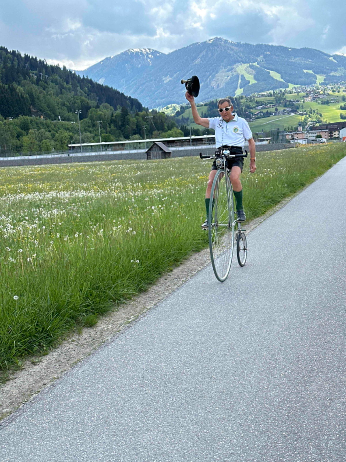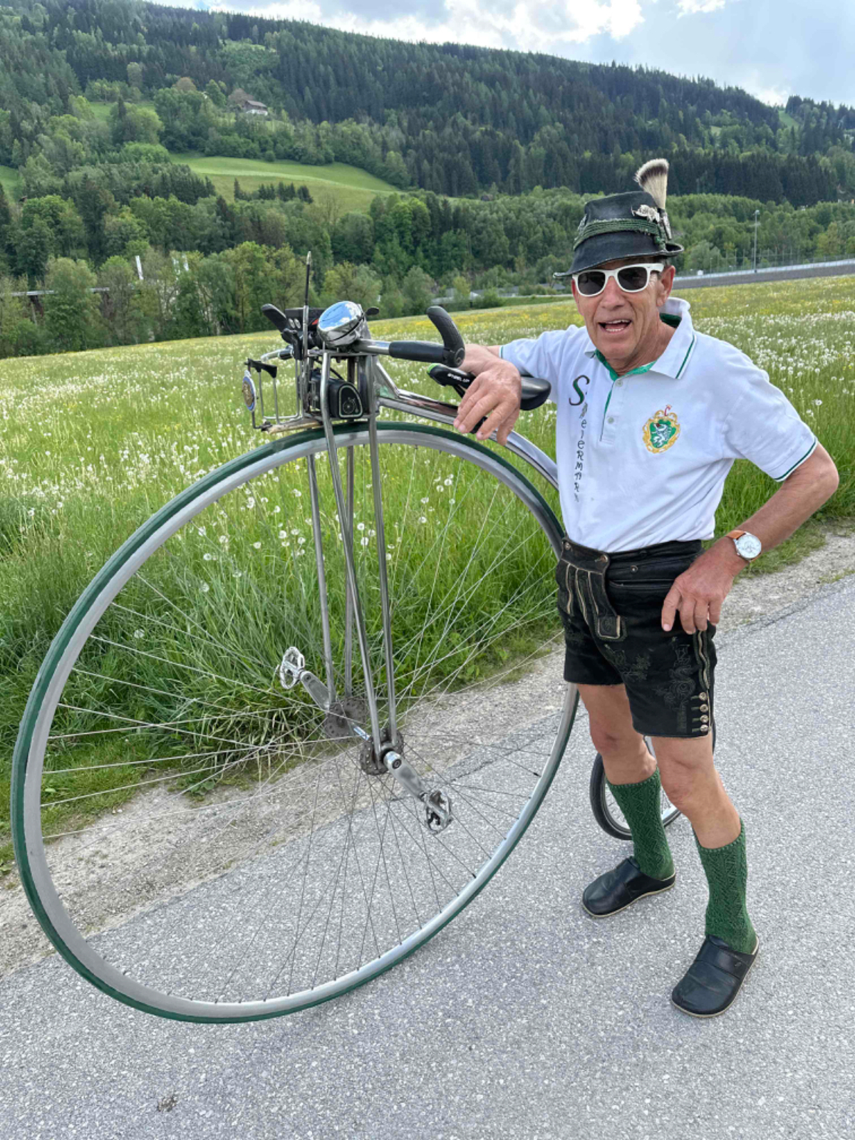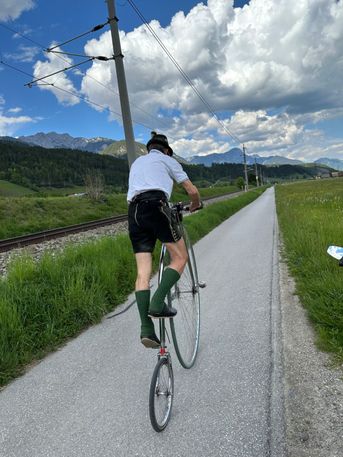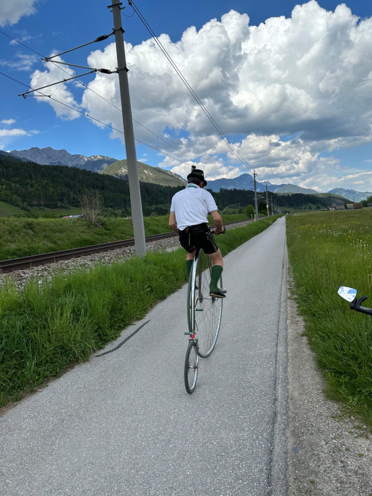 Auf einer Blumenwiese mache ich Fotos und versende Muttertagsgrüße an Großmütter, Mütter und Töchter, für mich schlummert in jeder Frau eine Mutter :-) In Weissenbach mache ich eine Pause, ein Café liegt da so einladend am Wegesrand, und ich habe es nicht bereut. Topfenstrudel mit Vanillesauce, dazu grüner Tee, danach sind die Energiespeicher wieder voll für die restliche Strecke bis Schladming. Kurz vor Schladming kommt mir ein cooler Typ auf einem Hochrad entgegen. Nach kurzer Überlegung kehre ich um. Um ihn einzuholen, muss ich ganz schön in die Pedale treten.