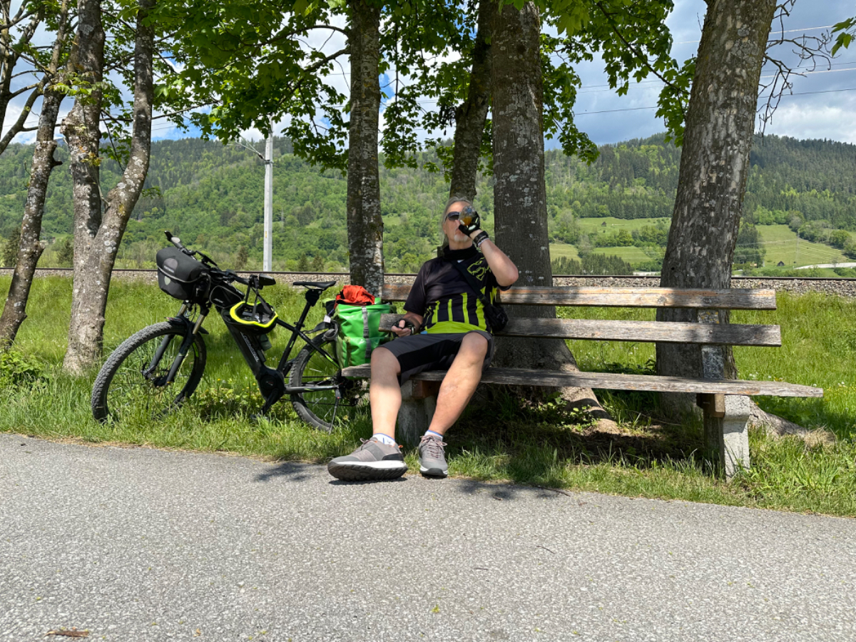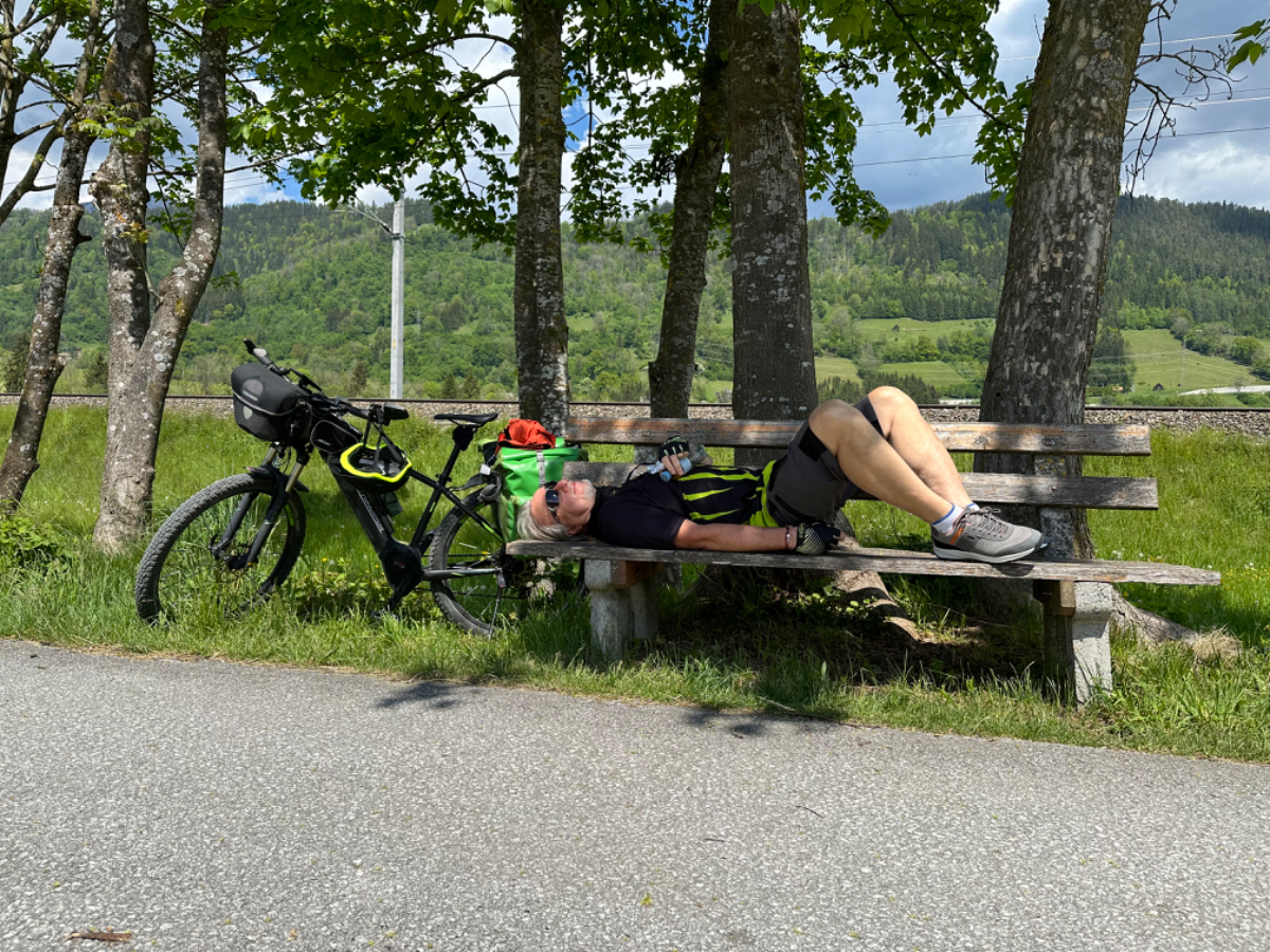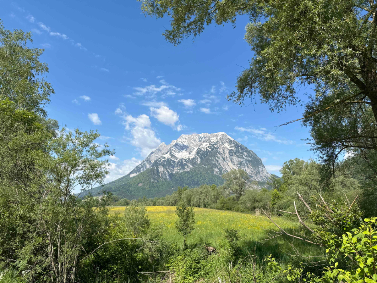 Auf einer Blumenwiese mache ich Fotos und versende Muttertagsgrüße an Großmütter, Mütter und Töchter, für mich schlummert in jeder Frau eine Mutter :-) In Weissenbach mache ich eine Pause, ein Café liegt da so einladend am Wegesrand, und ich habe es nicht bereut. Topfenstrudel mit Vanillesauce, dazu grüner Tee, danach sind die Energiespeicher wieder voll für die restliche Strecke bis Schladming. Kurz vor Schladming kommt mir ein cooler Typ auf einem Hochrad entgegen. Nach kurzer Überlegung kehre ich um. Um ihn einzuholen, muss ich ganz schön in die Pedale treten.