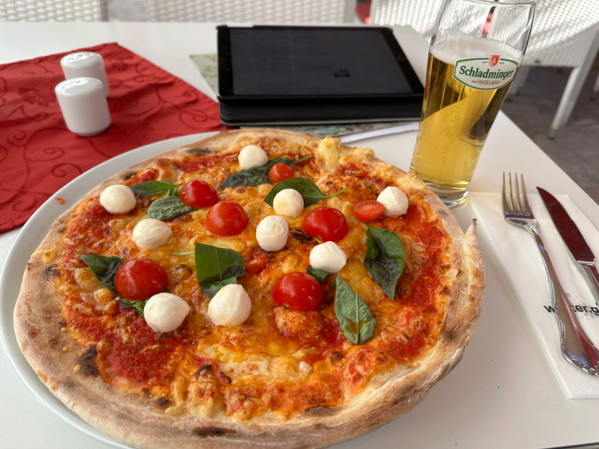 Mein Hotel hat idealerweise auch eine Restaurant und Pizzeria im Angebot, von dem ich nach der Körperpflege und Wäschewaschen gerne Gebrauch mache :-) Pizza Caprese und of course ein Schladminger Bier darf es sein. Danach ein Spaziergang durch die Stadt, in einer Kirche entzünde ich eine (Muttertags)Kerze für meine Mutter. Die Sonne sticht noch immer vom Himmel, aber dazwischen gab es auch schon ein paar Regentropfen, ich hoffe auch für die weiteren Tage auf gutes Wetter, allerdings sind die Vorhersagen wenig vielversprechend :-( Anyway, jetzt trinke ich mein zweites Schladminger aus und werde aufs Zimmer gehen, den Blog und Fotos hochladen, und dann bald schlafen. Buona Notte :-)