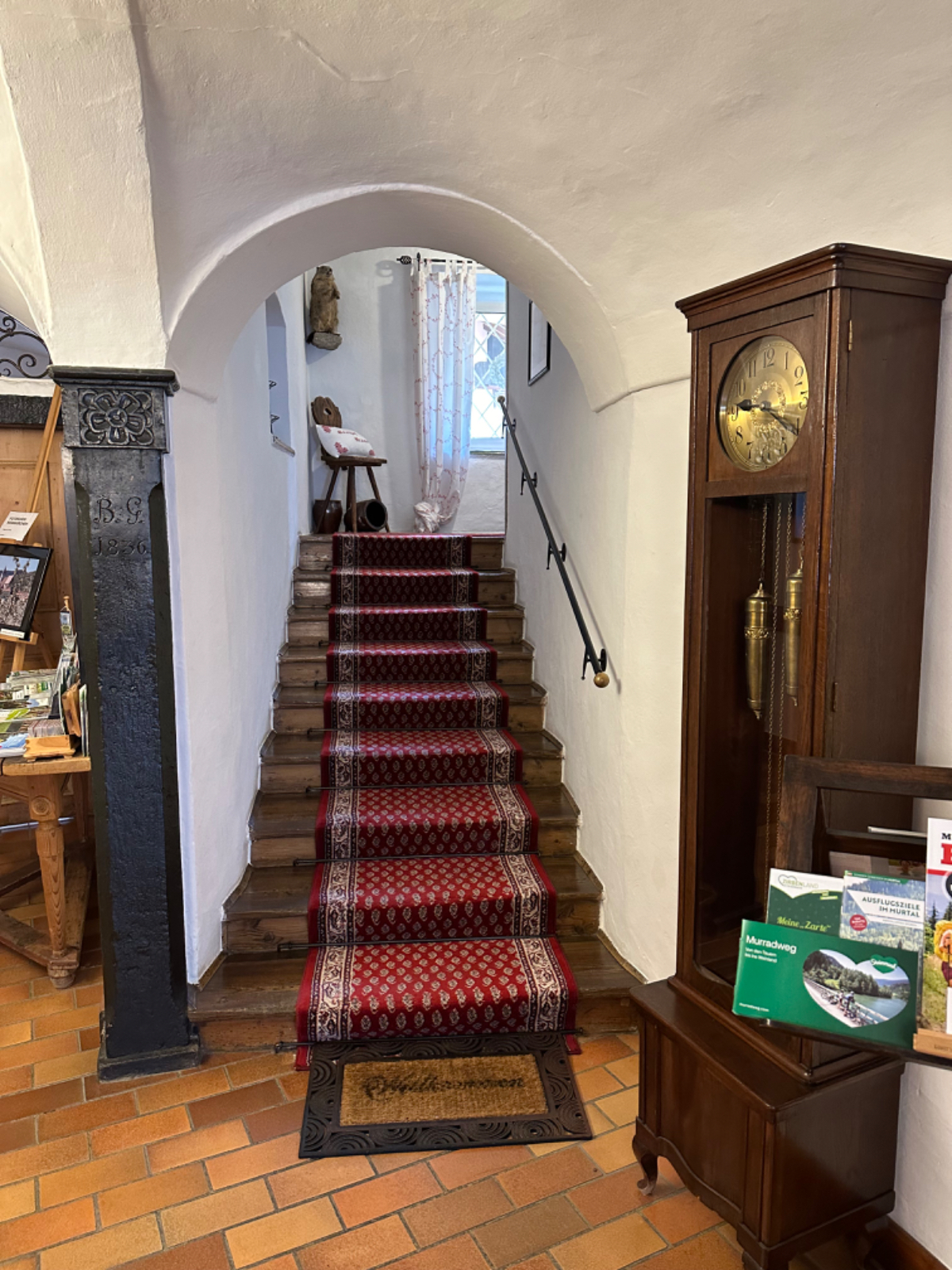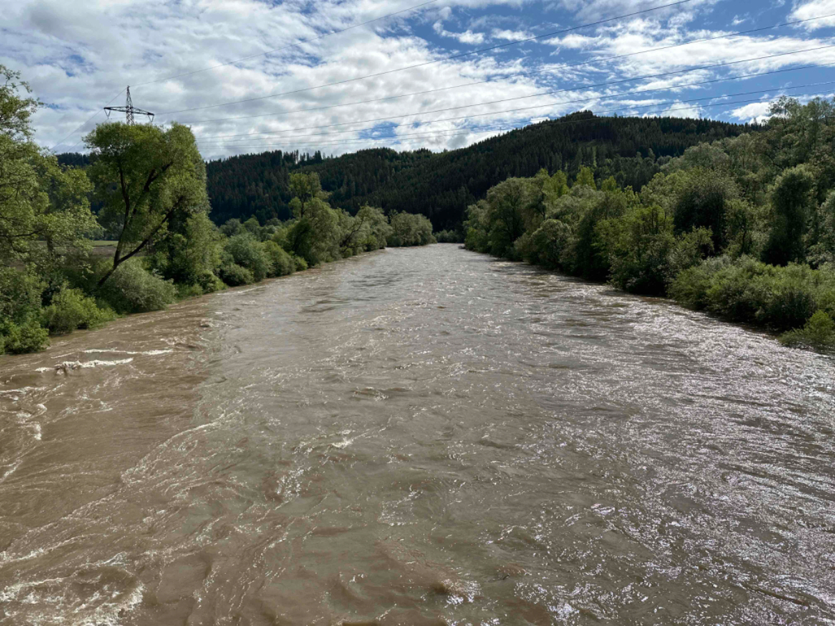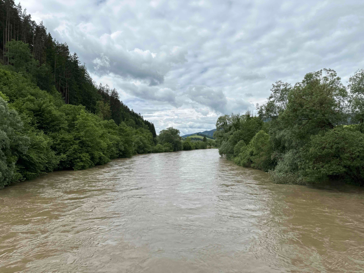 Der Gasthof Bräuer , eine ehemalige Brauerei, ist ein dementsprechend traditionelles Gebäude mit ganz viel historischem Flair! Das modernste ist das Zimmerzutrittssystem, von Gerhard installiert. Mit Gerhard habe ich mich um 7:30 hier zum Frühstück verabredet, wir lassen es uns gut schmecken, was bei dem Gebotenen auch nicht sehr schwer ist. Eigentlich hatte ich eine Einladung zum Frühstück ausgesprochen, doch die Wirtsleute haben mich overruled, und zeigten damit ihre hohe Zufriedenheit mit Gerhards Diensten. Es wird dann auch 9:30 bis ich wegkomme. Mittlerweile ist das Wetter nicht mehr ganz so schön, aber es sollte zumindest bis zum Nachmittag trocken bleiben. Es liegen heute nur 65 km vor mir, die meiste Zeit geht es eben dahin. Im Vergleich mit schon absolvierten Tagestouren wird es eine Spazierfahrt. Hier im Murtal gibt es zum Teil überdurchschnittlich gut ausgebaute Radwege, easy going :-) Der Pegelstand der Mur hat seit gestern ganz schön zugelegt, schnell fließend wälzt sich der Fluß dahin. Am Radweg kommen mir ein paar ältere Herrschaften entgegen, einer ruft mir zu „ a guade Tour de Mur!“ sehr freundlich, vielen Dank :-)