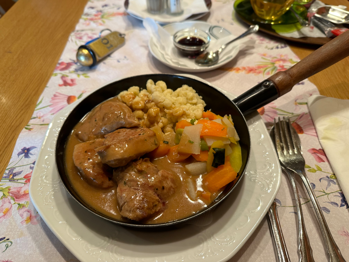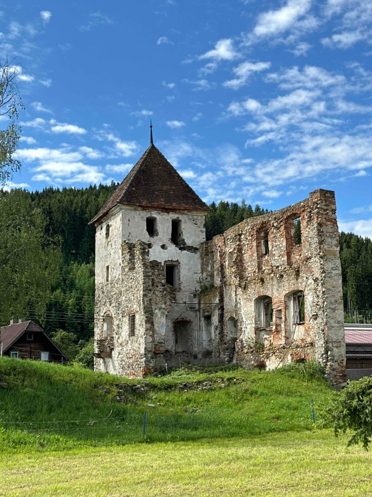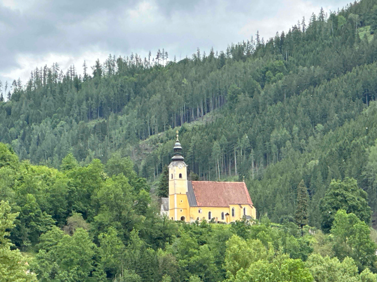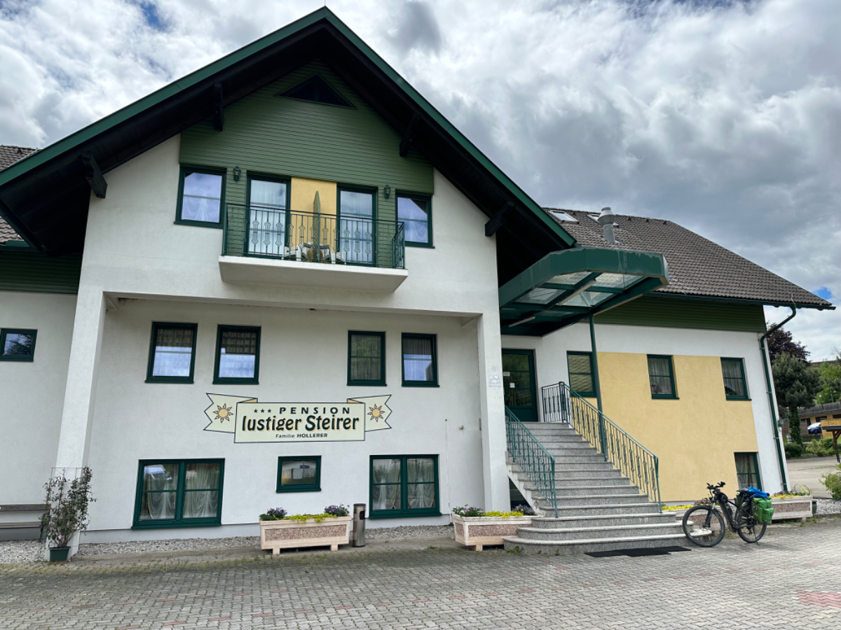 Mein heutiges und zugleich letztes Quartier ist das Gast und Gästehaus zum lustigen Steirer in Oberaich, kurz vor Bruck. Ein geräumiges, sauberes Zimmer, eine harte Matratze, eine Garage fürs Fahrrad und eine Küche, in der der gesellige Chef selbst kocht, ein gebührender Abschluss! Wenn jetzt das WLAN auch noch leidlich gut funktioniert, ist alles gut. Ich muss ja auch noch die Fotos von gestern hochladen, war gestern einfach nicht möglich.