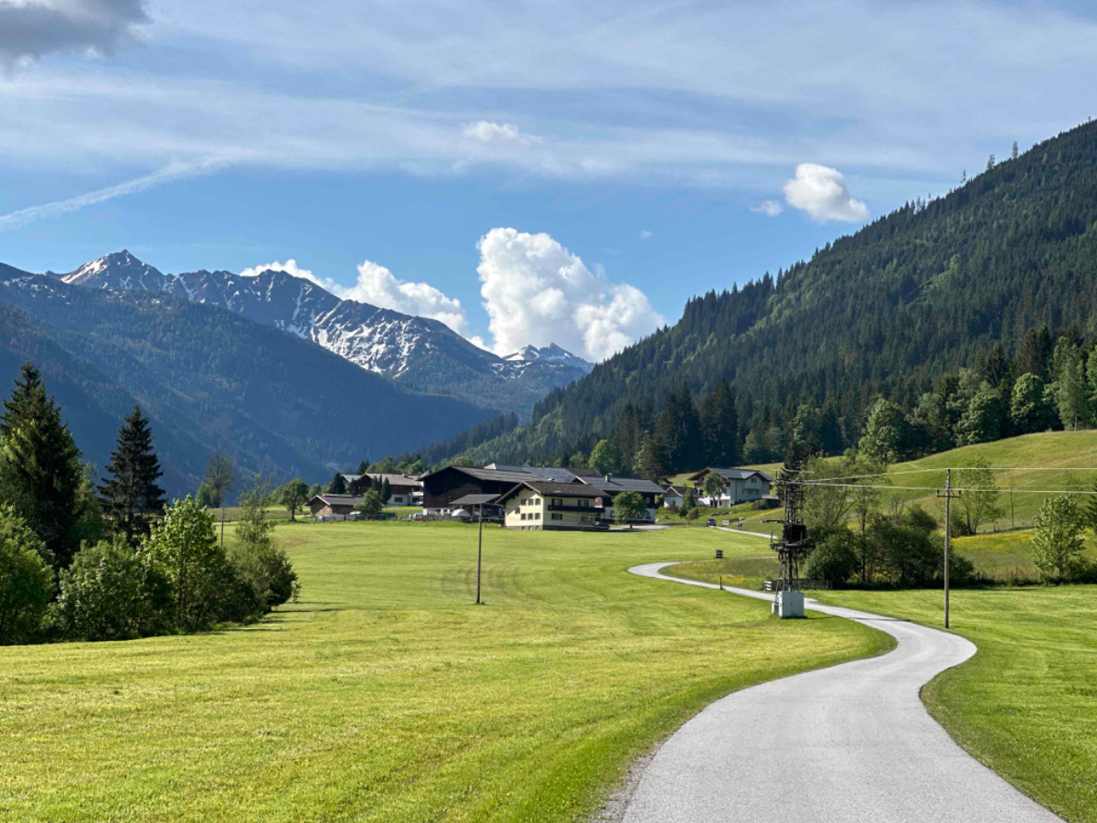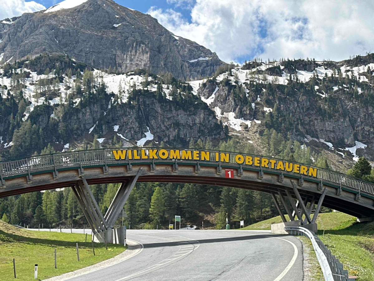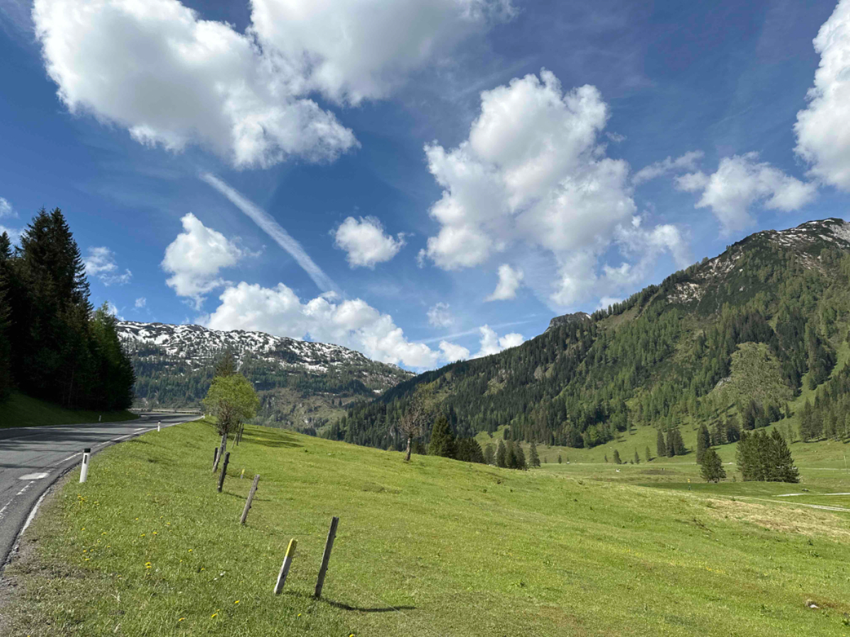 Wir vertratschen uns, und so ist es bereits 9:15 bis ich in die Gänge komme. Es ist ziemlich kühl, aber es geht eh gleich bergwärts, wenn auch vorerst noch mäßig ansteigend, entlang eines rauschenden Gebirgsbachs auf schönen Radwegen. Aber bald muss ich auf die Bundesstraße und dann geht es auch schon hinauf, in die vor mir liegenden Berge. Das Verkehrsaufkommen ist erträglich, es sind mehr Motorräder als Autos unterwegs, eine beliebte Bikerstrecke, ganz offensichtlich. Es folgen steile und weniger steile Abschnitte, aber anstrengend ist es in jeder Minute. Die Landschaft ist berauschend schön, aber es rauscht auch in meinen Ohren, und der Berg nimmt kein Ende. Nach 20km zwei Stunden und fast 1000 Höhenmeter komme ich endlich oben an, es ist saukalt. Ich bin froh oben zu sein, aber nicht stolz auf meine Leistung. Mein Held ist ein Radfahrer ohne Motor Unterstützung, den ich irgendwo mitten am Berg überholt habe. Auch er war mit Packtaschen beladen und kämpfte sich nach oben. Ich habe ihm meinen Respekt ausgesprochen, wenn er auch mindestens dreißig Jahre jünger war als ich. Durch den Ort bläst mir ein kalter schneidiger Wind entgegen. Ich muss raus aus den total durchschwitzten Klamotten, um mich nicht zu verkühlen. Ich suche mir eine windgeschützte Ecke und ziehe mich um. Obertauern ist eine Geisterstadt, nicht ein einziges Lokal hat geöffnet, sind wohl alle im Zwischensaison Urlaub, das Geld vom Winter ausgeben. Sei ihnen vergönnt. Nun geht es aber hinunter, es wird eine rasante Abfahrt :-) Gut dass ich trockene und winddichte Kleidung anhabe, der kalte Wind nimmt noch zu und beutelt mich ordentlich. Als es weniger steil wird, muss ich wegen des Gegenwindes sogar bergab treten. Wenigstens wird die Luft wieder wärmer, je weiter ich runter komme. Ich stoppe in Mauterndorf, um meine Freunde Hermi und Hans vom Hotel Steffner Wallner zu besuchen. Aber sie sind leider nicht da, sind in Italien, wie gesagt, hart verdientes Geld der Wintersaison verbrauchen ;-) Chris der jüngere Sohn ist aber zuhause, wir trinken Tee und unterhalten uns über die Lage der Nation, während mein Akku wieder aufgetankt wird. Bei der Weiterfahrt habe ich wieder heftigen Gegenwind gegen den ich antreten muss, mühsam! Bei Tamsweg erreiche ich den R2, den Murradweg. Hier fahre ich durch einen der schönsten Abschnitte dieses Weges entlang der noch jungen und sauberen Mur, und erinnere mich an unsere erste Radreise, hier am Murradweg hat es begonnen :-)