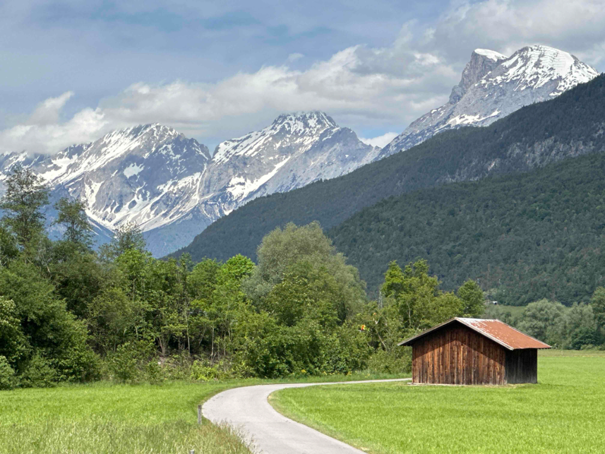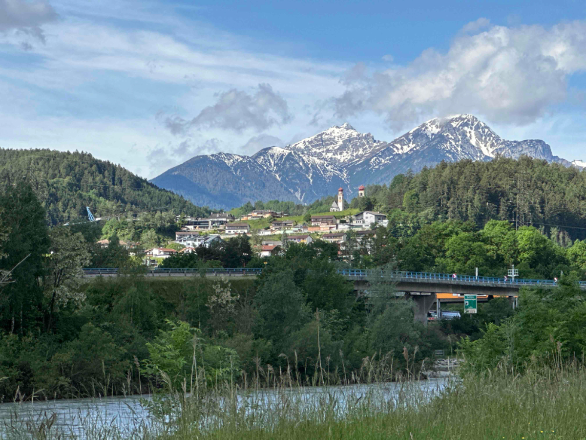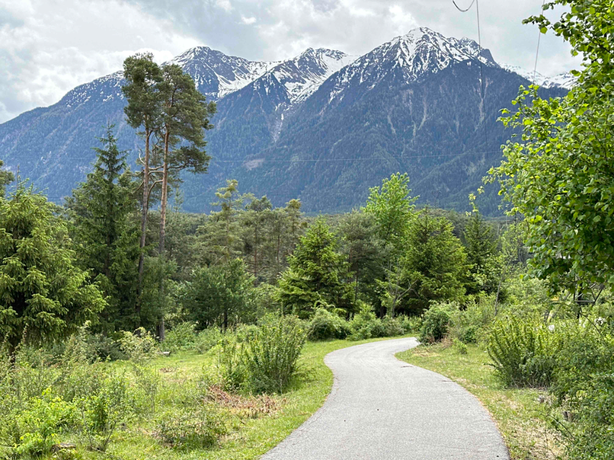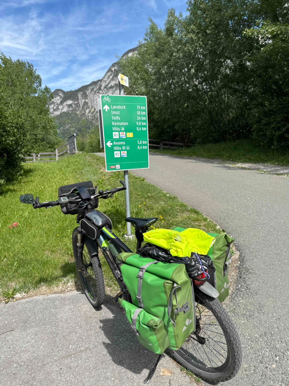 Schon Tag sieben, heute bin ich eine Woche unterwegs. Dieses tägliche Blogschreiben lässt mich den Tag nochmals revue passieren, ohne dieses tägliche Schreiben würde vieles gleich wieder in der ewigen Vergessenheit versinken, ich kann mich doch schon heute nicht mehr erinnern, wo genau ich vorgestern war, aber ich kann’s ja nachlesen ;-) Der Wetterbericht für heute hat gestern am Abend nichts Gutes verlauten lassen, umso überraschter war ich heute früh, dass es leidlich schön zu sein schien, als ich den Vorhang zurück zog. Das Frühstück wurde dem Rest des Hauses durchaus gerecht, es war alles da. Mancher würde vielleicht sagen, besser geht immer, aber es wäre die pure Verschwendung gewesen. Mein Rad trage ich die enge Treppe wieder hinunter, fürs Gepäck nehme ich den Lift. Um neun radle ich aus Wattens hinaus, es ist wolkig, aber mit Sonnenfenstern in meine Fahrtrichtung. Es liegen wieder über 80km vor mir, sollte aber kein Problem sein, laut Höhenprofil geht es die ersten 50km nur ganz moderat bergauf, dem Gefälle des Inn gegen die Flußrichtung folgend. So ist es dann auch, ich radle heute wirklich ganz gemütlich dahin, brauche kaum Unterstützung und es macht Spaß. Bald ist Innsbruck erreicht, über eine breite Promenade zwischen Inn und Bundesstraße radle ich in die Stadt hinein. Es ist zu früh für eine längere Pause und wer weiß wie sich das Wetter entwickelt, also beschließe ich, nach einigen Fotos bald weiter zu fahren. Der Innradweg führt wie der Name vermuten lässt, meist entlang des Inn dahin, Fast immer auf Radwegen, aber manchmal auch weg vom Wasser durch die Dörfer. Die Beschilderung des Radweges ist wirklich vorbildlich gemacht, habe ich anderswo schon ganz anders erlebt. Heute gibt es wieder mal eine Baustelle mit einer größeren Umleitung. Zuerst gibts auch wieder eine Beschilderung der Umleitungsstrecke, aber irgendwann ists dann vorbei damit, und ich folge mehr meiner Intuition. Ich befinde mich in der weiten Ebene des Inntals, verfahren kann ich mich eh nicht, das Tal ist ja links und rechts mit hohen Bergen begrenzt ;-) Das Inntal ist einziger großer Gemüsegarten, Feld an Feld, dazwischen Folientunnel, und überall läuft die Bewässerung auf Hochtouren, die Erde ist staubtrocken. Aber in den kommenden Tagen wird es sicher Regen geben, nur für mich hoffentlich heute noch nicht. Nach einigen km erreiche ich meine Route wieder und folge dem Navi. Seit ich in Tirol bin, liegt ein schwerer „Duft“ in der Luft, es riecht ständig nach Stall, aber auch kein Wunder, hier wird kräftigst gedüngt, teilweise steht die Gülle auf den Feldern. Bisher ist es der anspruchsloseste aber auch unspektakulärste Abschnitt der Gsiberg-Tour, aber es wird noch. An den letzten 20 km geht es doch wieder zum Teil schön zackig hinauf, aber in einer wunderschönen Umgebung, nach Roppen fahre ich durch einen Kiefernwald hinauf, hinunter, rauf und runter, und komme dann in ein enges Tal, das nur Platz für die Bahngleise, den Fluß und den Radweg lässt, mit Blick auf vor mir in der Ferne aufragende Berge. Am Ende erreiche ich Imst, mein heutiges Ziel. Um 15 Uhr checke ich ein, ein wunderschöner alter Gasthof / Hotel, ich habe das Chefzimmer bekommen, alles gut, auch das Bier und die Küche.