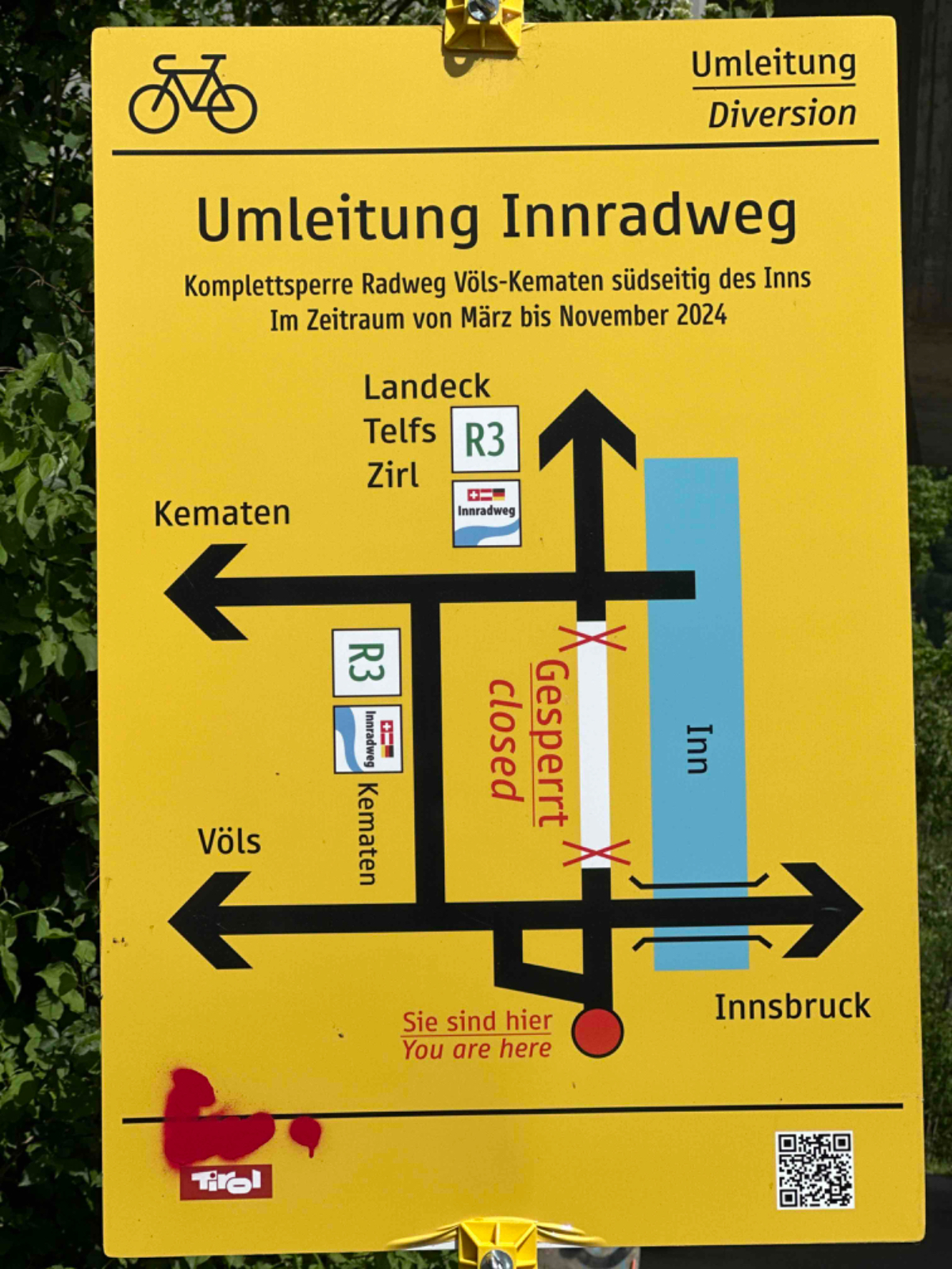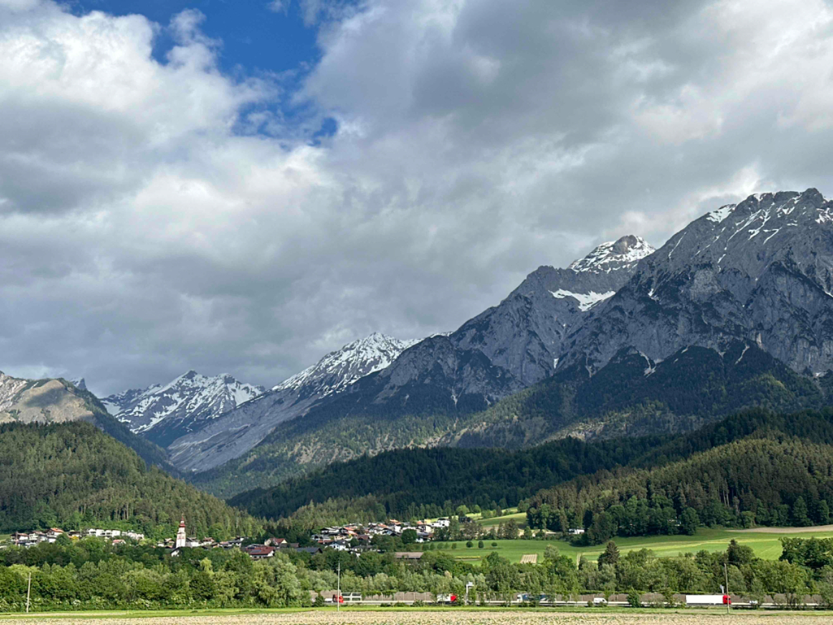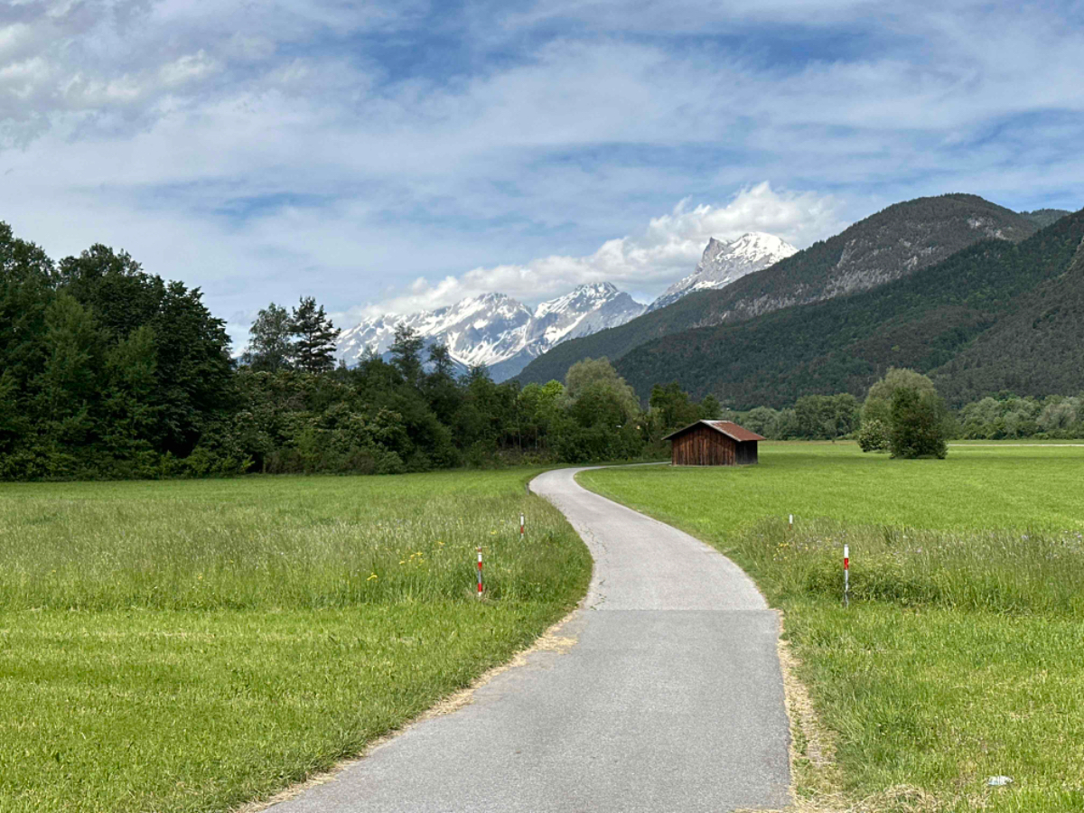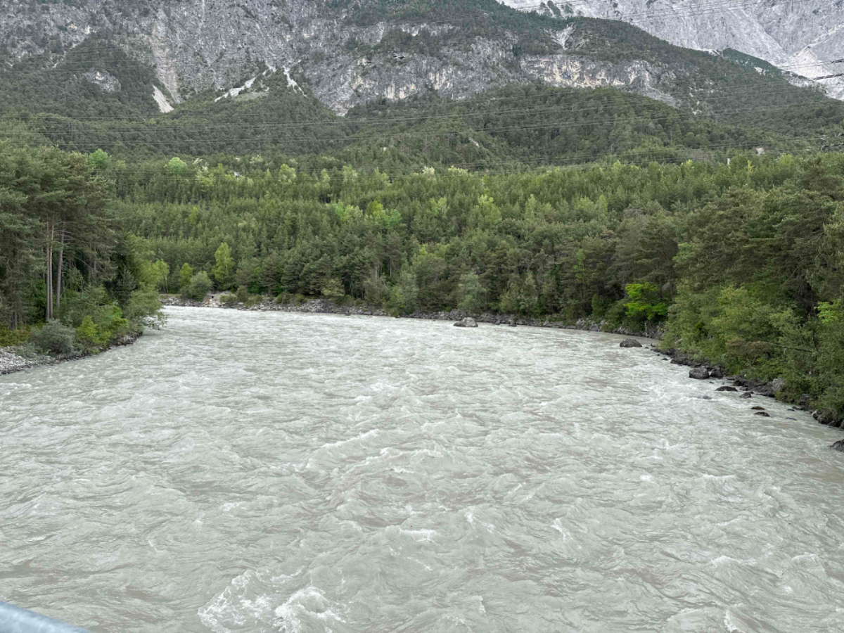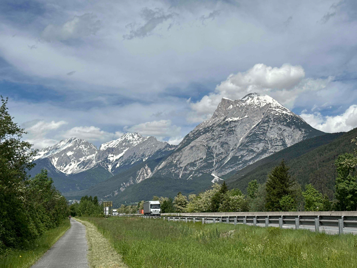 Schon Tag sieben, heute bin ich eine Woche unterwegs. Dieses tägliche Blogschreiben lässt mich den Tag nochmals revue passieren, ohne dieses tägliche Schreiben würde vieles gleich wieder in der ewigen Vergessenheit versinken, ich kann mich doch schon heute nicht mehr erinnern, wo genau ich vorgestern war, aber ich kann’s ja nachlesen ;-) Der Wetterbericht für heute hat gestern am Abend nichts Gutes verlauten lassen, umso überraschter war ich heute früh, dass es leidlich schön zu sein schien, als ich den Vorhang zurück zog. Das Frühstück wurde dem Rest des Hauses durchaus gerecht, es war alles da. Mancher würde vielleicht sagen, besser geht immer, aber es wäre die pure Verschwendung gewesen. Mein Rad trage ich die enge Treppe wieder hinunter, fürs Gepäck nehme ich den Lift. Um neun radle ich aus Wattens hinaus, es ist wolkig, aber mit Sonnenfenstern in meine Fahrtrichtung. Es liegen wieder über 80km vor mir, sollte aber kein Problem sein, laut Höhenprofil geht es die ersten 50km nur ganz moderat bergauf, dem Gefälle des Inn gegen die Flußrichtung folgend. So ist es dann auch, ich radle heute wirklich ganz gemütlich dahin, brauche kaum Unterstützung und es macht Spaß. Bald ist Innsbruck erreicht, über eine breite Promenade zwischen Inn und Bundesstraße radle ich in die Stadt hinein. Es ist zu früh für eine längere Pause und wer weiß wie sich das Wetter entwickelt, also beschließe ich, nach einigen Fotos bald weiter zu fahren. Der Innradweg führt wie der Name vermuten lässt, meist entlang des Inn dahin, Fast immer auf Radwegen, aber manchmal auch weg vom Wasser durch die Dörfer. Die Beschilderung des Radweges ist wirklich vorbildlich gemacht, habe ich anderswo schon ganz anders erlebt. Heute gibt es wieder mal eine Baustelle mit einer größeren Umleitung. Zuerst gibts auch wieder eine Beschilderung der Umleitungsstrecke, aber irgendwann ists dann vorbei damit, und ich folge mehr meiner Intuition. Ich befinde mich in der weiten Ebene des Inntals, verfahren kann ich mich eh nicht, das Tal ist ja links und rechts mit hohen Bergen begrenzt ;-) Das Inntal ist einziger großer Gemüsegarten, Feld an Feld, dazwischen Folientunnel, und überall läuft die Bewässerung auf Hochtouren, die Erde ist staubtrocken. Aber in den kommenden Tagen wird es sicher Regen geben, nur für mich hoffentlich heute noch nicht. Nach einigen km erreiche ich meine Route wieder und folge dem Navi. Seit ich in Tirol bin, liegt ein schwerer „Duft“ in der Luft, es riecht ständig nach Stall, aber auch kein Wunder, hier wird kräftigst gedüngt, teilweise steht die Gülle auf den Feldern. Bisher ist es der anspruchsloseste aber auch unspektakulärste Abschnitt der Gsiberg-Tour, aber es wird noch. An den letzten 20 km geht es doch wieder zum Teil schön zackig hinauf, aber in einer wunderschönen Umgebung, nach Roppen fahre ich durch einen Kiefernwald hinauf, hinunter, rauf und runter, und komme dann in ein enges Tal, das nur Platz für die Bahngleise, den Fluß und den Radweg lässt, mit Blick auf vor mir in der Ferne aufragende Berge. Am Ende erreiche ich Imst, mein heutiges Ziel. Um 15 Uhr checke ich ein, ein wunderschöner alter Gasthof / Hotel, ich habe das Chefzimmer bekommen, alles gut, auch das Bier und die Küche.