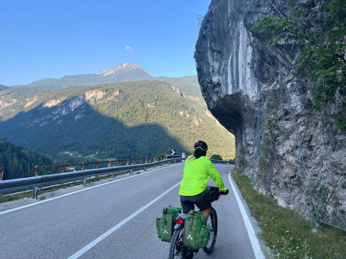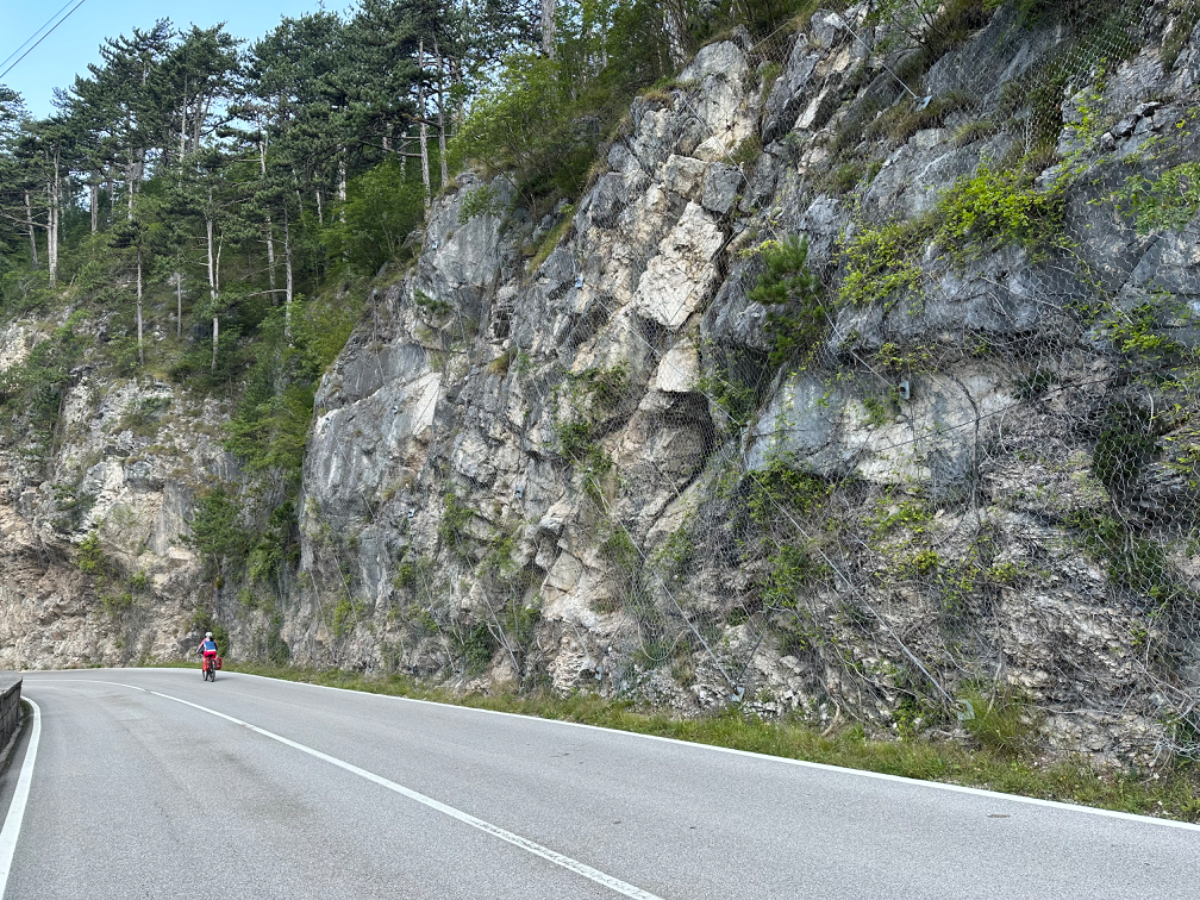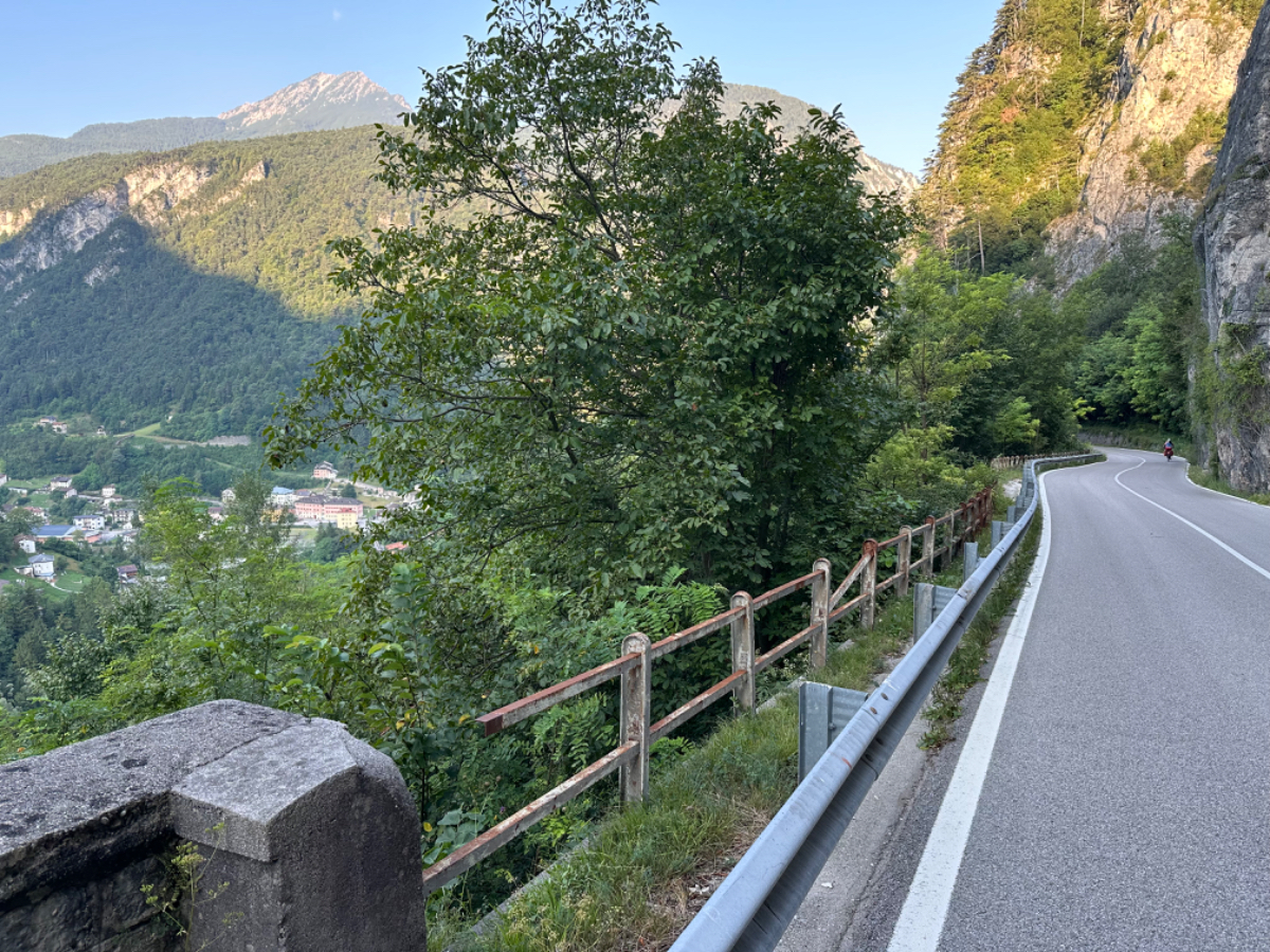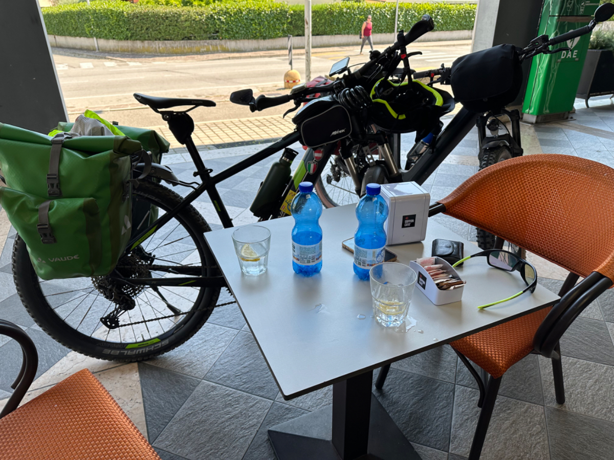Zum Frühstück gabs Joghurt, Käse und Brot von gestern, es gab nicht einmal einen Wasserkocher um Tee zu machen. Anyway, ist schon Geschichte. Um 7:45 fuhren wir los, das Wetter gut, ohne Jacke zu kalt. Der Radweg führt steil bergab, bald erreichen wir eine Strasse, die für den Individualverkehr gesperrt ist, nur Radfahrer und Anrainer dürfen die perfekt ausgebaute Strasse benützen. Es ist ein absoluter Hochgenuss über Serpentinen ins Tal zu brausen, in dem noch kein Sonnenstrahl hereinfällt. Landschaftlich einfach wieder wunderschön :-) Wir fahren durch dieses Tal entlang eines Flusses zumeist auf Radwegen oder kaum befahrenen Nebenstraßen und je weiter wir aus dem Tal hinauskommen, steigt merklich die Temperatur. Bei einer Bar gönnen wir uns Kaffee und Tee und ein Croisant. Der Wirt erzählt, dass es in den letzten Wochen hier sehr viel Regen gab, auch Hagel mit der Größe einer Orange war dabei. Wir haben auch etliche Autos mit entsprechenden Schäden gesehen. Wir fahren weiter. Am Lago di Santa Groce gibt es einen breiten Sandstrand, der wie auch die anschließenden Wiesen gut belegt ist. Das Wasser ist verlockend, aber wir fahren weiter am Ufer des Sees entlang, es liegt noch viel Schönes auf unserem Weg. So konnten wir heute Italienische Ingenieurskunst bewundern. Ein Tal, durchzogen von Brücken von gleich zwei Autobahnen in schwindelnder Höhe und endlos scheinende Brücken entlang des Berghangs. Wir hatten heute schon einige Umleitungen, am Ende dieses Tals liegt ein idyllischer See, an dessen Ufer die Radroute verläuft, verlaufen sollte. Totalsperre, mit der Option Autobahn oder Singletrail auf der anderen Uferseite. Und der Trail hat es in sich, unsere Räder mit Gepäck sind absolut ungeeignet um die steilen Geröll Anstiege zu bewältigen, aber was soll’s, es gibt keine Alternative, da müssen wir durch. Mittlerweile ist es heiß geworden, der Schweiß fließt in Ströme, als wir endlich durch sind. Wir erreichen wieder ein Ufergestade, das zum Baden einlädt. Zumindest unsere Beine kühlen wir im See und machen im Schatten eine von vielen weiteren Trinkpausen. Hinter uns in den Bergen rumpelt es, ein Gewitter zieht auf, also weiter. In Vittorio Veneto, am sehr stimmungsvollen Hauptplatz, gönnen wir uns ein Gelato vom Feinsten :-) Aber das Wetter drängt zum Aufbruch. Bis Susegana fahren wir größtenteils auf Nebenstraßen rauf und runter und durchqueren die Prosecco Region, aber ich habe keinen Blick mehr für die Landschaft, es ist HOT, HOT, HOT…….
