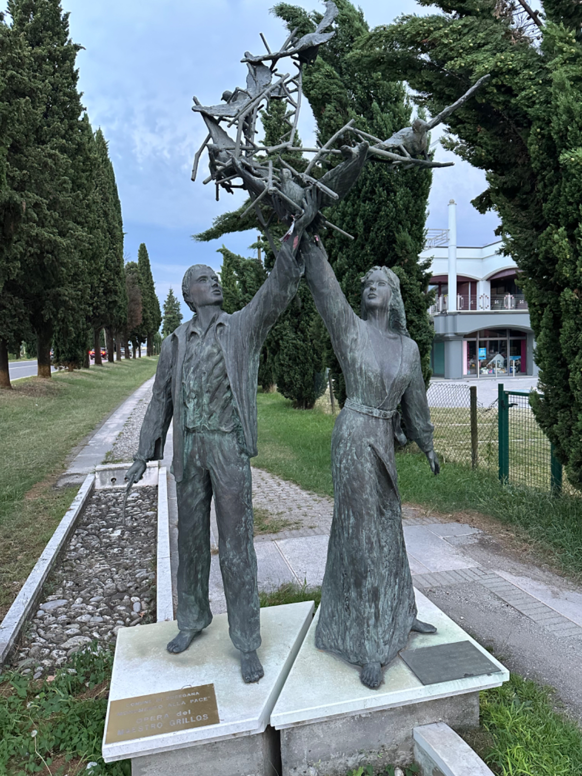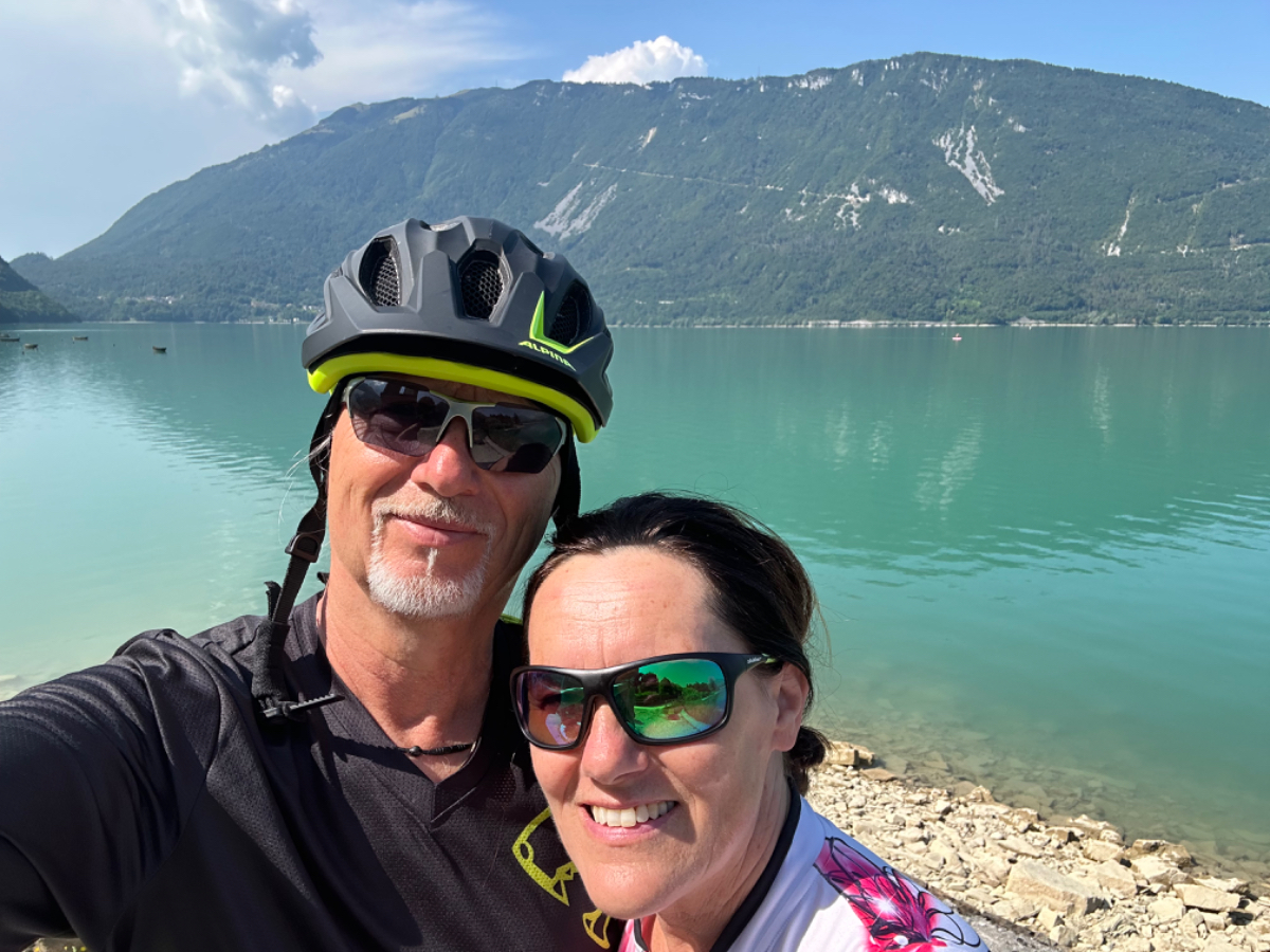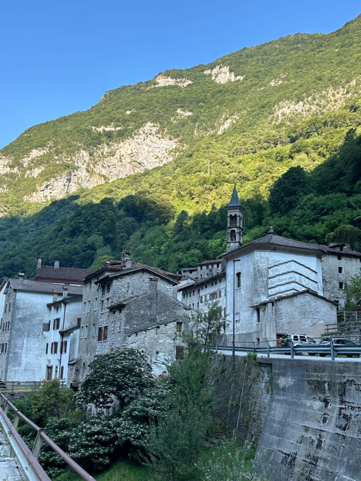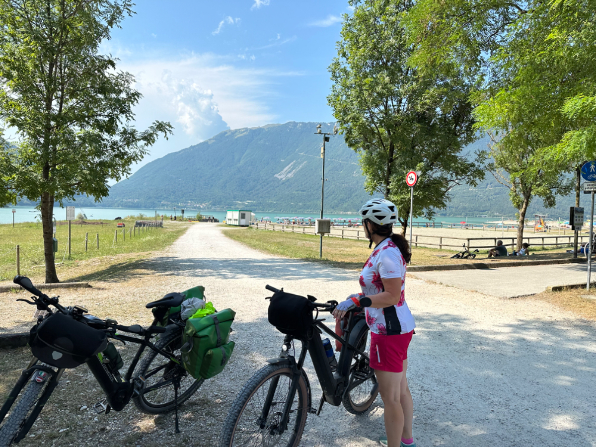 Zum Frühstück gabs Joghurt, Käse und Brot von gestern, es gab nicht einmal einen Wasserkocher um Tee zu machen. Anyway, ist schon Geschichte. Um 7:45 fuhren wir los, das Wetter gut, ohne Jacke zu kalt. Der Radweg führt steil bergab, bald erreichen wir eine Strasse, die für den Individualverkehr gesperrt ist, nur Radfahrer und Anrainer dürfen die perfekt ausgebaute Strasse benützen. Es ist ein absoluter Hochgenuss über Serpentinen ins Tal zu brausen, in dem noch kein Sonnenstrahl hereinfällt. Landschaftlich einfach wieder wunderschön :-) Wir fahren durch dieses Tal entlang eines Flusses zumeist auf Radwegen oder kaum befahrenen Nebenstraßen und je weiter wir aus dem Tal hinauskommen, steigt merklich die Temperatur. Bei einer Bar gönnen wir uns Kaffee und Tee und ein Croisant. Der Wirt erzählt, dass es in den letzten Wochen hier sehr viel Regen gab, auch Hagel mit der Größe einer Orange war dabei. Wir haben auch etliche Autos mit entsprechenden Schäden gesehen. Wir fahren weiter. Am Lago di Santa Groce gibt es einen breiten Sandstrand, der wie auch die anschließenden Wiesen gut belegt ist. Das Wasser ist verlockend, aber wir fahren weiter am Ufer des Sees entlang, es liegt noch viel Schönes auf unserem Weg. So konnten wir heute Italienische Ingenieurskunst bewundern. Ein Tal, durchzogen von Brücken von gleich zwei Autobahnen in schwindelnder Höhe und endlos scheinende Brücken entlang des Berghangs. Wir hatten heute schon einige Umleitungen, am Ende dieses Tals liegt ein idyllischer See, an dessen Ufer die Radroute verläuft, verlaufen sollte. Totalsperre, mit der Option Autobahn oder Singletrail auf der anderen Uferseite. Und der Trail hat es in sich, unsere Räder mit Gepäck sind absolut ungeeignet um die steilen Geröll Anstiege zu bewältigen, aber was soll’s, es gibt keine Alternative, da müssen wir durch. Mittlerweile ist es heiß geworden, der Schweiß fließt in Ströme, als wir endlich durch sind. Wir erreichen wieder ein Ufergestade, das zum Baden einlädt. Zumindest unsere Beine kühlen wir im See und machen im Schatten eine von vielen weiteren Trinkpausen. Hinter uns in den Bergen rumpelt es, ein Gewitter zieht auf, also weiter. In Vittorio Veneto, am sehr stimmungsvollen Hauptplatz, gönnen wir uns ein Gelato vom Feinsten :-) Aber das Wetter drängt zum Aufbruch. Bis Susegana fahren wir größtenteils auf Nebenstraßen rauf und runter und durchqueren die Prosecco Region, aber ich habe keinen Blick mehr für die Landschaft, es ist HOT, HOT, HOT…….