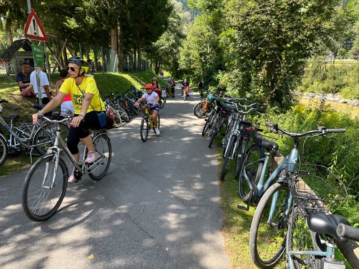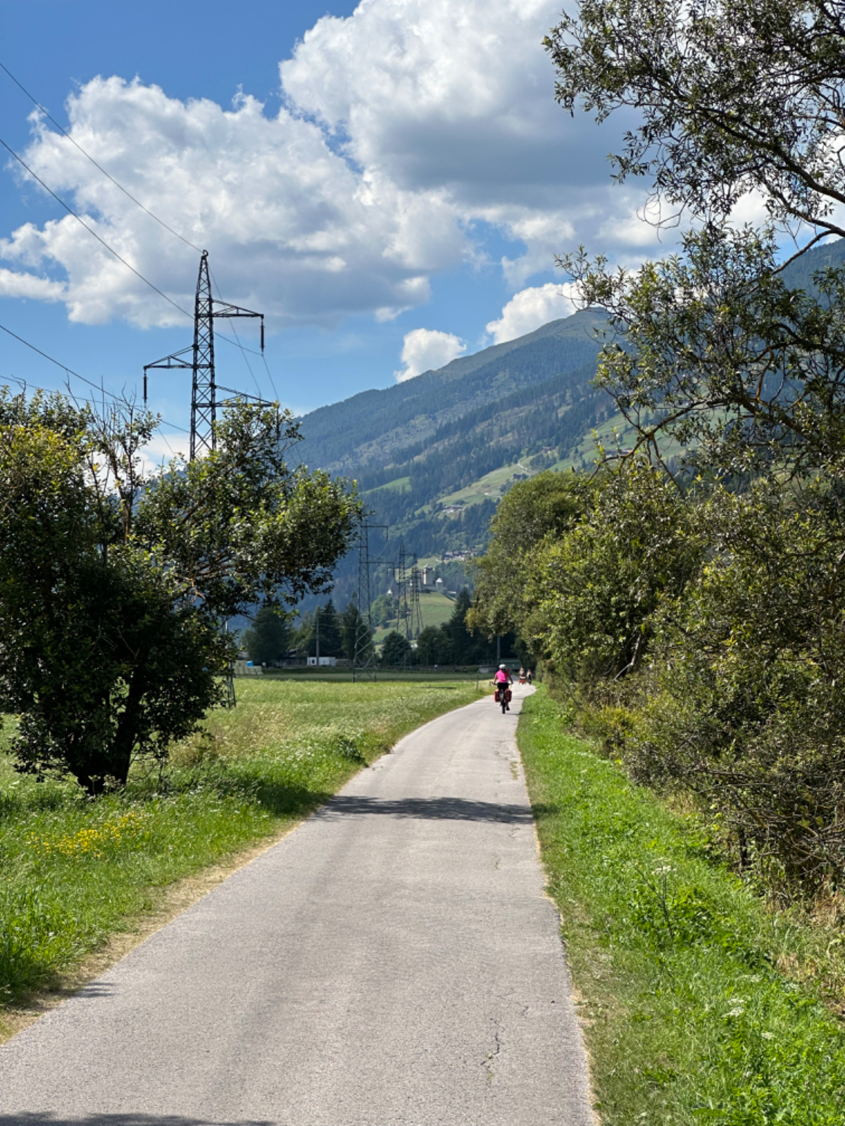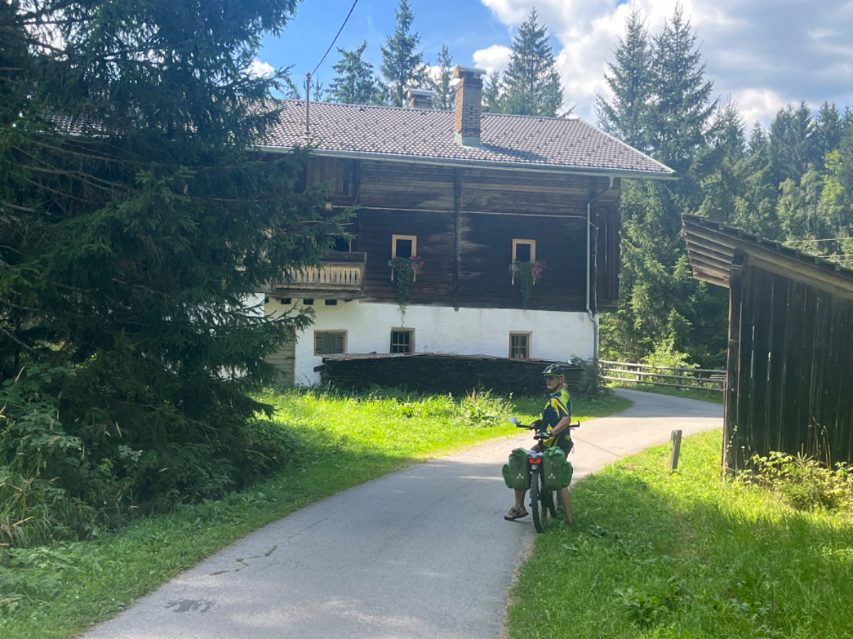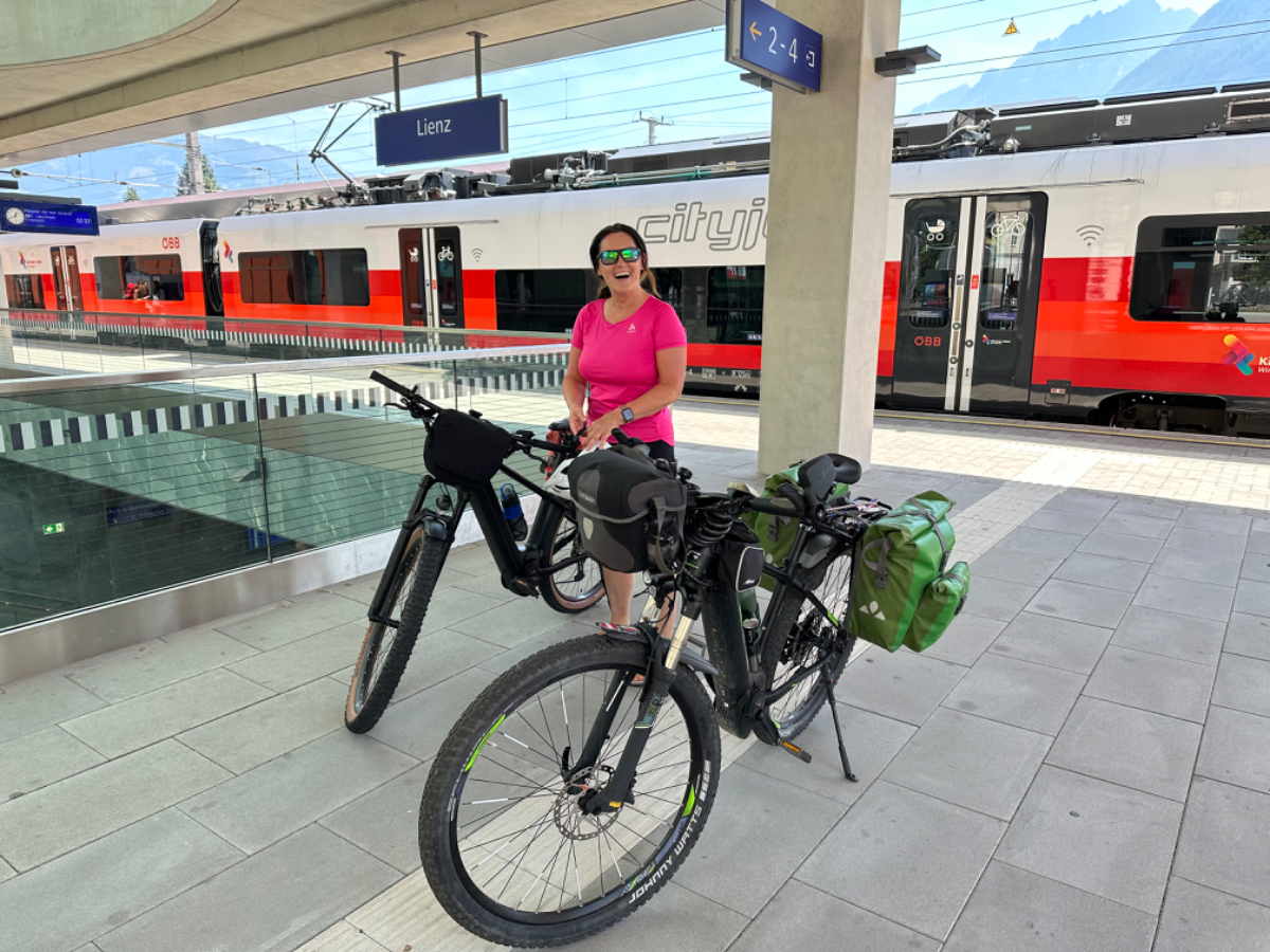 Nach einem Überraschungsfrühstück (Danke Eva) starten wir um 7 Uhr Richtung Villach. Das Wetter ist gut, der Verkehr mäßig und so sind wir bald da. Ich parke direkt vor dem Villacher Bahnhof, zwischen zwei Halteverbotstafeln, auf dem Gehsteig, und auch noch direkt vor dem Polizeiwachzimmer. Das alles war mir nicht bewusst, wir wollten nur ganz schnell die Räder samt Gepäck abladen, bevor ich in die Tiefgarage fahre. Den Beamten blieb das allerdings nicht verborgen und es dauerte nicht lange, bis mich ein Polizist zur Rede stellte. Ich konnte ihn gnädig stimmen und er beließ es bei einer einmaligen Abmahnung. Vielen Dank, Glück gehabt! In jedem Fall ein gelungener Start in unsere Reise :-) Die Zugfahrt nach Lienz vergeht wie im Flug, ab Spittal wird die Landschaft immer schöner, die Berge links und rechts immer höher, bis der Blick auf die Lienzer Dolomiten das Ende der Zugreise ankündigt. Der Zug war klimatisiert, da fühlte sich die Temperatur in Lienz noch heißer an, als es mit 31 Grad ohnehin war. Richtig heiß her geht es dann aber auf dem Radweg. Hunderte von Radfahrern kommen uns entgegen, vorwiegend italienische Familien brausen den Radweg herunter, und einige Male sind Kollisionen nur knapp zu vermeiden gewesen. Auch die Rettung hatte einen Einsatz wegen eines Verunglückten. Es ist dies der Italiener Abschnitt des Drau Radweges, von Innichen bis Lienz. In Innichen stehen hunderte von Fahrrädern zum Tagesverleih bereit, und retour geht es mit dem Zug mit eigens angehängten Waggons nur für die unendlich vielen Räder, Tag für Tag den Sommer lang. In unsere Fahrtrichtung hingegen war so gut wie kein Verkehr. Es waren trotzdem sehr schöne 33km, und nach Ankunft in Lienz gönnten wir uns am Hauptplatz zwei Ankommensbiere ;-) Ich bin ja mit einem kleinen Handicap in die Tour gestartet, vor zwei Wochen habe ich mir im linken Oberschenkel einen Muskel eingerissen, und vor zwei Tagen habe ich mir die rechte Schulter verrissen, mit starken Schmerzen bei bestimmten Bewegungen, beim Radfahren nicht zu vermeiden. Ich wurde gestern noch von meiner Tochter professionell getapet, von Riki gesalbt, und mit leichter Schmerzunterdrückung und moderater elektrischer Unterstützung ist es doch ganz gut gegangen heute. Bin sehr zufrieden, wenns so bleibt!