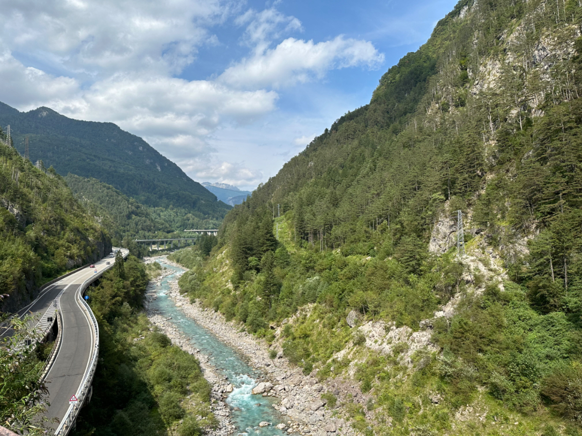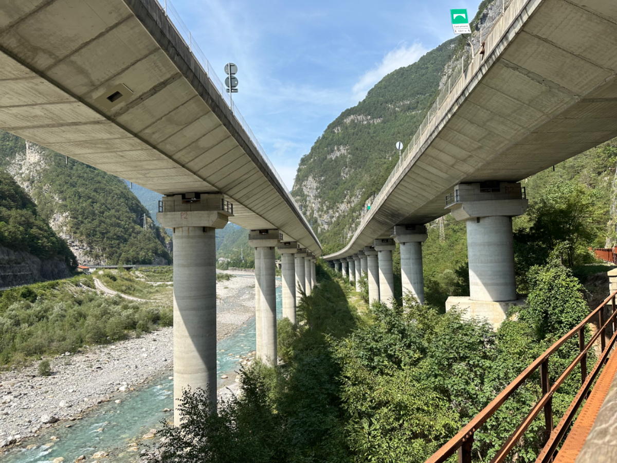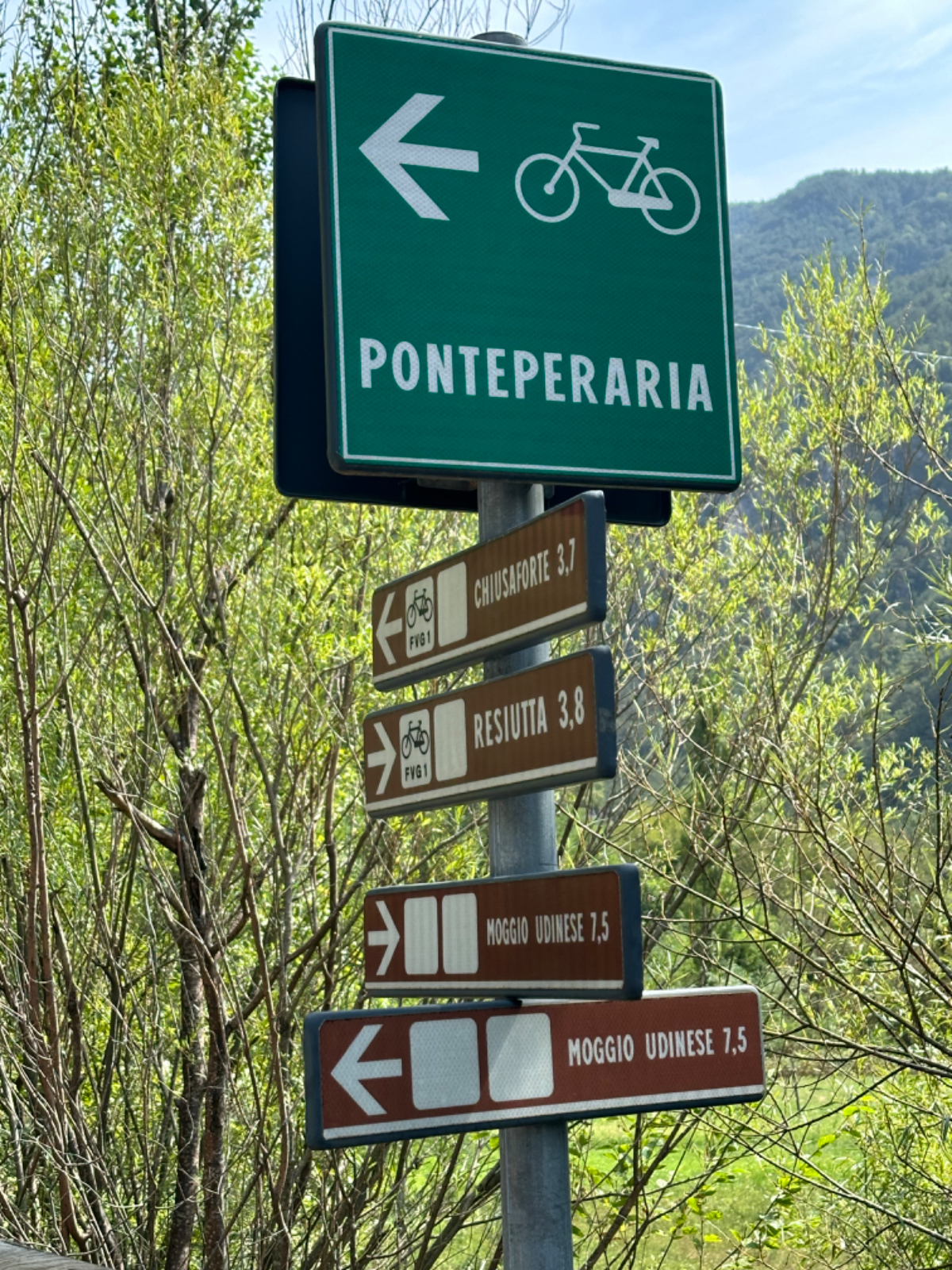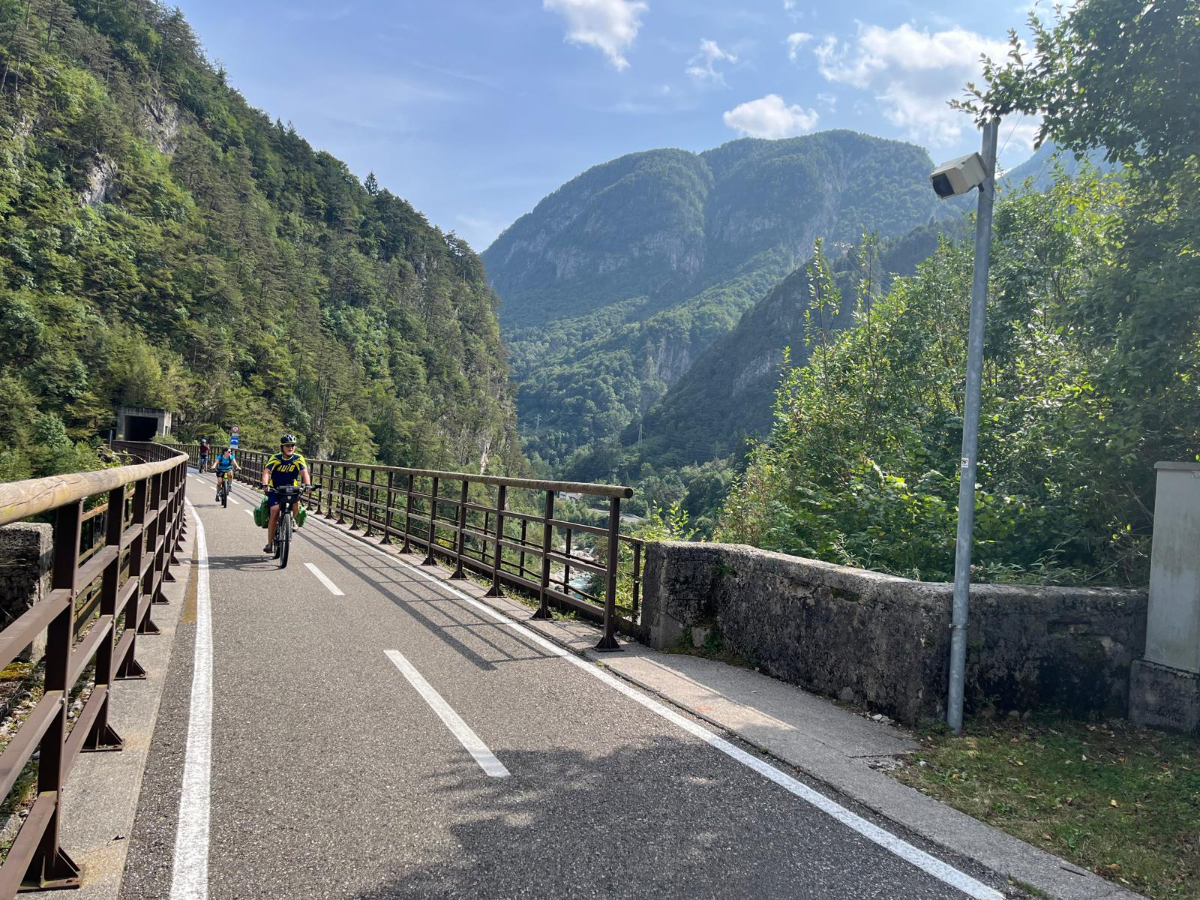 bremst, als wir die ersten Kilometer der Pontebana bergan radeln. In Venzone machen wir Rast in der