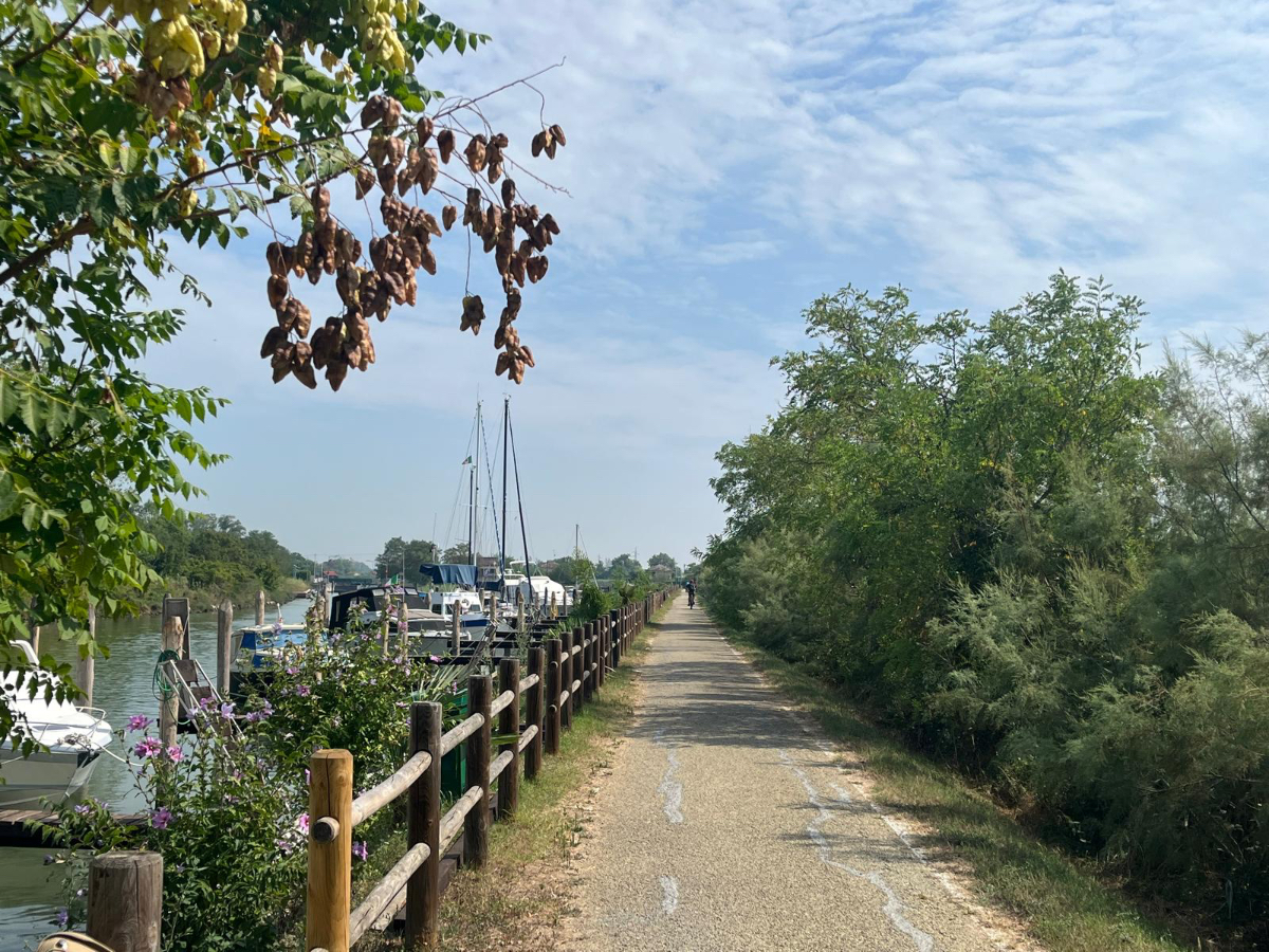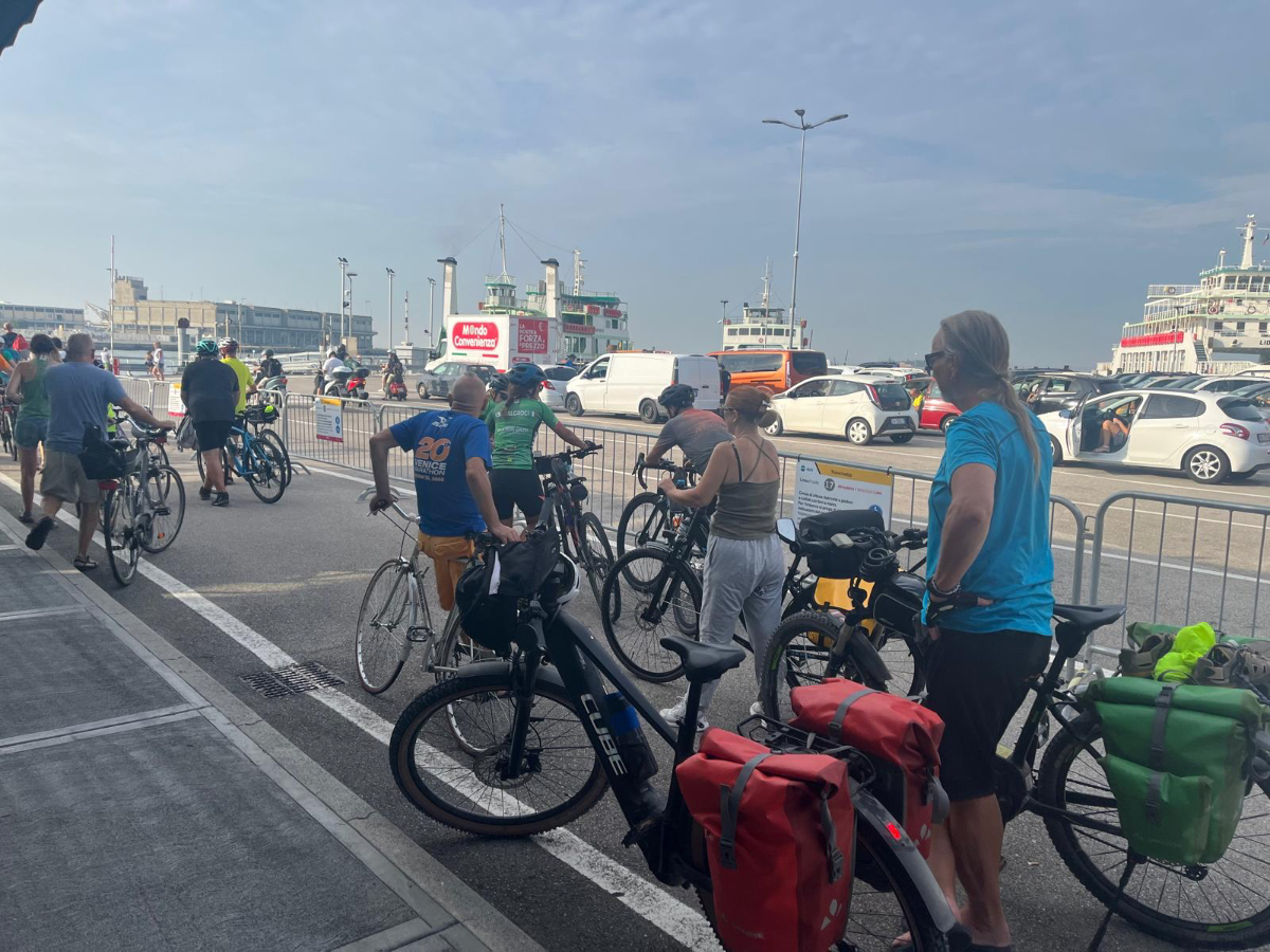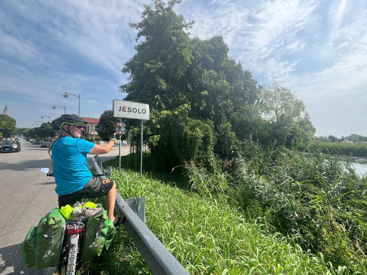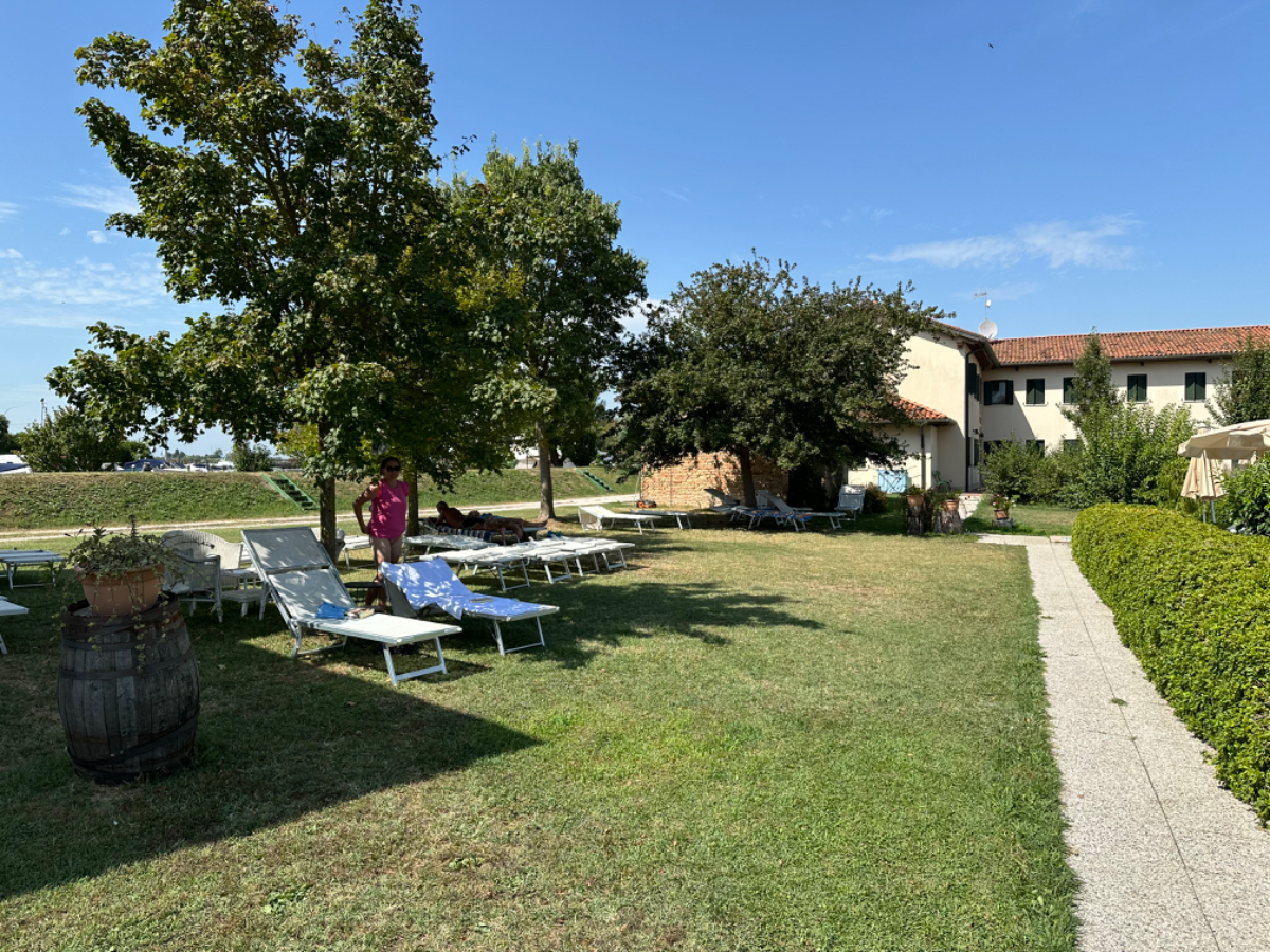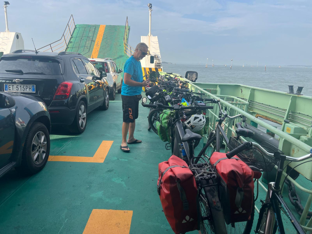 Venedig am Morgen beginnt wie der gestrige Tag geendet hat. Touristen und Einheimische am Weg zur Arbeit strömen vom Bahnhof bzw. Busterminal in Richtung Innenstadt, nur in der Nacht war es meist in umgekehrter Richtung. Jedenfalls ist um halb acht Uhr rege Betriebsamkeit, und wir nach einem Quickie (Frühstück) bereits wieder mitten drin. Im Bici Park wieder mal Verständnisschwierigkeiten, aber alles löst sich in Wohlgefallen, nur dass ich bereits um diese Zeit schon das erste mal durchschwitzt bin. Heute fahren wir mit der Fähre nach Punta Sabbioni, die Tickets haben wir bereits gestern gekauft, so erreichen wir früher als erwartet den Hafen und erreichen die Fähre um 8:20, voll Zeit gespart, weil Riki immer so drängelt ;-) In St.Nicolai (oder so ähnlich) sollen wir das Schiff wechseln, sprich umsteigen. Nur erfahren wir erst dort nach Nachfrage, dass es heute von diese Port keine Fähre nach Punta Sabbioni gibt, aber man verweist uns an eine nahegelegene Anlegestelle. Dort fährt eine Fähre, aber diese ist nicht wirklich für Radfahrer ausgelegt, speziell solche mit breitem Gepäck. Man heißt uns nicht gerade herzlich willkommen. Seí´s drum, wir erreichen unser Ziel und steigen in die Sättel. Es folgt bis Cavallino eine Fahrt auf herrlichen Radwegen, immer durch die Lagune oder entlang eines Flusses oder Kanals. In Cavallino machen wir eine erste Trinkpause in einer netten Bar, es ist heute diesig bewölkt, nicht zu heiß aber sehr schwül - trinken, trinken ist angesagt! Weiter geht es im Hinterland von Jesolo, die Skyline vom Lido ist nur in der Ferne zu erkennen, zum Glück müssen wir dort nicht hin. Es folgen kilometerlange Geraden, man wünscht sich wenigstens mal eine Kurve, aber es geht nur geradeaus, kein Ende in Sicht. Ein Schild am Straßenrand weist darauf hin, wir befinden uns nun im Reisland. Rechts der Strasse der Kanal, links über Kilometer eine Pappelallee, und dahinter endlose sattgrüne Reisfelder. Eine willkommene Abwechslung, darüber nachzusinnen, dass Reis nicht nur aus China kommt. Und bald darauf ist auch schon das heutige Tagesziel erreicht, Brian :-) Unser Quartier liegt am Zusammenfluss zweier Kanäle, hier ist auch der Liegeplatz/Marina einiger schöner Boote, 300.000 € aufwärts. Es gibt zwei großzügige Pools hier, und nach dem dringend notwendigen Wäschewaschen, verbringen wir den ganzen restlichen Tag am und im Pool, denn mittlerweile haben sich alle Wolken verzogen, und es ist wieder HOT as usual. Ich hoffe es bleibt so, doch der Wetterbericht verheißt für morgen leider Regen. Auch ok, solange es keine Unwetter gibt :-)