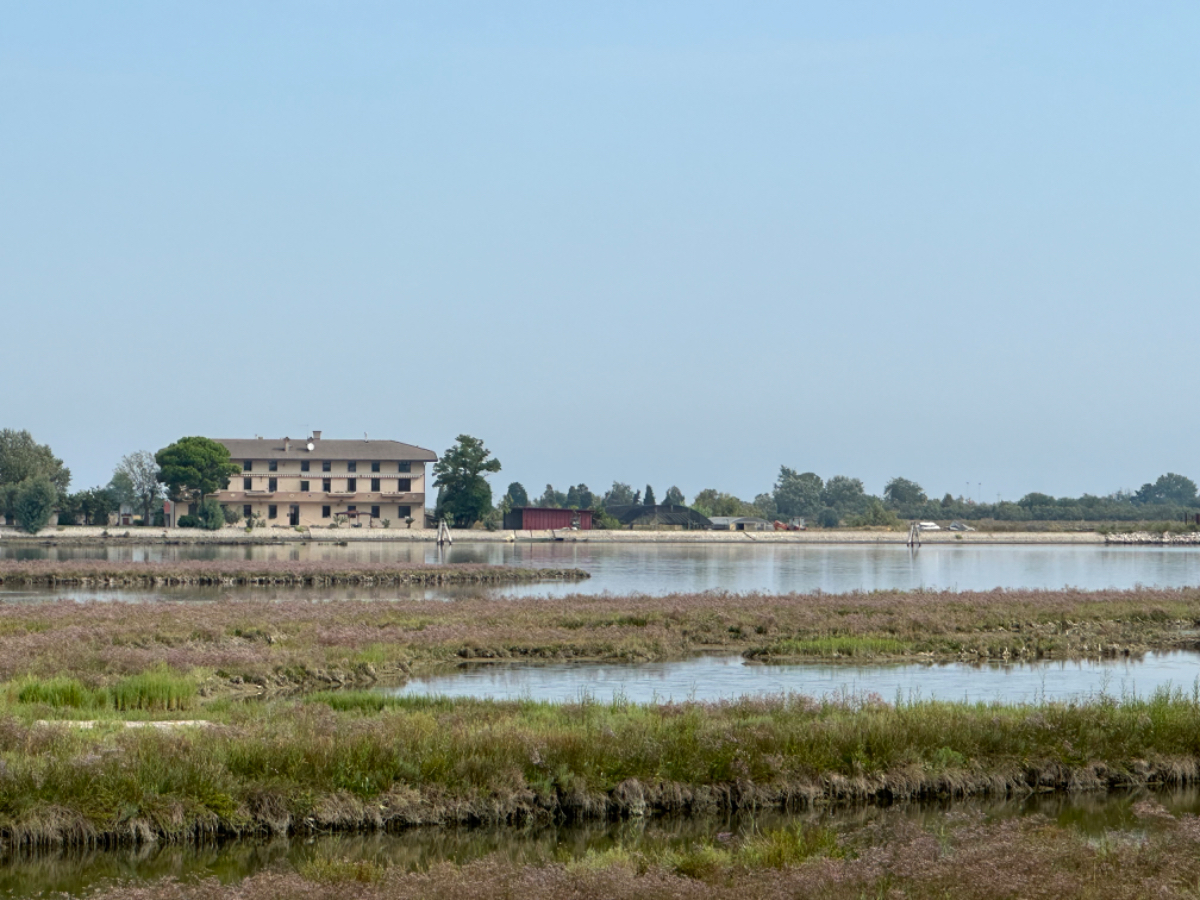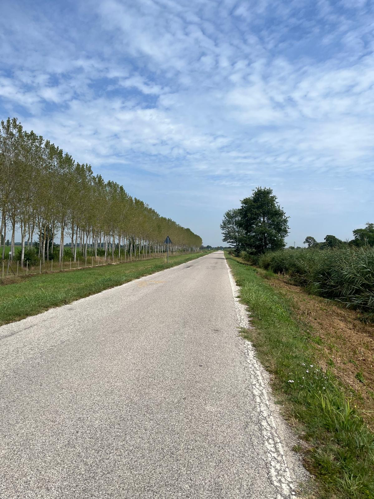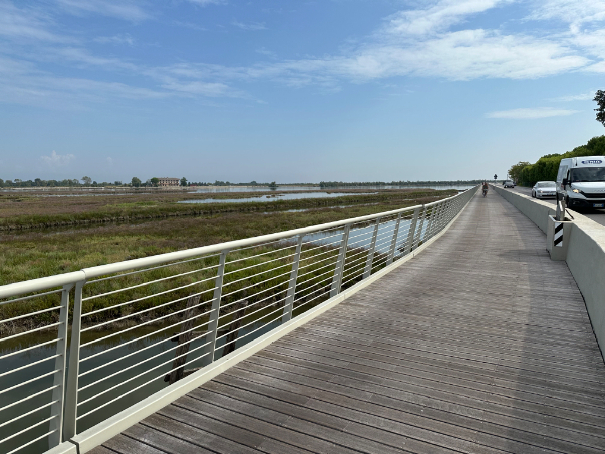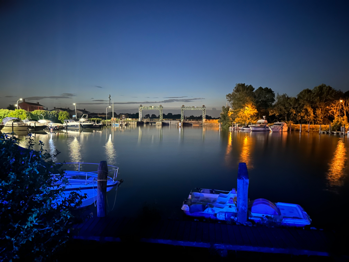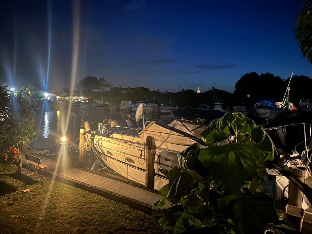 Venedig am Morgen beginnt wie der gestrige Tag geendet hat. Touristen und Einheimische am Weg zur Arbeit strömen vom Bahnhof bzw. Busterminal in Richtung Innenstadt, nur in der Nacht war es meist in umgekehrter Richtung. Jedenfalls ist um halb acht Uhr rege Betriebsamkeit, und wir nach einem Quickie (Frühstück) bereits wieder mitten drin. Im Bici Park wieder mal Verständnisschwierigkeiten, aber alles löst sich in Wohlgefallen, nur dass ich bereits um diese Zeit schon das erste mal durchschwitzt bin. Heute fahren wir mit der Fähre nach Punta Sabbioni, die Tickets haben wir bereits gestern gekauft, so erreichen wir früher als erwartet den Hafen und erreichen die Fähre um 8:20, voll Zeit gespart, weil Riki immer so drängelt ;-) In St.Nicolai (oder so ähnlich) sollen wir das Schiff wechseln, sprich umsteigen. Nur erfahren wir erst dort nach Nachfrage, dass es heute von diese Port keine Fähre nach Punta Sabbioni gibt, aber man verweist uns an eine nahegelegene Anlegestelle. Dort fährt eine Fähre, aber diese ist nicht wirklich für Radfahrer ausgelegt, speziell solche mit breitem Gepäck. Man heißt uns nicht gerade herzlich willkommen. Seí´s drum, wir erreichen unser Ziel und steigen in die Sättel. Es folgt bis Cavallino eine Fahrt auf herrlichen Radwegen, immer durch die Lagune oder entlang eines Flusses oder Kanals. In Cavallino machen wir eine erste Trinkpause in einer netten Bar, es ist heute diesig bewölkt, nicht zu heiß aber sehr schwül - trinken, trinken ist angesagt! Weiter geht es im Hinterland von Jesolo, die Skyline vom Lido ist nur in der Ferne zu erkennen, zum Glück müssen wir dort nicht hin. Es folgen kilometerlange Geraden, man wünscht sich wenigstens mal eine Kurve, aber es geht nur geradeaus, kein Ende in Sicht. Ein Schild am Straßenrand weist darauf hin, wir befinden uns nun im Reisland. Rechts der Strasse der Kanal, links über Kilometer eine Pappelallee, und dahinter endlose sattgrüne Reisfelder. Eine willkommene Abwechslung, darüber nachzusinnen, dass Reis nicht nur aus China kommt. Und bald darauf ist auch schon das heutige Tagesziel erreicht, Brian :-) Unser Quartier liegt am Zusammenfluss zweier Kanäle, hier ist auch der Liegeplatz/Marina einiger schöner Boote, 300.000 € aufwärts. Es gibt zwei großzügige Pools hier, und nach dem dringend notwendigen Wäschewaschen, verbringen wir den ganzen restlichen Tag am und im Pool, denn mittlerweile haben sich alle Wolken verzogen, und es ist wieder HOT as usual. Ich hoffe es bleibt so, doch der Wetterbericht verheißt für morgen leider Regen. Auch ok, solange es keine Unwetter gibt :-)