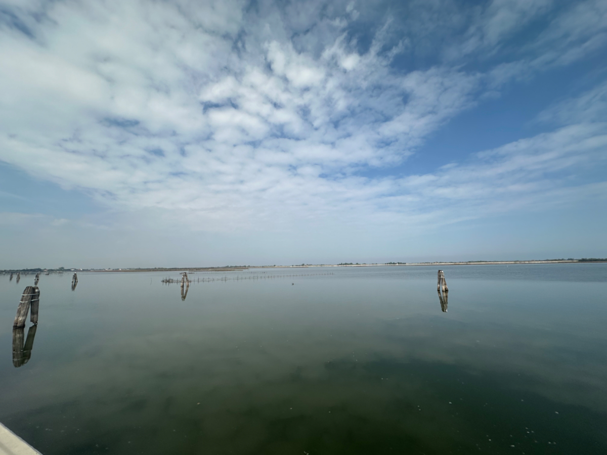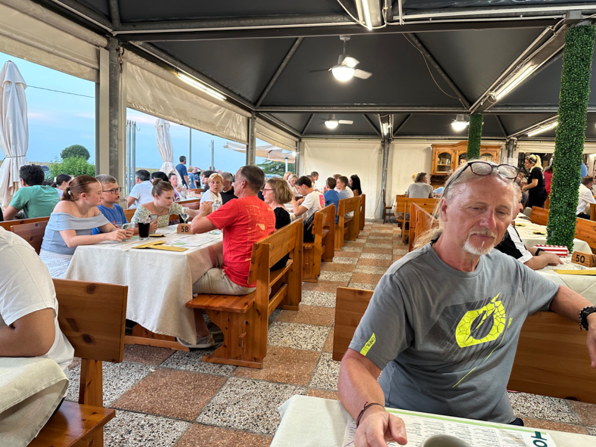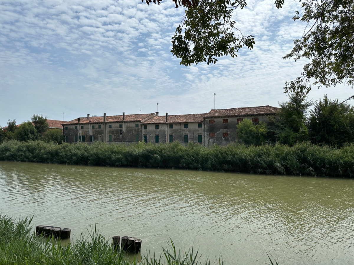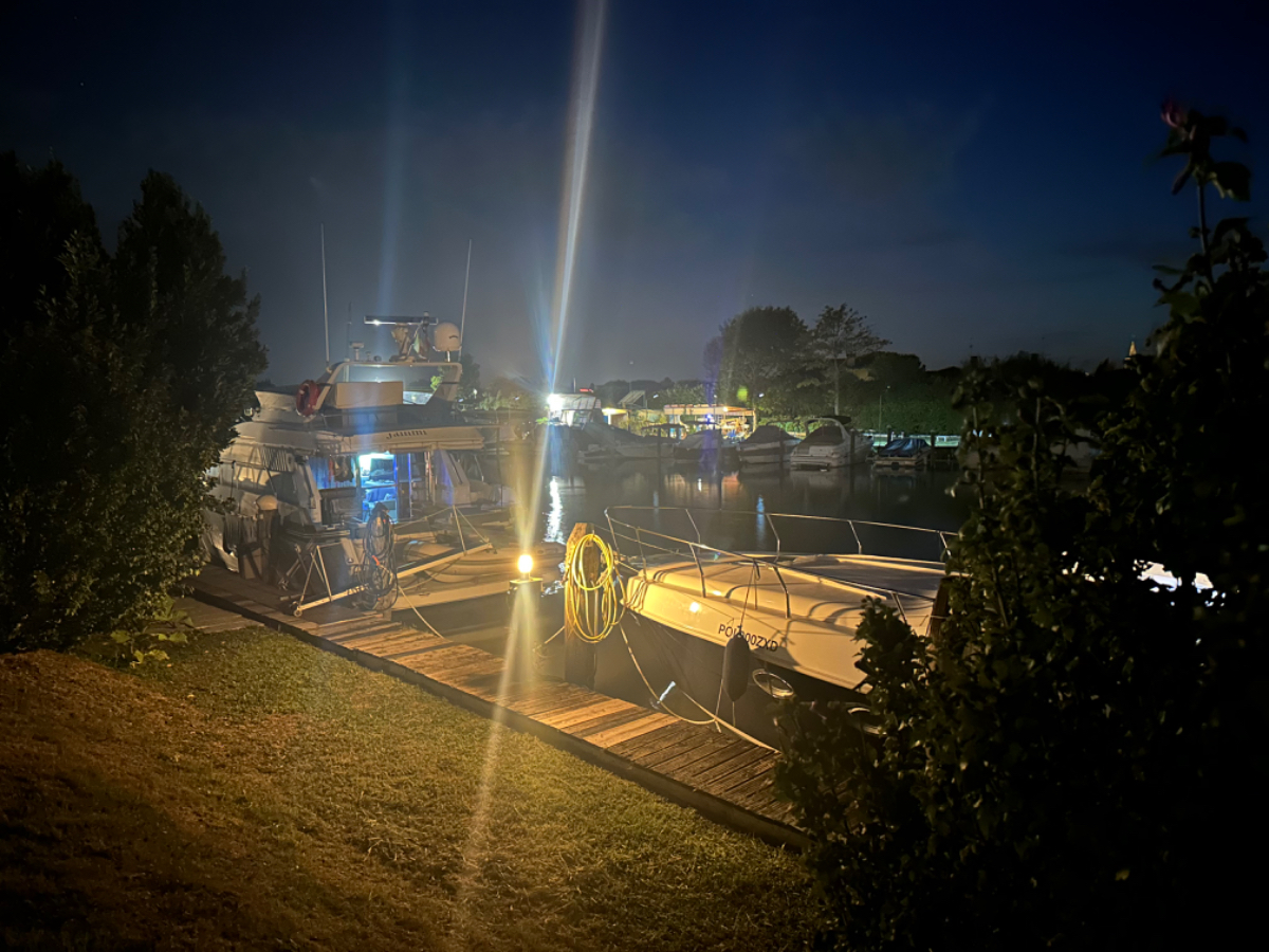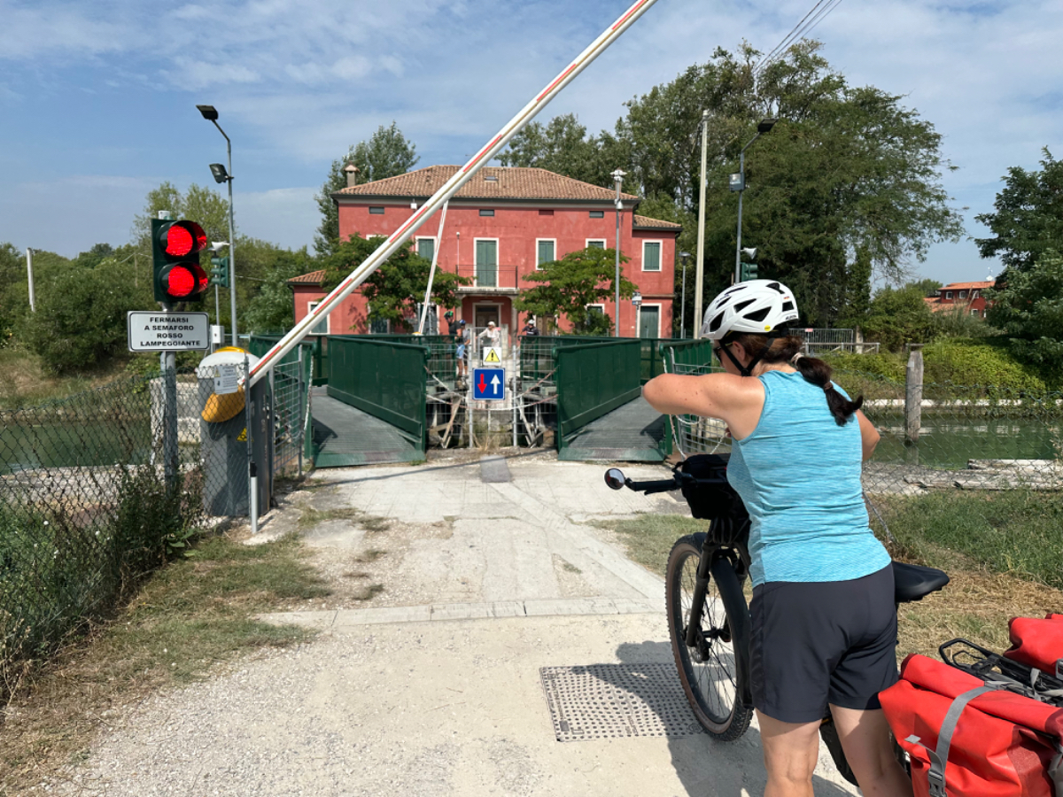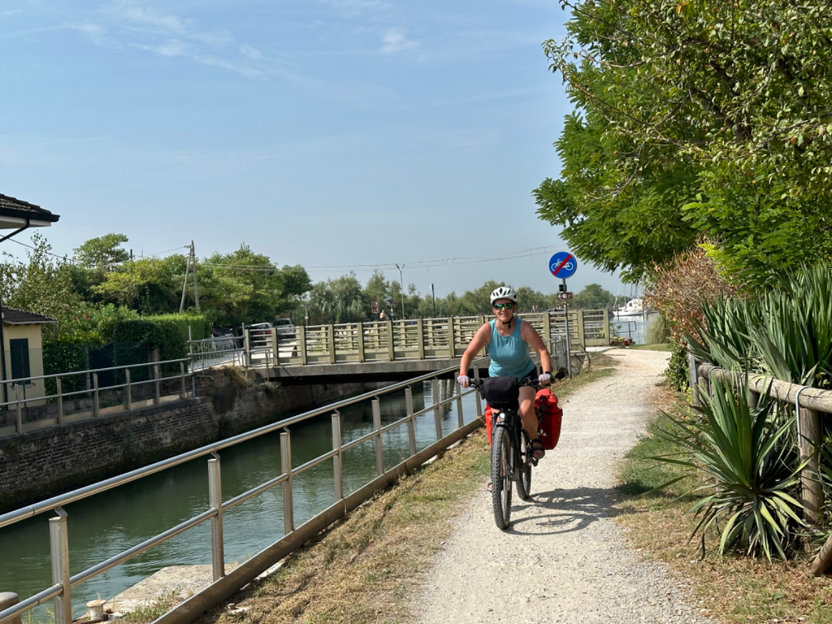 Venedig am Morgen beginnt wie der gestrige Tag geendet hat. Touristen und Einheimische am Weg zur Arbeit strömen vom Bahnhof bzw. Busterminal in Richtung Innenstadt, nur in der Nacht war es meist in umgekehrter Richtung. Jedenfalls ist um halb acht Uhr rege Betriebsamkeit, und wir nach einem Quickie (Frühstück) bereits wieder mitten drin. Im Bici Park wieder mal Verständnisschwierigkeiten, aber alles löst sich in Wohlgefallen, nur dass ich bereits um diese Zeit schon das erste mal durchschwitzt bin. Heute fahren wir mit der Fähre nach Punta Sabbioni, die Tickets haben wir bereits gestern gekauft, so erreichen wir früher als erwartet den Hafen und erreichen die Fähre um 8:20, voll Zeit gespart, weil Riki immer so drängelt ;-) In St.Nicolai (oder so ähnlich) sollen wir das Schiff wechseln, sprich umsteigen. Nur erfahren wir erst dort nach Nachfrage, dass es heute von diese Port keine Fähre nach Punta Sabbioni gibt, aber man verweist uns an eine nahegelegene Anlegestelle. Dort fährt eine Fähre, aber diese ist nicht wirklich für Radfahrer ausgelegt, speziell solche mit breitem Gepäck. Man heißt uns nicht gerade herzlich willkommen. Seí´s drum, wir erreichen unser Ziel und steigen in die Sättel. Es folgt bis Cavallino eine Fahrt auf herrlichen Radwegen, immer durch die Lagune oder entlang eines Flusses oder Kanals. In Cavallino machen wir eine erste Trinkpause in einer netten Bar, es ist heute diesig bewölkt, nicht zu heiß aber sehr schwül - trinken, trinken ist angesagt! Weiter geht es im Hinterland von Jesolo, die Skyline vom Lido ist nur in der Ferne zu erkennen, zum Glück müssen wir dort nicht hin. Es folgen kilometerlange Geraden, man wünscht sich wenigstens mal eine Kurve, aber es geht nur geradeaus, kein Ende in Sicht. Ein Schild am Straßenrand weist darauf hin, wir befinden uns nun im Reisland. Rechts der Strasse der Kanal, links über Kilometer eine Pappelallee, und dahinter endlose sattgrüne Reisfelder. Eine willkommene Abwechslung, darüber nachzusinnen, dass Reis nicht nur aus China kommt. Und bald darauf ist auch schon das heutige Tagesziel erreicht, Brian :-) Unser Quartier liegt am Zusammenfluss zweier Kanäle, hier ist auch der Liegeplatz/Marina einiger schöner Boote, 300.000 € aufwärts. Es gibt zwei großzügige Pools hier, und nach dem dringend notwendigen Wäschewaschen, verbringen wir den ganzen restlichen Tag am und im Pool, denn mittlerweile haben sich alle Wolken verzogen, und es ist wieder HOT as usual. Ich hoffe es bleibt so, doch der Wetterbericht verheißt für morgen leider Regen. Auch ok, solange es keine Unwetter gibt :-)