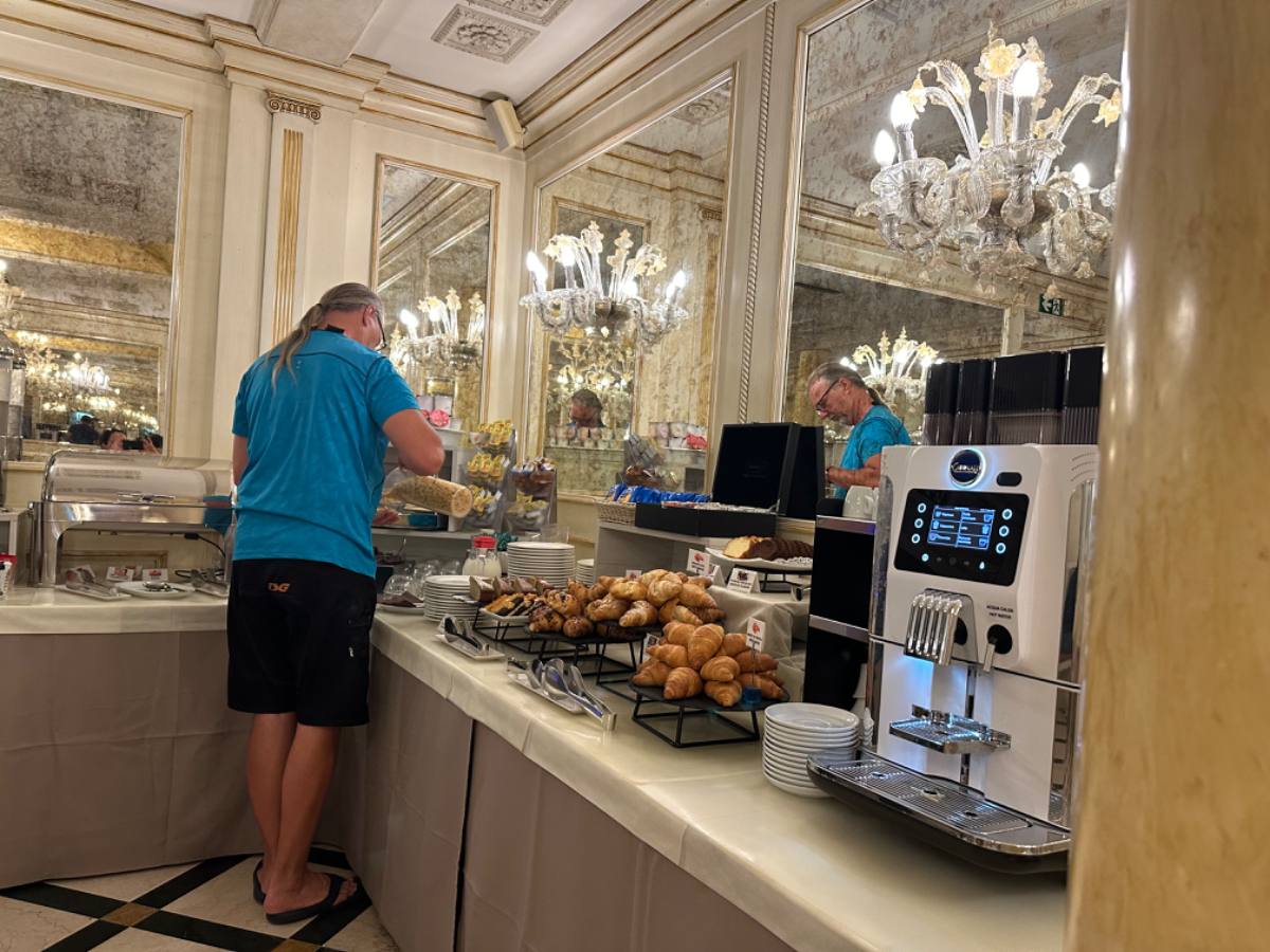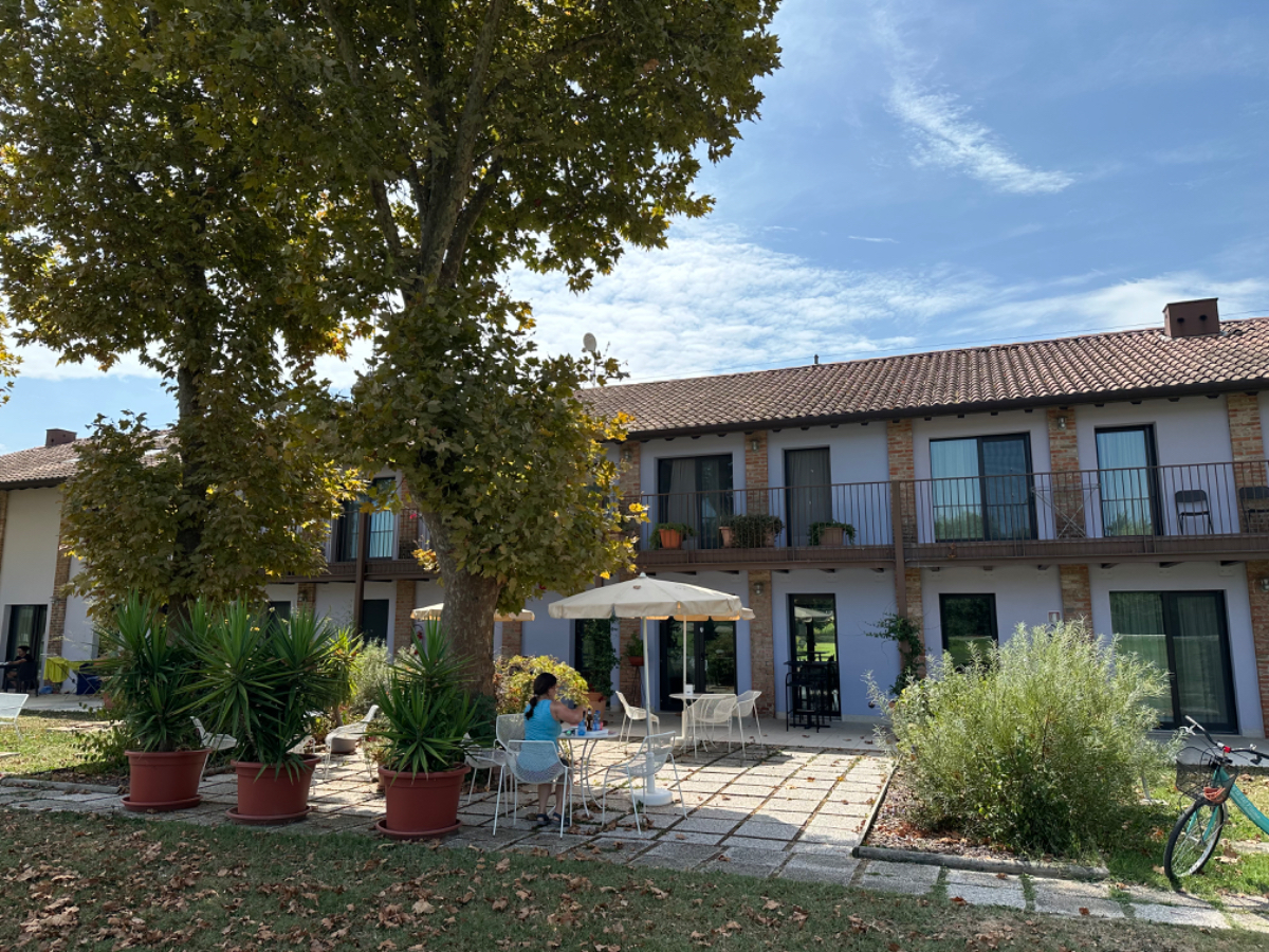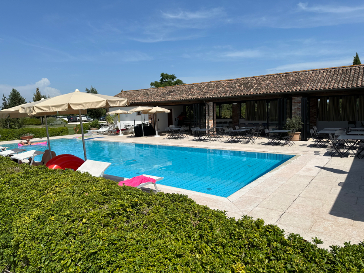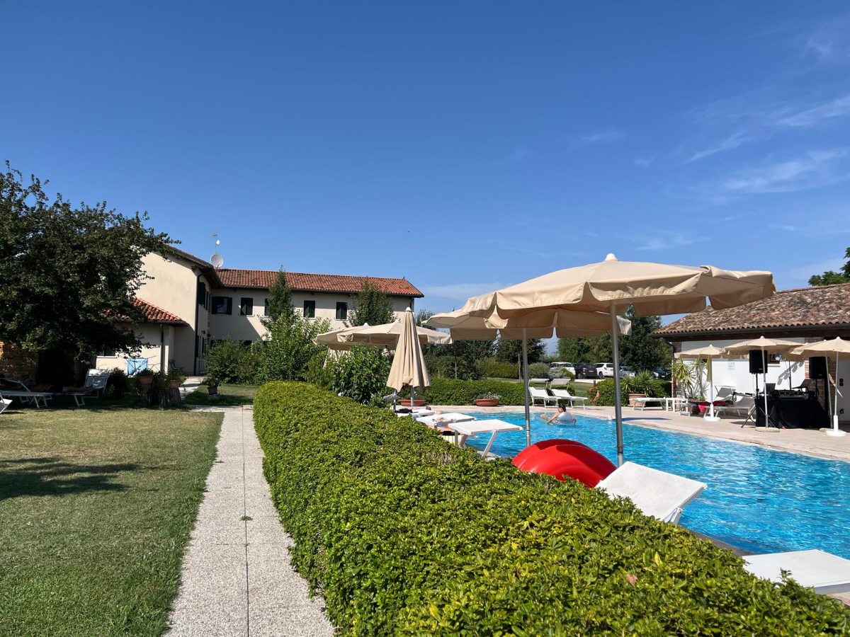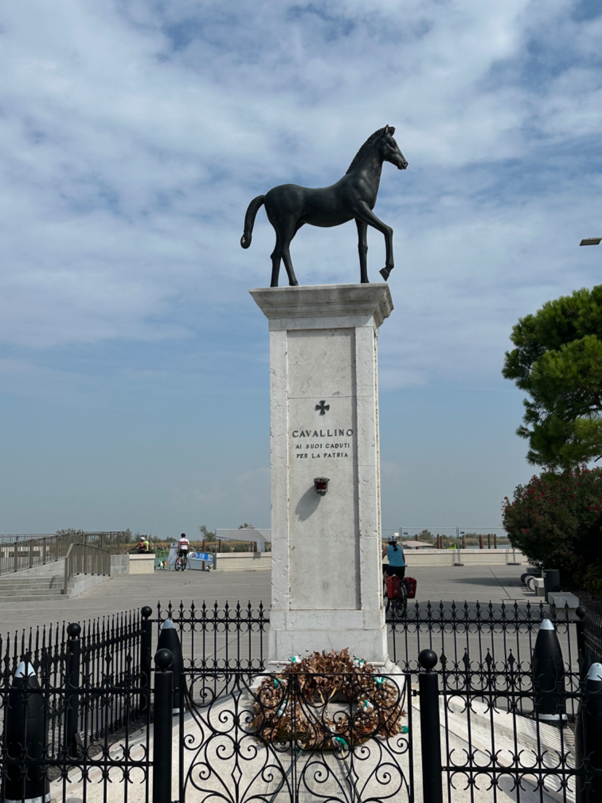 Venedig am Morgen beginnt wie der gestrige Tag geendet hat. Touristen und Einheimische am Weg zur Arbeit strömen vom Bahnhof bzw. Busterminal in Richtung Innenstadt, nur in der Nacht war es meist in umgekehrter Richtung. Jedenfalls ist um halb acht Uhr rege Betriebsamkeit, und wir nach einem Quickie (Frühstück) bereits wieder mitten drin. Im Bici Park wieder mal Verständnisschwierigkeiten, aber alles löst sich in Wohlgefallen, nur dass ich bereits um diese Zeit schon das erste mal durchschwitzt bin. Heute fahren wir mit der Fähre nach Punta Sabbioni, die Tickets haben wir bereits gestern gekauft, so erreichen wir früher als erwartet den Hafen und erreichen die Fähre um 8:20, voll Zeit gespart, weil Riki immer so drängelt ;-) In St.Nicolai (oder so ähnlich) sollen wir das Schiff wechseln, sprich umsteigen. Nur erfahren wir erst dort nach Nachfrage, dass es heute von diese Port keine Fähre nach Punta Sabbioni gibt, aber man verweist uns an eine nahegelegene Anlegestelle. Dort fährt eine Fähre, aber diese ist nicht wirklich für Radfahrer ausgelegt, speziell solche mit breitem Gepäck. Man heißt uns nicht gerade herzlich willkommen. Seí´s drum, wir erreichen unser Ziel und steigen in die Sättel. Es folgt bis Cavallino eine Fahrt auf herrlichen Radwegen, immer durch die Lagune oder entlang eines Flusses oder Kanals. In Cavallino machen wir eine erste Trinkpause in einer netten Bar, es ist heute diesig bewölkt, nicht zu heiß aber sehr schwül - trinken, trinken ist angesagt! Weiter geht es im Hinterland von Jesolo, die Skyline vom Lido ist nur in der Ferne zu erkennen, zum Glück müssen wir dort nicht hin. Es folgen kilometerlange Geraden, man wünscht sich wenigstens mal eine Kurve, aber es geht nur geradeaus, kein Ende in Sicht. Ein Schild am Straßenrand weist darauf hin, wir befinden uns nun im Reisland. Rechts der Strasse der Kanal, links über Kilometer eine Pappelallee, und dahinter endlose sattgrüne Reisfelder. Eine willkommene Abwechslung, darüber nachzusinnen, dass Reis nicht nur aus China kommt. Und bald darauf ist auch schon das heutige Tagesziel erreicht, Brian :-) Unser Quartier liegt am Zusammenfluss zweier Kanäle, hier ist auch der Liegeplatz/Marina einiger schöner Boote, 300.000 € aufwärts. Es gibt zwei großzügige Pools hier, und nach dem dringend notwendigen Wäschewaschen, verbringen wir den ganzen restlichen Tag am und im Pool, denn mittlerweile haben sich alle Wolken verzogen, und es ist wieder HOT as usual. Ich hoffe es bleibt so, doch der Wetterbericht verheißt für morgen leider Regen. Auch ok, solange es keine Unwetter gibt :-)