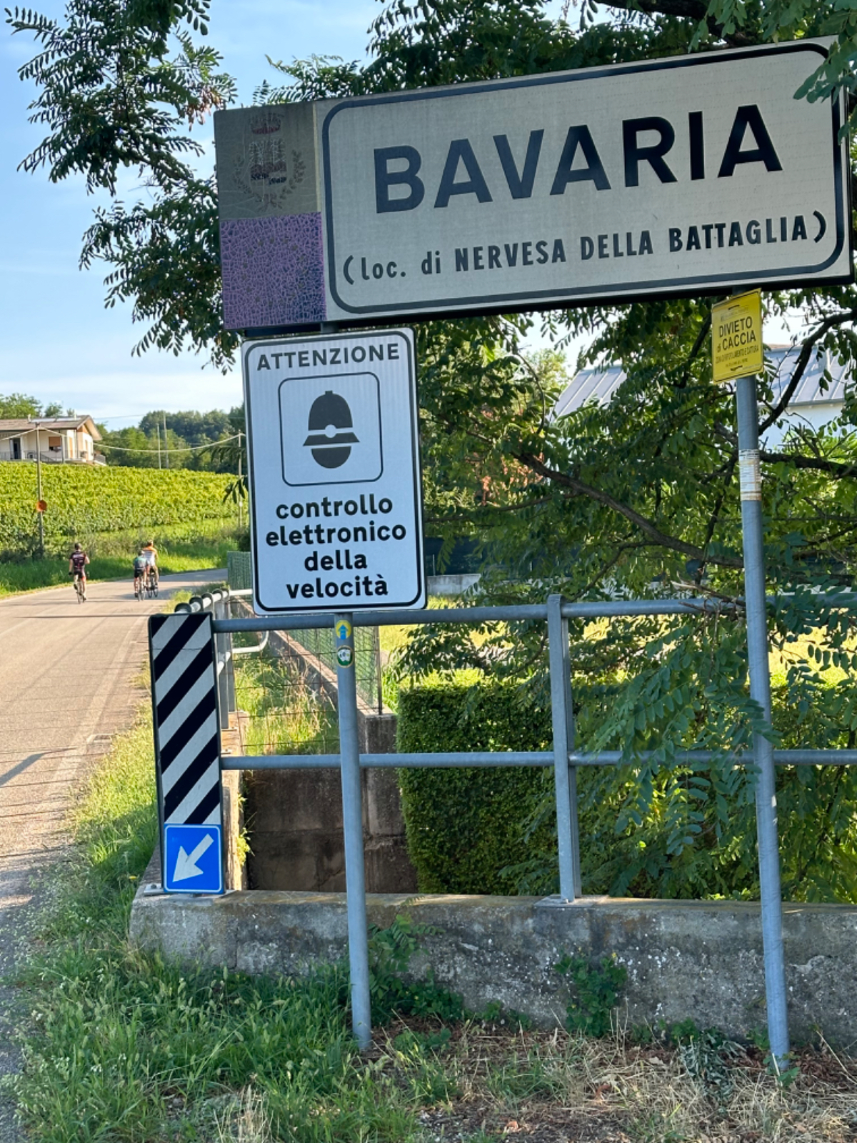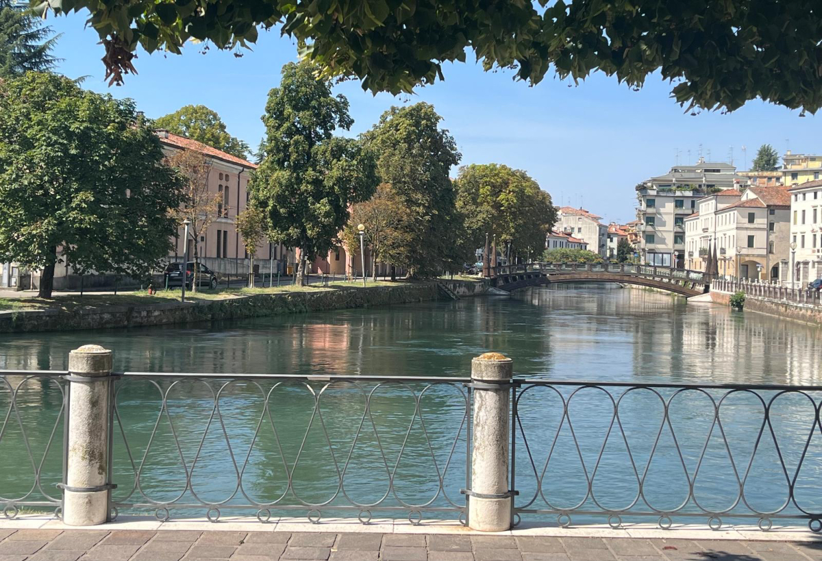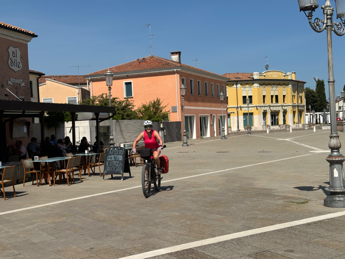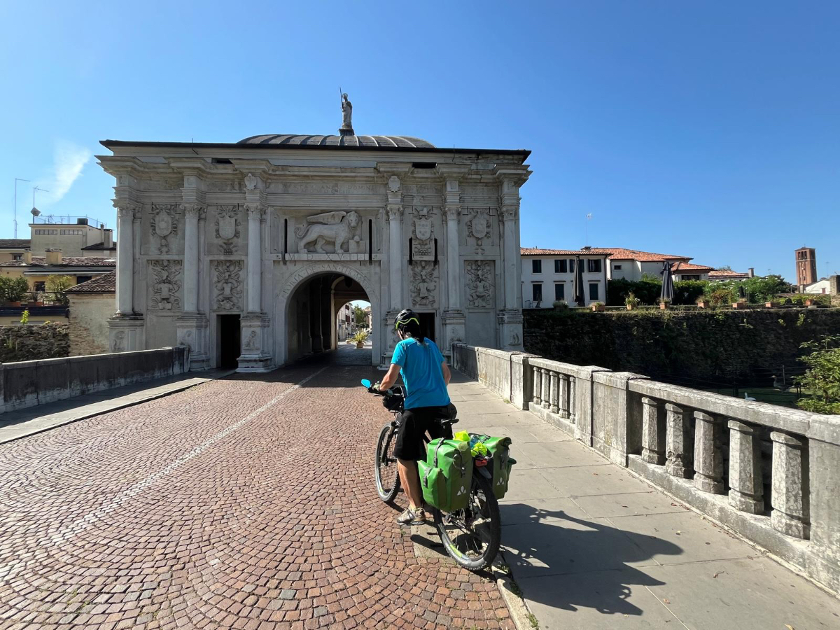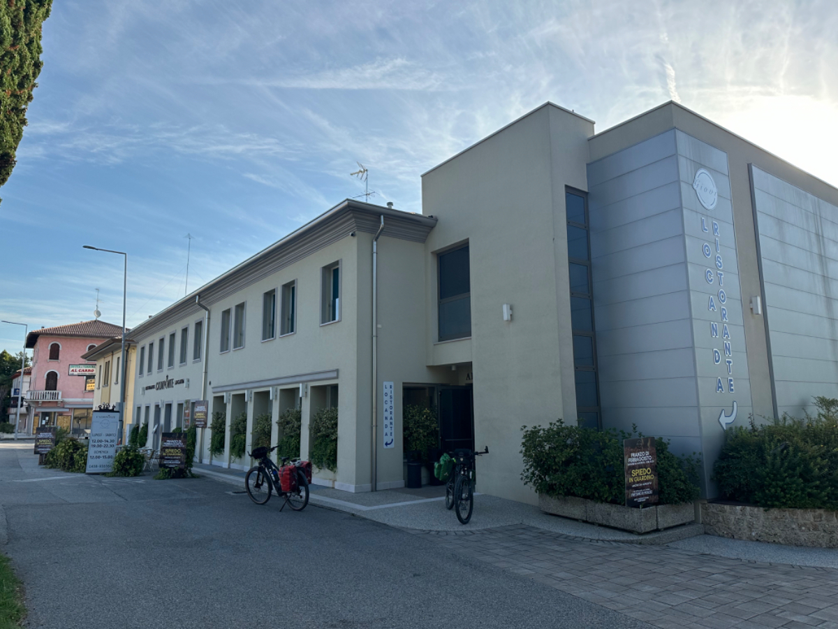 In unserem Hotel fand gestern quasi eine Pre Ferragosto Party statt, ein DJ spielte schreckliche Techno Musik, direkt unter unserem Fenster. Dazu röhrte unsere Klimaanlage wie ein Helikopter - bis ich den Strom abschaltete. Dafür wars dann im Zimmer ziemlich warm die Nacht über, haben aber nach den Anstrengungen des Tages trotzdem gut geschlafen. Nach einem ausgiebigen Frühstück haben wir uns um 8:15 auf die Räder geschwungen und die heutige kurze Etappe von 68 km in Angriff genommen. Es geht über beinahe leere Straßen durch die Dörfer, einige Hügel rauf und wieder hinunter, dann lassen wir die Berge endgültig hinter uns. Ab jetzt gehts durch die Ebene, es sind - wie in Italien an Sonntagen oder Feiertagen üblich - wesentlich mehr Radfahrer als Autos auf der Strasse. Wir kommen sehr gut voran, und nach zwei Stunden und 43km erreichen wir Treviso.