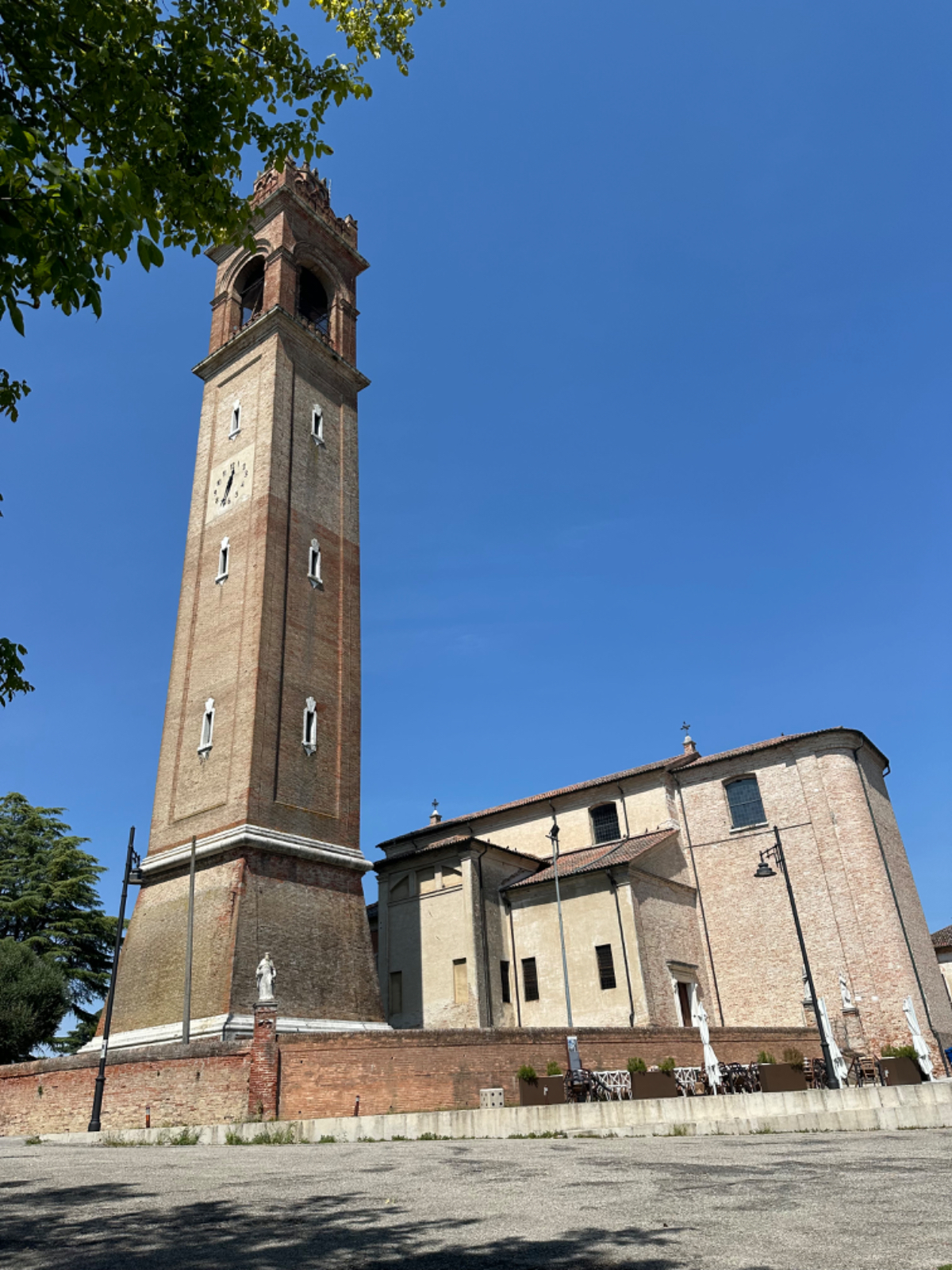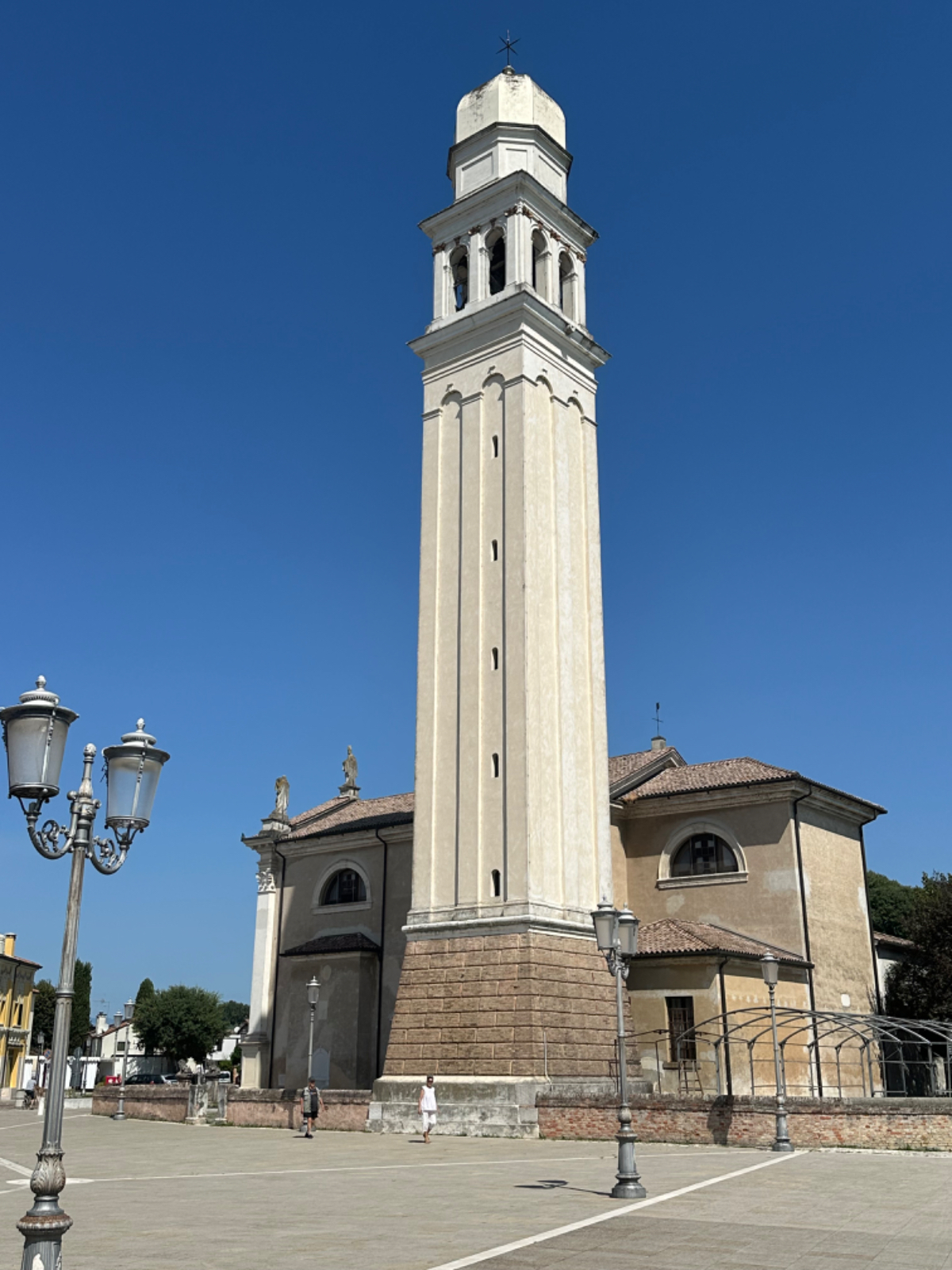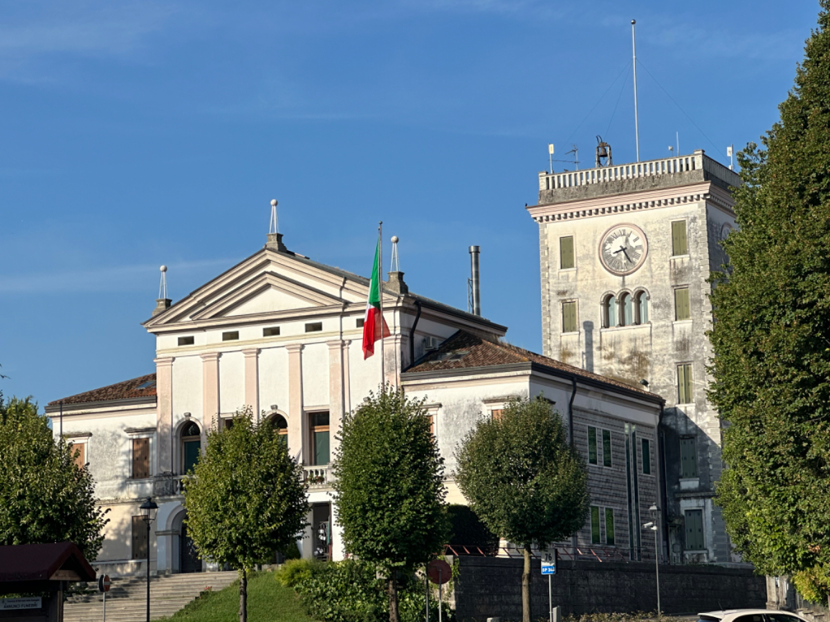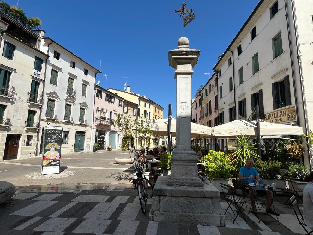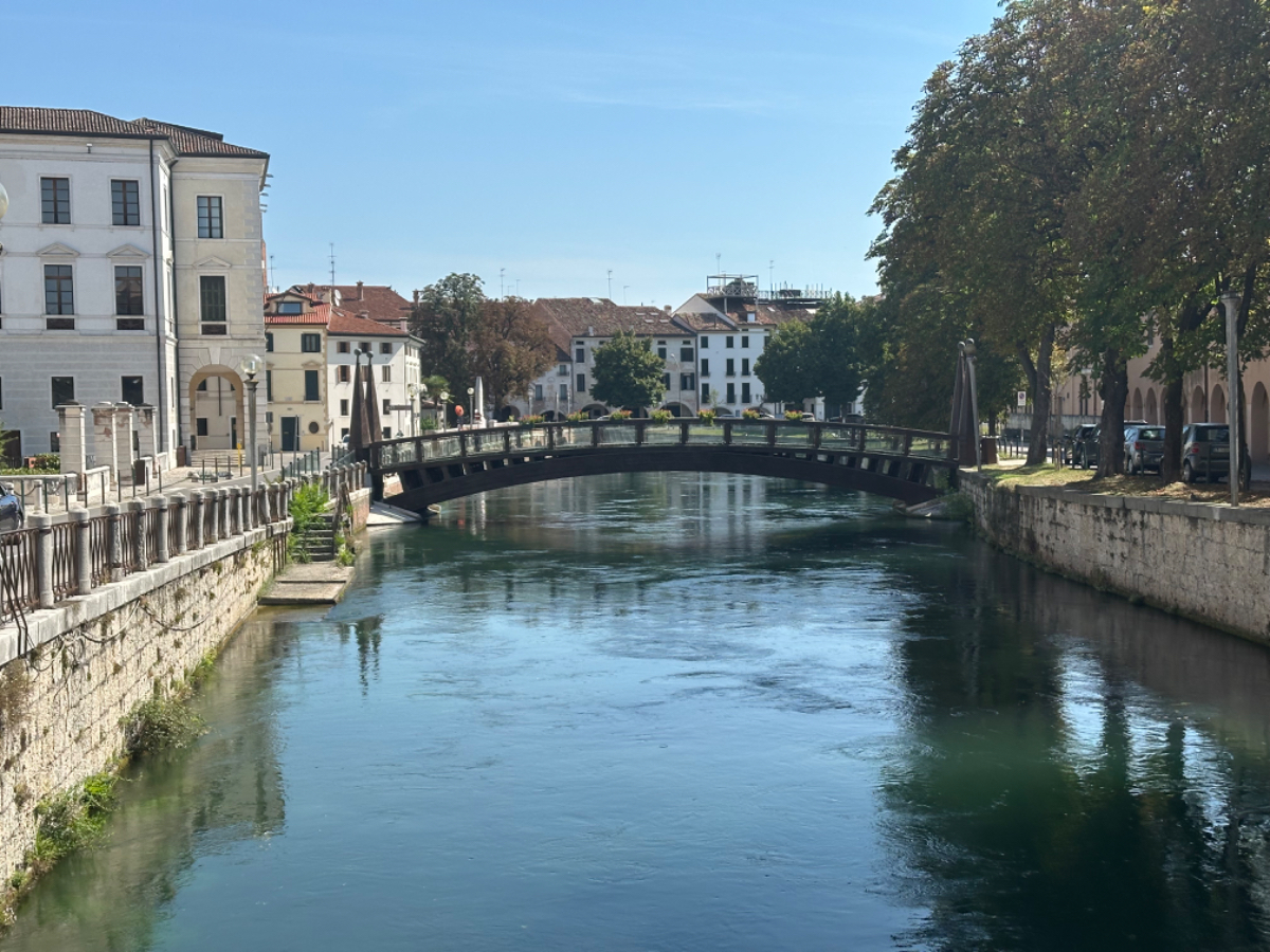 In unserem Hotel fand gestern quasi eine Pre Ferragosto Party statt, ein DJ spielte schreckliche Techno Musik, direkt unter unserem Fenster. Dazu röhrte unsere Klimaanlage wie ein Helikopter - bis ich den Strom abschaltete. Dafür wars dann im Zimmer ziemlich warm die Nacht über, haben aber nach den Anstrengungen des Tages trotzdem gut geschlafen. Nach einem ausgiebigen Frühstück haben wir uns um 8:15 auf die Räder geschwungen und die heutige kurze Etappe von 68 km in Angriff genommen. Es geht über beinahe leere Straßen durch die Dörfer, einige Hügel rauf und wieder hinunter, dann lassen wir die Berge endgültig hinter uns. Ab jetzt gehts durch die Ebene, es sind - wie in Italien an Sonntagen oder Feiertagen üblich - wesentlich mehr Radfahrer als Autos auf der Strasse. Wir kommen sehr gut voran, und nach zwei Stunden und 43km erreichen wir Treviso.