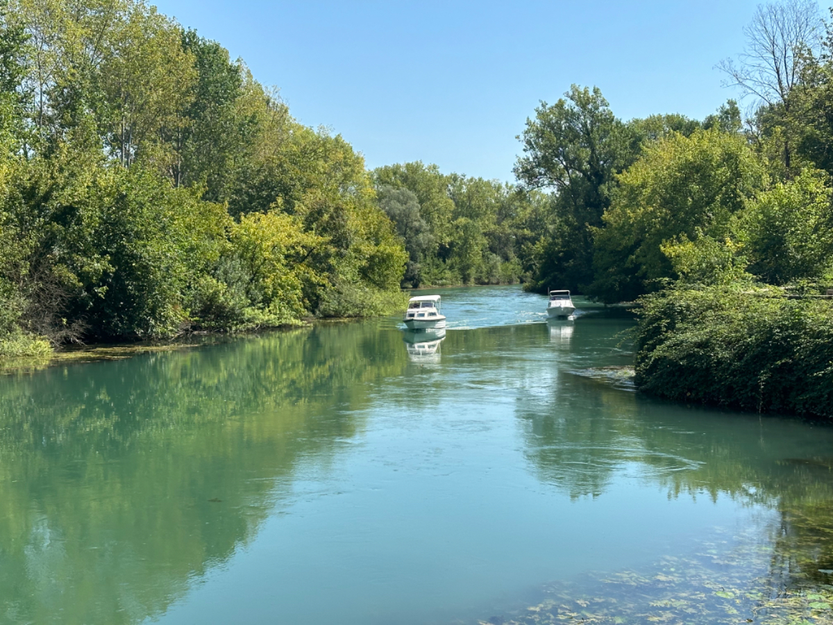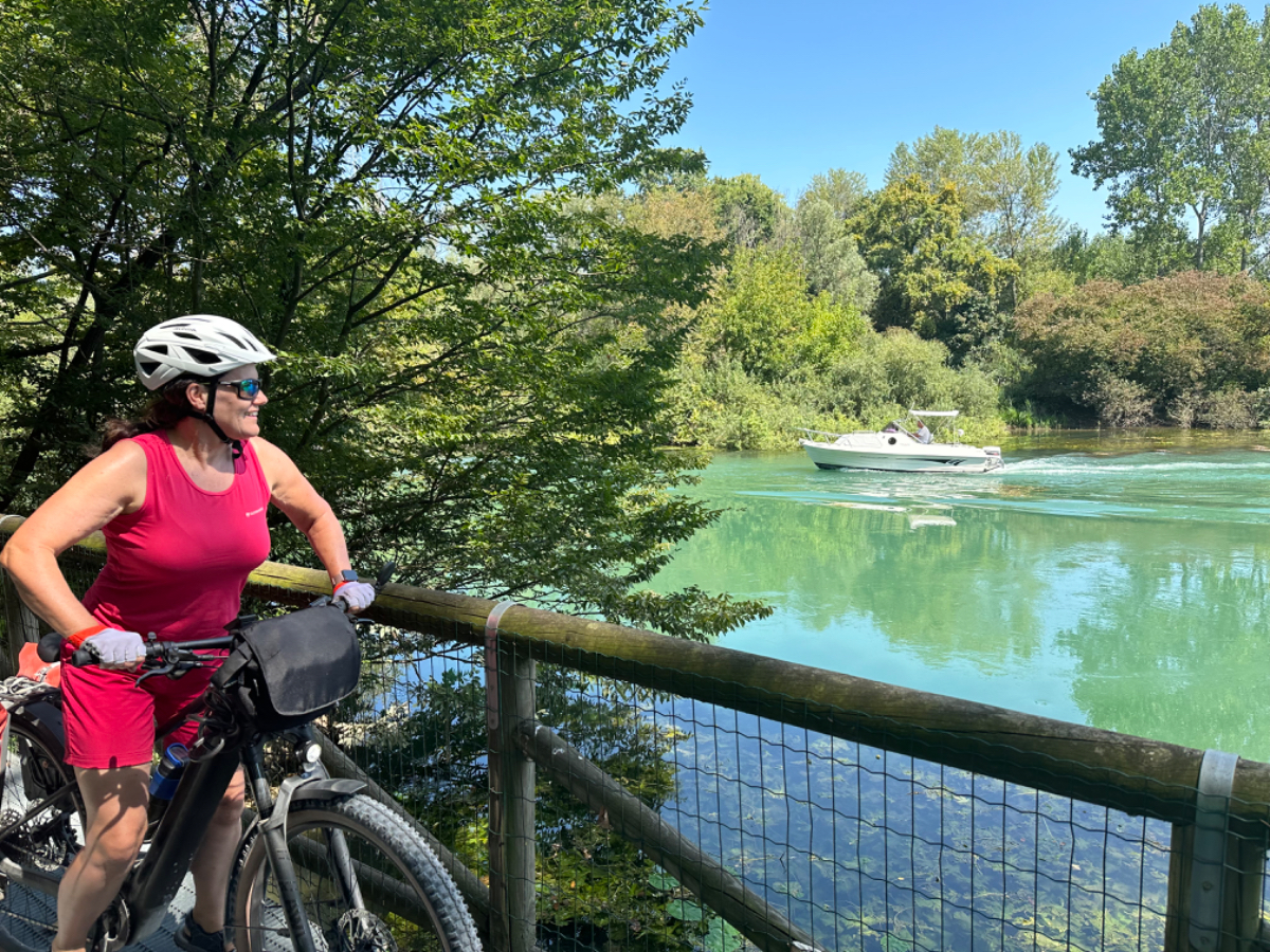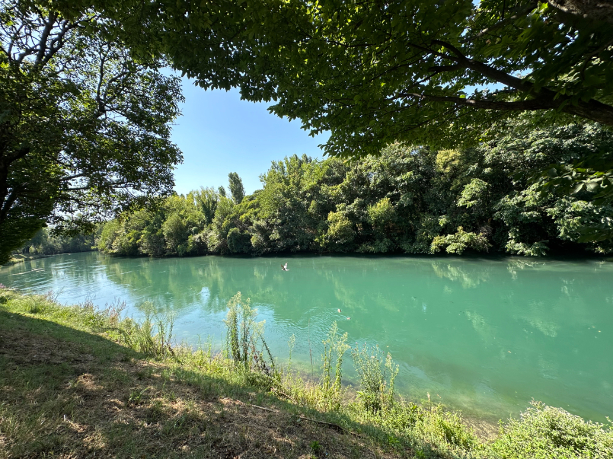 Aus Treviso raus folgen wir dem Fluß Sile, größtenteils bis zu unserem heutigen Ziel. Wir durchqueren ein Naturschutzgebiet entlang des Sile, schattige Wege, Stege und Brücken und nach jeder Flußbiegung eröffnet sich uns ein schönerer Anblick als zuvor. Hier werde ich mal - natürlich mit Riki - mit einem Hausboot hochfahren :-) Um 13 Uhr erreichen wir unser Quartier, ein schönes Hotel, eingebettet in einen großen Park, sehr cool! Wir sind zu früh, also gehen wir zuerst auf ein Ankommensbier. Dem jungen Kellner passiert ein Missgeschick, er zerbricht ein Glas und gießt den Inhalt über den Tisch und auch Rikis Shirt stinkt danach nach Bier. Das Gute daran, wir mussten unsere Zeche nicht bezahlen. (Danke Bernd für die Einladung, wir kommen gerne in ein nächsten Tagen darauf zurück :-) Nachdem heute ein Feiertag ist, hat so gut wie kein Lokal um die Mittagszeit geöffnet, aber wieder Glück gehabt, in einer Bar essen wir schmackhafte Spaghetti - und bezahlen für zwei Portionen und ein Liter Mineralwasser 15 Euro :-) Den restlichen Tag verbringen wir bis zum Abend am hoteleigenen Pool, der mitten im Park liegt, bei angenehmen 34 Grad, mit Campari und Aperol Spritz, WHAT A DAY! :-) Und morgen Venezia……